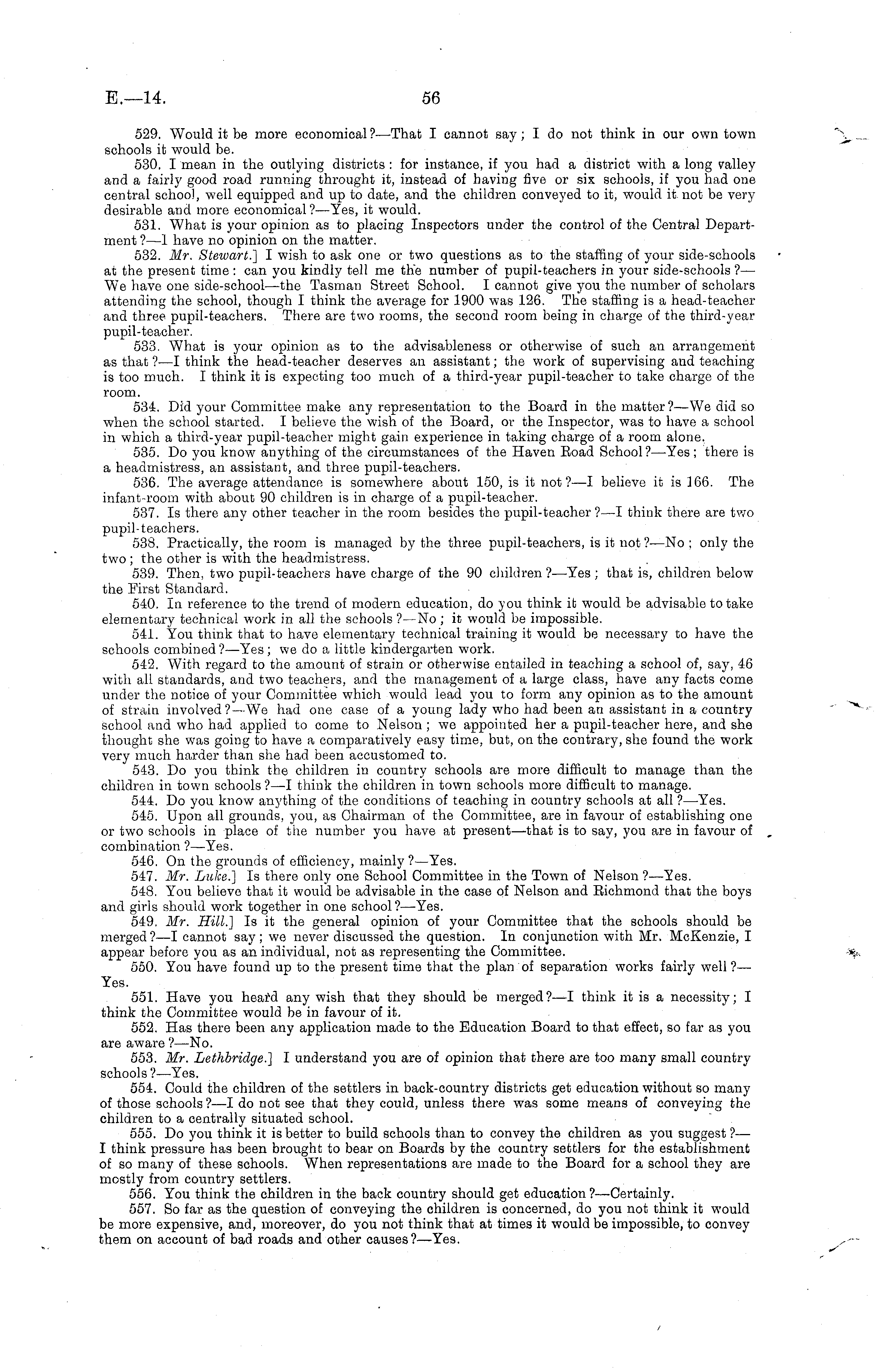 529. Would it be more economical ?—That I cannot say; I do not think in our own town schools it would be. 530. I mean in the outlying districts : for instance, if you had a district with a long valley and a fairly good road running throught it, instead of having five or six schools, if you had one central school, well equipped and up to date, and the children conveyed to it, would it not be very desirable and more economical? —Yes, it would. 531. What is your opinion as to placing Inspectors under the control of the Central Department ? —I have no opinion on the matter. 532. Mr. Stewart.] I wish to ask one or two questions as to the staffing of your side-schools at the present time : can you kindly tell me the number of pupil-teachers in your side-schools ?— We have one side-school—the Tasman Street School. I cannot give you the number of scholars attending the school, though I think the average for 1900 was 126. The staffing is a head-teacher and three pupil-teachers. There are two rooms, the second room being in charge of the third-year pupil-teacher. 533. What is your opinion as to the advisableness or otherwise of such an arrangement as that ? —I think the head-teacher deserves an assistant; the work of supervising and teaching is too much. I think it is expecting too much of a third-year pupil-teacher to take charge of the room. 534. Did your Committee make any representation to the Board in the matter ? —We did so when the school started. I believe the wish of the Board, or the Inspector, was to have a school in which a third-year pupil-teacher might gain experience in taking charge of a room alone. 535. Do you know anything of the circumstances of the Haven Boad School? —Yes; there is a headmistress, an assistant, and three pupil-teachers. 536. The average attendance is somewhere about 150, is it not? —I believe it is 166. The infant-room with about 90 children is in charge of a pupil-teacher. 537. Is there any other teacher in the room besides the pupil-teacher ?—I think there are two pupil-teachers. 538. Practically, the room is managed by the three pupil-teachers, is it not ?—No ; only the two; the other is with the headmistress. 539. Then, two pupil-teachers have charge of the 90 children ? —Yes ; that is, children below the First Standard. 540. In reference to the trend of modern education, do you think it would be advisable to take elementary technical work in all the schools ? —No ; it would be impossible. 541. You think that to have elementary technical training it would be necessary to have the schools combined ?—Yes ; we do a little kindergarten work. 542. With regard to the amount of strain or otherwise entailed in teaching a school of, say, 46 with all standards, and two teachers, and the management of a large class, have any facts come under the notice of your Committee which would lead you to form any opinion as to the amount of strain involved?—We had one case of a young lady who had been an assistant in a country school and who had applied to come to Nelson ; we appointed her a pupil-teacher here, and she thought she was going to have a comparatively easy time, but, on the contrary, she found the work very much harder than she had been accustomed to. 543. Do you think the children in country schools are more difficult to manage than the children in town schools ?—I think the children in town schools more difficult to manage. 544. Do you know anything of the conditions of teaching in country schools at all ?—Yes. 545. Upon all grounds, you, as Chairman of the Committee, are in favour of establishing one or two schools in place of the number you have at present —that is to say, you are in favour of combination ? —Yes. 546. On the grounds of efficiency, mainly ?—Yes. 547. Mr. Luke.] Is there only one School Committee in the Town of Nelson?— Yes. 548. You believe that it would be advisable in the case of Nelson and Bichmond that the boys and girls should work together in one school? —Yes. 549. Mr. Hill.] Is it the general opinion of your Committee that the schools should be merged ?—I cannot say ;we never discussed the question. In conjunction with Mr. McKenzie, I appear before you as an individual, not as representing the Committee. 550. You have found up to the present time that the plan of separation works fairly well ?— Yes. 551. Have you heard any wish that they should be merged?—l think it is a necessity; I think the Committee would be in favour of it. 552. Has there been any application made to the Education Board to that effect, so far as you are aware ?—No. 553. Mr. Lethbridge.] I understand you are of opinion that there are too many small country schools?— Yes. 554. Could the children of the settlers in back-country districts get education without so many of those schools ?—I do not see that they could, unless there was some means of conveying the children to a centrally situated school. 555. Do you think it is better to build schools than to convey the children as you suggest ?— I think pressure has been brought to bear on Boards by the country settlers for the establishment of so many of these schools. When representations are made to the Board for a school they are mostly from country settlers. 556. You think the children in the back country should get education ? —Certainly. 557. So far as the question of conveying the children is concerned, do you not think it would be more expensive, and, moreover, do you not think that at times it would be impossible, to convey them on account of bad roads and other causes?— Yes.