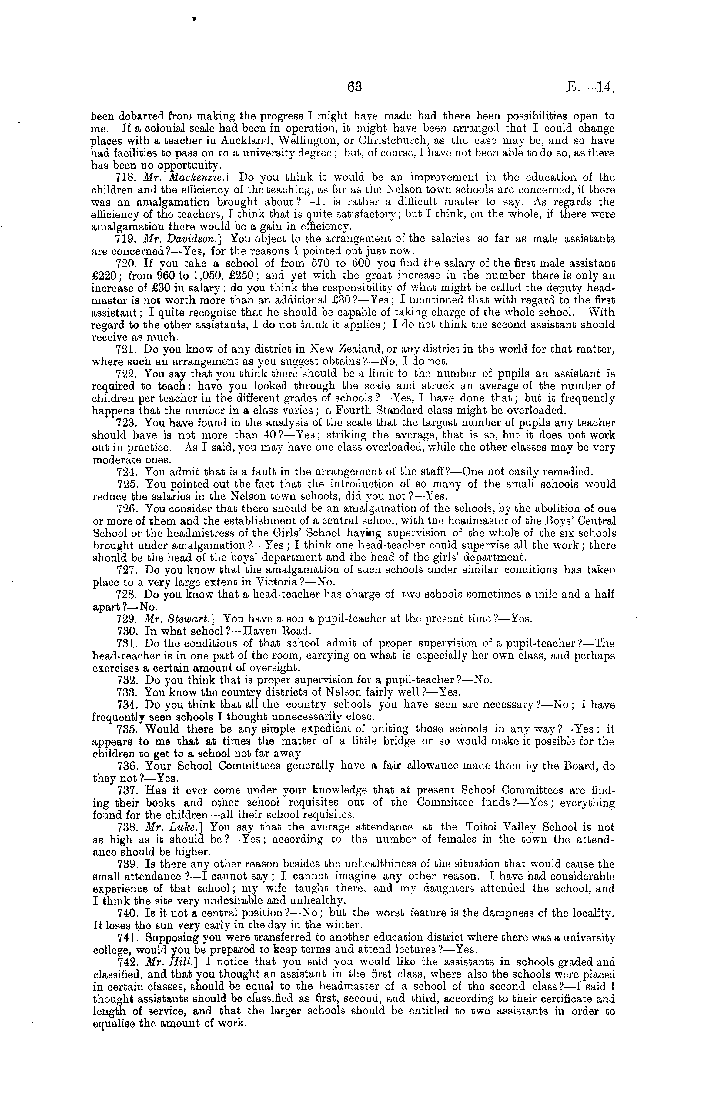 been debarred from making the progress I might have made had there been possibilities open to me. If a colonial scale had been in operation, it might have been arranged that I could change places with a teacher in Auckland, Wellington, or Christchurch, as the case may be, and so have had facilities to pass on to a university degree ; but, of course, I have not been able to do so, as there has been no opportuuity. 718. Mr. Mackenzie.] Do you think it would be an improvement in the education of the children and the efficiency of the teaching, as far as the Nelson town schools are concerned, if there was an amalgamation brought about ? —It is rather a difficult matter to say. As regards the efficiency of the teachers, I think that is quite satisfactory; but I think, on the whole, if there were amalgamation there would be a gain in efficiency. 719. Mr. Davidson.] You object to the arrangement of the salaries so far as male assistants are concerned?— Yes, for the reasons I pointed out just now. 720. If you take a school of from 570 to 600 you find the salary of the first male assistant £220; from 960 to 1,050, £250; and yet with the great increase in the number there is only an increase of £30 in salary: do you think the responsibility of what might be called the deputy headmaster is not worth more than an additional £30?— Yes; I mentioned that with regard to the first assistant; I quite recognise that he should be capable of taking charge of the whole school. With regard to the other assistants, Ido not think it applies; Ido not think the second assistant should receive as much. 721. Do you know of any district in New Zealand, or any district in the world for that matter, where such an arrangement as you suggest obtains ?—No, I do not. 722. You say that you think there should be a limit to the number of pupils an assistant is required to teach : have you looked through the scale and struck an average of the number of children per teacher in the different grades of schools ?—Yes, I have done that; but it frequently happens that the number in a class varies; a Fourth Standard class might be overloaded. 723. You have found in the analysis of the scale that the largest number of pupils any teacher should have is not more than 40 ?—Yes; striking the average, that is so, but it does not work out in practice. As I said, you may have one class overloaded, while the other classes may be very moderate ones. 724. You admit that is a fault in the arrangement of the staff?— One not easily remedied. 725. You pointed out the fact that the introduction of so many of the small schools would reduce the salaries in the Nelson town schools, did you not ? —Yes. 726. You consider that there should be an amalgamation of the schools, by the abolition of one or more of them and the establishment of a central school, with the headmaster of the Boys' Central School or the headmistress of the Girls' School having supervision of the whole of the six schools brought under amalgamation?— Yes ; I think one head-teacher could supervise all the work; there should be the head of the boys' department and the head of the girls' department. 727. Do you know that the amalgamation of such schools under similar conditions has taken place to a very large extent in Victoria? —No. 728. Do you know that a head-teacher has charge of two schools sometimes a mile and a half apart?— No. 729. Mr. Stewart.] You have a son a pupil-teacher at the present time ?—Yes. 730. In what school ?—Haven Boad. 731. Do the conditions of that school admit of proper supervision of a pupil-teacher?— The head-teacher is in one part of the room, carrying on what is especially her own class, and perhaps exercises a certain amount of oversight. 732. Do you think that is proper supervision for a pupil-teacher?—-No. 733. You know the country districts of Nelson fairly well ?—Yes. 734. Do you think that all the country schools you have seen are necessary?—No; 1 have frequently seen schools I thought unnecessarily close. 735. Would there be any simple expedient of uniting those schools in anyway?— Yes; it appears to me that at times the matter of a little bridge or so would make it possible for the children to get to a school not far away. 736. Your School Committees generally have a fair allowance made them by the Board, do they not ?—Yes. 737. Has it ever come under your knowledge that at present School Committees are finding their books and other school requisites out of the Committee funds ? —Yes; everything found for the children—all their school requisites. 738. Mr. Luke.] You say that the average attendance at the Toitoi Valley School is not as high as it should be ?—Yes; according to the number of females in the town the attendance should be higher. 739. Is there any other reason besides the unhealthiness of the situation that would cause the small attendance ?—-I cannot say ; I cannot imagine any other reason. I have had considerable experience of that school; my wife taught there, and my daughters attended the school, and I think the site very undesirable and unhealthy. 740. Is it not a central position ?—No; but the worst feature is the dampness of the locality. It loses the sun very early in the day in the winter. 741. Supposing you were transferred to another education district where there was a university college, would you be prepared to keep terms and attend lectures ?—Yes. 742. Mr. Hill.] I notice that you said you would like the assistants in schools graded and classified, and that you thought an assistant in the first class, where also the schools were placed in certain classes, should be equal to the headmaster of a school of the second class ?—I said I thought assistants should be classified as first, second, and third, according to their certificate and length of service, and that the larger schools should be entitled to two assistants in order to equalise the amount of work.
