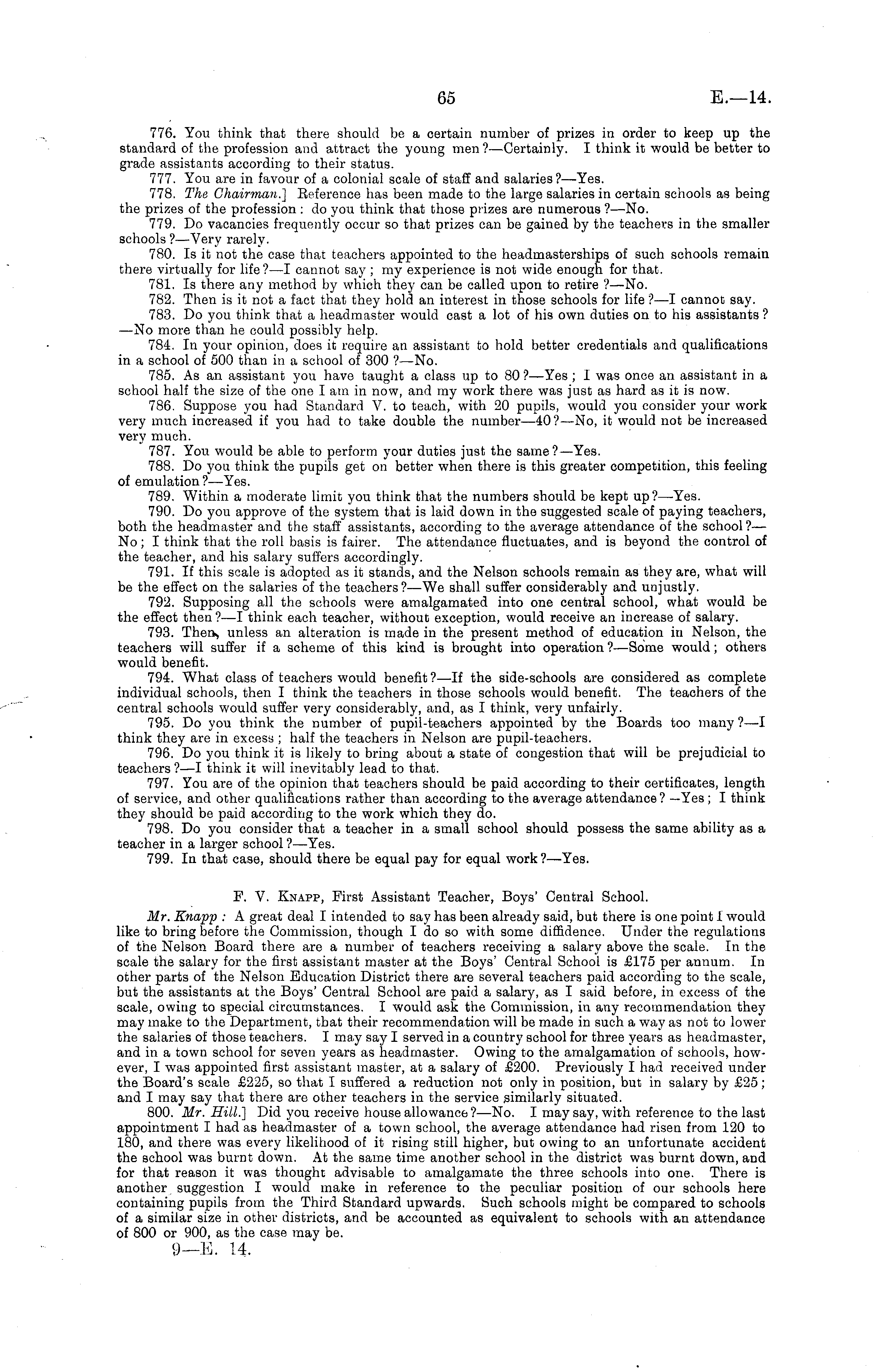 776. You think that there should be a certain number of prizes in order to keep up the standard of the profession and attract the young men ?—Certainly. I think it would be better to grade assistants according to their status. 777. You are in favour of a colonial scale of staff and salaries?—-Yes. 778. The Chairman.] Beference has been made to the large salaries in certain schools as being the prizes of the profession : do you think that those prizes are numerous ?—No. 779. Do vacancies frequently occur so that prizes can be gained by the teachers in the smaller schools ? —Very rarely. 780. Is it not the case that teachers appointed to the headmasterships of such schools remain there virtually for life?—l cannot say ;my experience is not wide enough for that. 781. Is there any method by which they can be called upon to retire ?—No. 782. Then is it not a fact that they hold an interest in those schools for life ? —I cannot say. 783. Do you think that a headmaster would cast a lot of his own duties on to his assistants ? —No more than he could possibly help. 784. In your opinion, does it require an assistant to hold better credentials and qualifications in a school of 500 than in a school of 300 ? —No. 785. As an assistant you have taught a class up to 80?— Yes ; I was once an assistant in a school half the size of the one I am in now, and my work there was just as hard as it is now. 786. Suppose you had Standard V. to teach, with 20 pupils, would you consider your work very much increased if you had to take double the number—4o?—No, it would not be increased very much. 787. You would be able to perform your duties just the same?— Yes. 788. Do you think the pupils get on better when there is this greater competition, this feeling of emulation ?—Yes. 789. Within a moderate limit you think that the numbers should be kept up ?—Yes. 790. Do you approve of the system that is laid down in the suggested scale of paying teachers, both the headmaster and the staff assistants, according to the average attendance of the school ?— No; I think that the roll basis is fairer. The attendance fluctuates, and is beyond the control of the teacher, and his salary suffers accordingly. 791. If this scale is adopted as it stands, and the Nelson schools remain as they are, what will be the effect on the salaries of the teachers?—We shall suffer considerably and unjustly. 792. Supposing all the schools were amalgamated into one central school, what would be the effect then ?—I think each teacher, without exception, would receive an increase of salary. 793. Therv, unless an alteration is made in the present method of education in Nelson, the teachers will suffer if a scheme of this kind is brought into operation ?—Some would; others would benefit. 794. What class of teachers would benefit ?—lf the side-schools are considered as complete individual schools, then I think the teachers in those schools would benefit. The teachers of the central schools would suffer very considerably, and, as I think, very unfairly. 795. Do you think the number of pupil-teachers appointed by the Boards too many ?—I think they are in excess ; half the teachers in Nelson are pupil-teachers. 796. Do you think it is likely to bring about a state of congestion that will be prejudicial to teachers ?—I think it will inevitably lead to that. 797. You are of the opinion that teachers should be paid according to their certificates, length of service, and other qualifications rather than according to the average attendance ? —Yes ; I think they should be paid according to the work which they do. 798. Do you consider that a teacher in a small school should possess the same ability as a teacher in a larger school ?—Yes. 799. In that case, should there be equal pay for equal work ?—Yes. F. V. Knapp, First Assistant Teacher, Boys' Central School. Mr. Knapp : A great deal I intended to say has been already said, but there is one point I would like to bring before the Commission, though Ido so with some diffidence. Under the regulations of the Nelson Board there are a number of teachers receiving a salary above the scale. In the scale the salary for the first assistant master at the Boys' Central School is £175 per annum. In other parts of the Nelson Education District there are several teachers paid according to the scale, but the assistants at the Boys' Central School are paid a salary, as I said before, in excess of the scale, owing to special circumstances. I would ask the Commission, in any recommendation they may make to the Department, that their recommendation will be made in such a way as not to lower the salaries of those teachers. I may say I served in a country school for three years as headmaster, and in a town school for seven years as headmaster. Owing to the amalgamation of schools, however, I was appointed first assistant master, at a salary of £200. Previously I had received under the Board's scale £225, so that I suffered a reduction not only in position, but in salary by £25; and I may say that there are other teachers in the service similarly situated. 800. Mr. Hill.] Did you receive house allowance ? —No. I may say, with reference to the last appointment I had as headmaster of a town school, the average attendance had risen from 120 to 180, and there was every likelihood of it rising still higher, but owing to an unfortunate accident the school was burnt down. At the same time another school in the district was burnt down, and for that reason it was thought advisable to amalgamate the three schools into one. There is another suggestion I would make in reference to the peculiar position of our schools here containing pupils from the Third Standard upwards. Such schools might be compared to schools of a similar size in other districts, and be accounted as equivalent to schools with an attendance of 800 or 900, as the case may be. 9—E. 14.