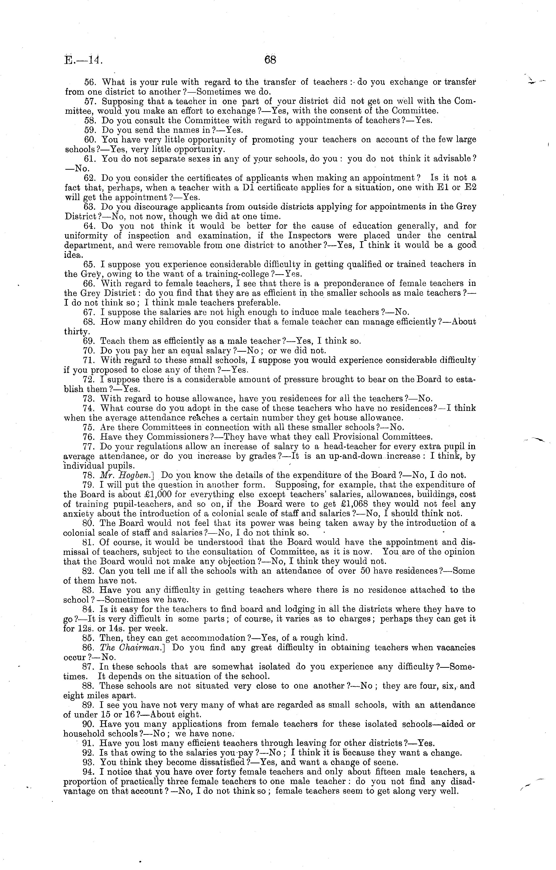 56. What is your rule with regard to the transfer of teachers :- do you exchange or transfer from one district to another ?—Sometimes we do. 57. Supposing that a teacher in one part of your district did not get on well with the Committee, would you make an effort to exchange ?—Yes, with the consent of the Committee. 58. Do you consult the Committee with regard to appointments of teachers ?—Yes. 59. Do you send the names in ? —Yes. 60. You have very little opportunity of promoting your teachers on account of the few large schools?— Yes, very little opportunity. 61. You do not separate sexes in any of your schools, do you : you do not think it advisable? —No. 62. Do you consider the certificates of applicants when making an appointment ? Is it not a fact that, perhaps, when a teacher with a Dl certificate applies for a situation, one with El or E2 will get the appointment ?—Yes. 63. Do you discourage applicants from outside districts applying for appointments in the Grey District?—No, not now, though we did at one time. 64. Do you not think it would be better for the cause of education generally, and for uniformity of inspection and examination, if the Inspectors were placed under the central department, and were removable from one district to another?— Yes, I think it would be a good idea. 65. I suppose you experience considerable difficulty in getting qualified or trained teachers in the Grey, owing to the want of a training-college? —Yes. 66. With regard to female teachers, I see that there is a preponderance of female teachers in the Grey District : do you find that they are as efficient in the smaller schools as male teachers ?— I do not think so; I think male teachers preferable. 67. I suppose the salaries are not high enough to induce male teachers ?—No. 68. How many children do you consider that a female teacher can manage efficiently ?—About thirty. 69. Teach them as efficiently as a male teacher?—-Yes, I think so. 70. Do you pay her an equal salary ? —No ; or we did not. 71. With regard to these small schools, I suppose you would experience considerable difficulty if you proposed to close any of them ?—Yes. 72. I suppose there is a considerable amount of pressure brought to bear on the Board to establish them ?—Yes. 73. With regard to house allowance, have you residences for all the teachers? —No. 74. What course do you adopt in the case of these teachers who have no residences? —I think when the average attendance reaches a certain number they get house allowance. 75. Are there Committees in connection with all these smaller schools?— No. 76. Have they Commissioners ?—They have what they call Provisional Committees. 77. Do your regulations allow an increase of salary to a head-teacher for every extra pupil in average attendance, or do you increase by grades ?—lt is an up-and-down increase : I think, by individual pupils. 78. Mr. Hogben.] Do you know the details of the expenditure of the Board ?—No, Ido not. 79. I will put the question in another form. Supposing, for example, that the expenditure of the Board is about £1,000 for everything else except teachers' salaries, allowances, buildings, cost of training pupil-teachers, and so on, if the Board were to get £1,068 they would not feel any anxiety about the introduction of a colonial scale of staff and salaries ? —No, I should think not. 80. The Board would not feel that its power was being taken away by the introduction of a colonial scale of staff and salaries? —No, I do not think so. 81. Of course, it would be understood that the Board would have the appointment and dismissal of teachers, subject to the consultation of Committee, as it is now. You are of the opinion that the Board would not make any objection ? —No, I think they would not. 82. Can you tell me if all the schools with an attendance of over 50 have residences?— Some of them have not. 83. Have you any difficulty in getting teachers where there is no residence attached to the school ? —Sometimes we have. 84. Is it easy for the teachers to find board and lodging in all the districts where they have to go ?—lt is very difficult in some parts ; of course, it varies as to charges; perhaps they can get it for 12s. or 14s. per week. 85. Then, they can get accommodation ?—Yes, of a rough kind. 86. The Chairman.] Do you find any great difficulty in obtaining teachers when vacancies occur ? —No. 87. In these schools that are somewhat isolated do you experience any difficulty?— Sometimes. It depends on the situation of the school. 88. These schools are not situated very close to one another ?—No ; they are four, six, and eight miles apart. 89. I see you have not very many of what are regarded as small schools, with an attendance of under 15 or 16 ?—About eight. 90. Have you many applications from female teachers for these isolated schools—aided or household schools ?—No ; we have none. 91. Have you lost many efficient teachers through leaving for other districts?— Yes. 92. Is that owing to the salaries you-pay ?—No ; I think it is because they want a change. 93. You think they become dissatisfied? —Yes, and want a change of scene. 94. I notice that you have over forty female teachers and only about fifteen male teachers, a proportion of practically three female teachers to one male teacher : do you not find any disadvantage on that account ?—N o, Ido not think so ; female teachers seem to get along very well.