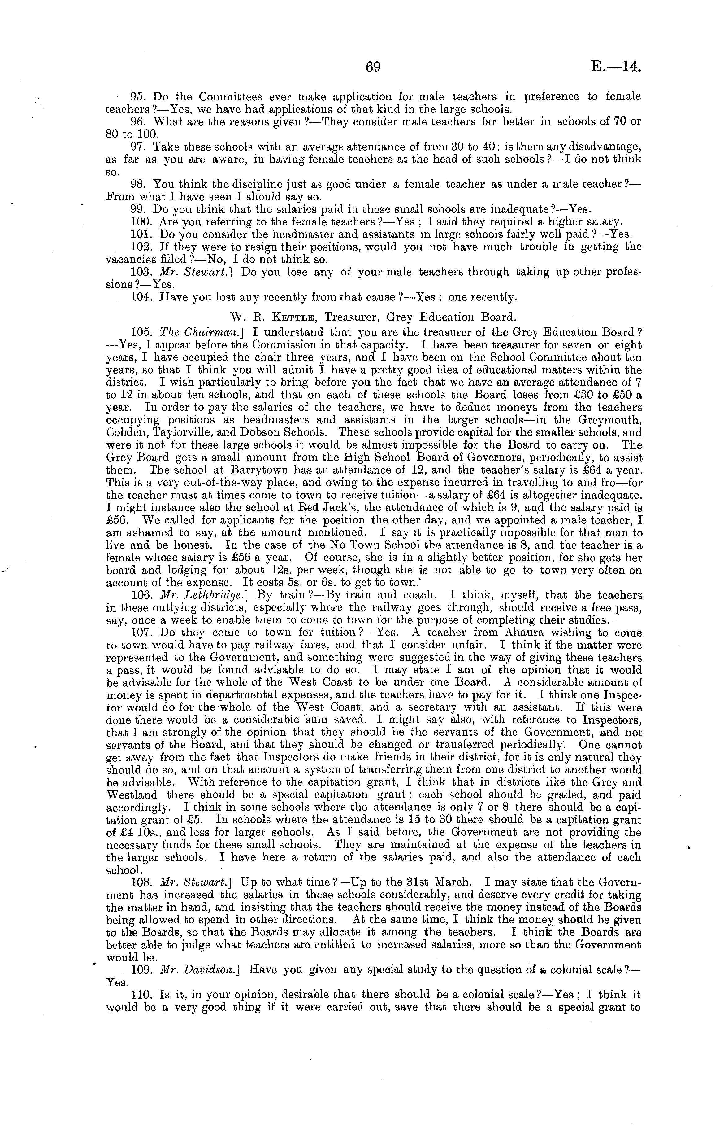 95. Do the Committees ever make application for male teachers in preference to female teachers? —Yes, we have had applications of that kind in the large schools. 96. What are the reasons given ?—They consider male teachers far better in schools of 70 or 80 to 100. 97. Take these schools with an average attendance of from 30 to 40: is there any disadvantage, as far as you are aware, in having female teachers at the head of such schools ?—I do not think so. 98. You think the discipline just as good under a female teacher as under a male teacher?— From what I have seen I should say so. 99. Do you think that the salaries paid in these small schools are inadequate? —Yes. 100. Are you referring to the female teachers? —Yes ; I said they required a higher salary. 101. Do you consider the headmaster and assistants in large schools fairly well paid?— Yes. 102. If they were to resign their positions, would you not have much trouble in getting the vacancies filled ?—No, I do not think so. 103. Mr. Steivart.] Do you lose any of your male teachers through taking up other professions?— Yes. 104. Have you lost any recently from that cause ? —Yes ; one recently. W. B. Kettle, Treasurer, Grey Education Board. 105. The Chairman.] I understand that you are the treasurer of the Grey Education Board ? —Yes, I appear before the Commission in that capacity. I have been treasurer for seven or eight years, I have occupied the chair three years, and I have been on the School Committee about ten years, so that I think you will admit I have a pretty good idea of educational matters within the district. I wish particularly to bring before you the fact that we have an average attendance of 7 to 12 in about ten schools, and that on each of these schools the Board loses from £30 to £50 a year. In order to pay the salaries of the teachers, we have to deduct moneys from the teachers occupying positions as headmasters and assistants in the larger schools—in the Greymouth, Cobden, Taylorville, and Dobson Schools. These schools provide capital for the smaller schools, and were it not for these large schools it would be almost impossible for the Board to carry on. The Grey Board gets a small amount from the High School Board of Governors, periodically, to assist them. The school at Barrytown has an attendance of 12, and the teacher's salary is £64 a year. This is a very out-of-the-way place, and owing to the expense incurred in travelling to and fro—for the teacher must at times come to town to receive tuition—a salary of £64 is altogether inadequate. I might instance also the school at Bed Jack's, the attendance of which is 9, and the salary paid is £56. We called for applicants for the position the other day, and we appointed a male teacher, I am ashamed to say, at the amount mentioned. I say it is practically impossible for that man to live and be honest. In the ease of the No Town School the attendance is 8, and the teacher is a female whose salary is £56 a year. Of course, she is in a slightly better position, for she gets her board and lodging for about 12s. per week, though she is not able to go to town very often on account of the expense. It costs ss. or 6s. to get to town." 106. Mr. Lethbridge.] By train ?—By train and coach. I think, myself, that the teachers in these outlying districts, especially where the railway goes through, should receive a free pass, say, once a week to enable them to come to town for the purpose of completing their studies. 107. Do they come to town for tuition? —Yes. A teacher from Ahaura wishing to come to town would have to pay railway fares, and that I consider unfair. I think if the matter were represented to the Government, and something were suggested in the way of giving these teachers a pass, it would be found advisable to do so. I may state I am of the opinion that it would be advisable for the whole of the West Coast to be under one Board. A considerable amount of money is spent in departmental expenses, and the teachers have to pay for it. I think one Inspector would do for the whole of the West Coast, and a secretary with an assistant. If this were done there would be a considerable sum saved. I might say also, with reference to Inspectors, that I am strongly of the opinion that they should be the servants of the Government, and not servants of the Board, and that they should be changed or transferred periodically". One cannot get away from the fact that Inspectors do make friends in their district, for it is only natural they should do so, and on that account a system of transferring them from one district to another would be advisable. With reference to the capitation grant, I think that in districts like the Grey and Westland there should be a special capitation grant; each school should be graded, and paid accordingly. I think in some schools where the attendance is only 7or 8 there should be a capitation grant of £5. In schools where the attendance is 15 to 30 there should be a capitation grant of £4 10s., and less for larger schools. As I said before, the Government are not providing the necessary funds for these small schools. They are maintained at the expense of the teachers in the larger schools. I have here a return of the salaries paid, and also the attendance of each school. 108. Mr. Stewart.] Up to what time ?—Up to the 31st March. I may state that the Government has increased the salaries in these schools considerably, and deserve every credit for taking the matter in hand, and insisting that the teachers should receive the money instead of the Boards being allowed to spend in other directions. At the same time, I think the money should be given to the Boards, so that the Boards may allocate it among the teachers. I think the Boards are better able to judge what teachers are entitled to increased salaries, more so than the Government would be. 109. Mr. Davidson.] Have you given any special study to the question of a colo