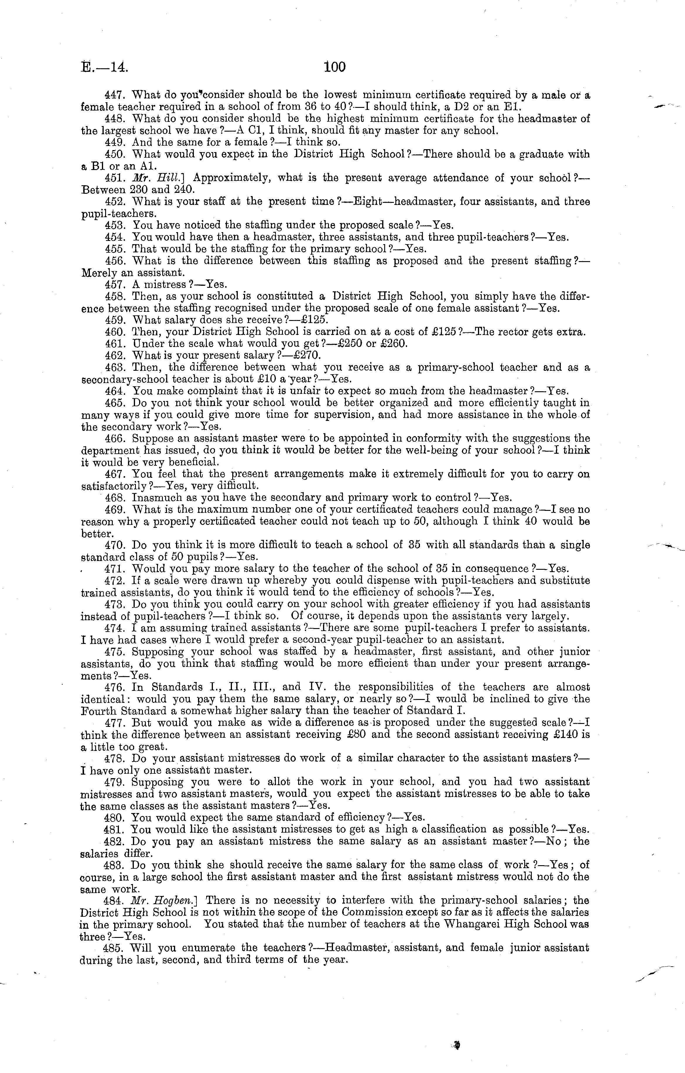447. What do you'consider should be the lowest minimum certificate required by a male or a female teacher required in a school of from 36 to 40?— I should think, aD2or an El. 448. What do you consider should be the highest minimum certificate for the headmaster of the largest school we have ?—A CI, I think, should fit any master for any school. 449. And the same for a female ? —I think so. 450. What would you expect in the District High School ? —There should be a graduate with a Bl or an Al. 451. Mr. Hill] Approximately, what is the present average attendance of your school ?— Between 230 and 240. 452. What is your staff at the present time ?—Eight—headmaster, four assistants, and three pupil-teachers. 453. You have noticed the staffing under the proposed scale?— Yes. 454. You would have then a headmaster, three assistants, and three pupil-teachers ?—Yes. 455. That would be the staffing for the primary school?— Yes. 456. What is the difference between this staffing as proposed and the present staffing?— Merely an assistant. 457. A mistress ?—Yes. 458. Then, as your school is constituted a District High School, you simply have the difference between the staffing recognised under the proposed scale of one female assistant ?—Yes. 459. What salary does she receive?—£l2s. 460. Then, your District High School is carried on at a cost of £125 ?—The rector gets extra. 461. Under the scale what would you get?—£2so or £260. 462. What is your present salary?—£27o. 463. Then, the difference between what you receive as a primary-school teacher and as a secondary-school teacher is about £10 a year?— Yes. 464. You make complaint that it is unfair to expect so much from the headmaster ? —Yes. 465. Do you not think your school would be better organized and more efficiently taught in many ways if you could give more time for supervision, and had more assistance in the whole of the secondary work ? —Yes. 466. Suppose an assistant master were to be appointed in conformity with the suggestions the department has issued, do you think it would be better for the well-being of your school ?—I think it would be very beneficial. 467. You feel that the present arrangements make it extremely difficult for you to carry on satisfactorily ?—Yes, very difficult. 468. Inasmuch as you have the secondary and primary work to control ?—Yes. 469. What is the maximum number one of your certificated teachers could manage ? —I see no reason why a properly certificated teacher could not teach up to 50, although I think 40 would be better. 470. Do you think it is more difficult to teach a school of 35 with all standards than a single standard class of 50 pupils ?—Yes. 471. Would you pay more salary to the teacher of the school of 35 in consequence ? —Yes. 472. If a scale were drawn up whereby you could dispense with pupil-teachers and substitute trained assistants, do you think it would tend to the efficiency of schools?— Yes. 473. Do you think you could carry on your school with greater efficiency if you had assistants instead of pupil-teachers ?—I think so. Of course, it depends upon the assistants very largely. 474. I am assuming trained assistants ?—There are some pupil-teachers I prefer to assistants. I have had cases where I would prefer a second-year pupil-teacher to an assistant. 475. Supposing your school was staffed by a headmaster, first assistant, and other junior assistants, do you think that staffing would be more efficient than under your present arrangements ? —Yes. 476. In Standards 1., 11., 111., and IV. the responsibilities of the teachers are almost identical: would you pay them the same salary, or nearly so ? —I would be inclined to give the Fourth Standard a somewhat higher salary than the teacher of Standard I. 477. But would you make as wide a difference as is proposed under the suggested scale?—l think the difference between an assistant receiving £80 and the second assistant receiving £140 is a little too great. 478. Do your assistant mistresses do work of a similar character to the assistant masters?— I have only one assistant master. 479. Supposing you were to allot the work in your school, and you had two assistant mistresses and two assistant masters, would you expect the assistant mistresses to be able to take the same classes as the assistant masters ?—Yes. 480. You would expect the same standard of efficiency ?—Yes. 481. You would like the assistant mistresses to get as high a classification as possible ?—Yes. 482. Do you pay an assistant mistress the same salary as an assistant master?—No; the salaries differ. 483. Do you think she should receive the same salary for the same class of work ?—Yes; of course, in a large school the first assistant master and the first assistant mistress would not do the same work. 484. Mr. Hogben.] There is no necessity to interfere with the primary-school salaries; the District High School is not within the scope of the Commission except so far as it affects the salaries in the primary school. You stated that the number of teachers at the Whangarei High School was three ? —Yes. 485. Will you enumerate the teachers ? —Headmaster, assistant, and female junior assistant during the last, second, and third terms of the year.