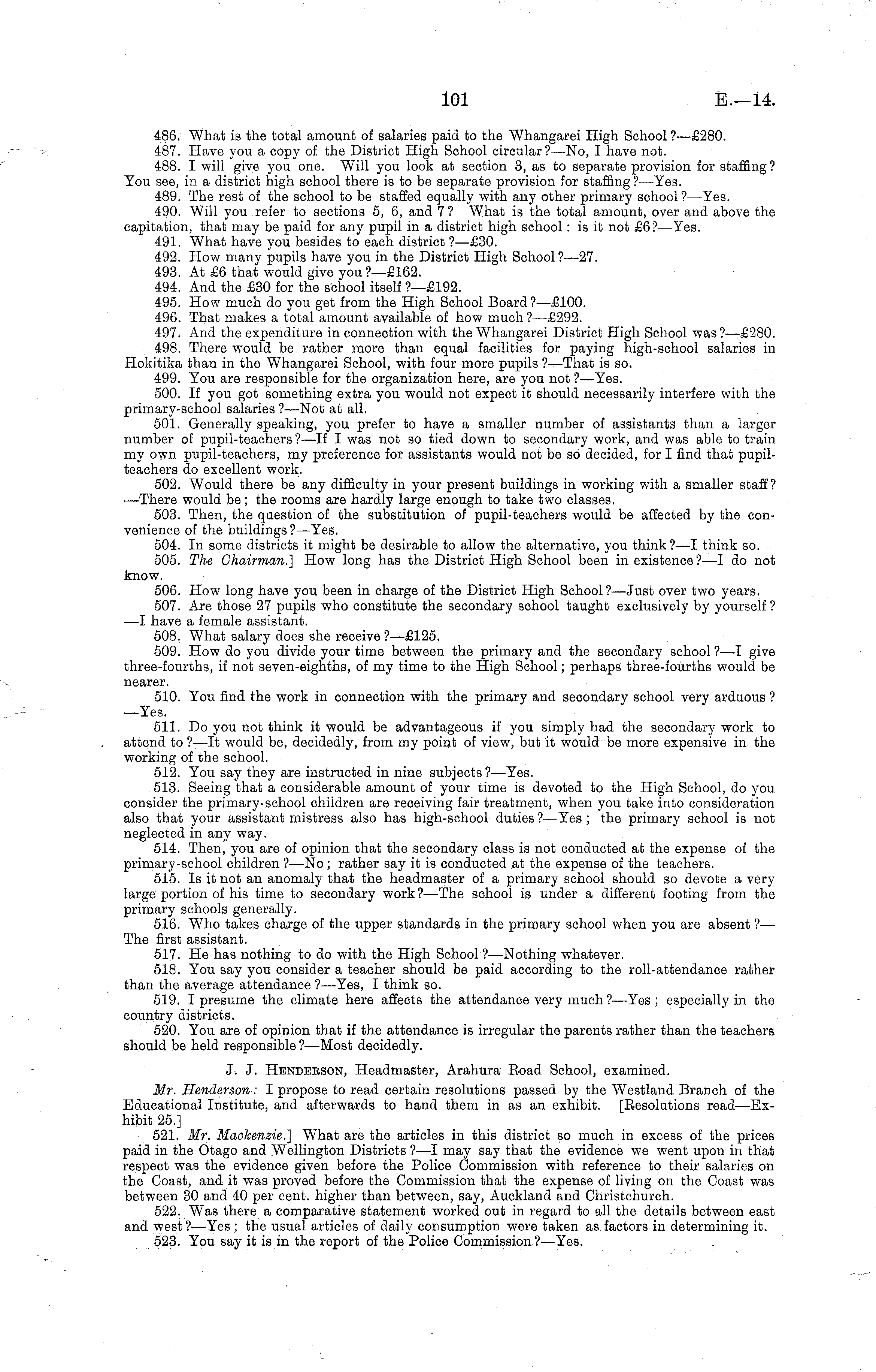 486. What is the total amount of salaries paid to the Whangarei High School ?—£2Bo. 487. Have you a copy of the District High School circular?—No, I have not. 488. I will give you one. Will you look at section 3, as to separate provision for staffing ? You see, in a district high school there is to be separate provision for staffing? —Yes. 489. The rest of the school to be staffed equally with any other primary school ?—Yes. 490. Will you refer to sections 5, 6, and 7 ? What is the total amount, over and above the capitation, that may be paid for any pupil in a district high school : is it not £6?— Yes. 491. What have you besides to each district ?—£3o. 492. How many pupils have you in the District High School?— 27. 493. At £6 that would give you?—£l62. 494. And the £30 for the school itself ?—£l92. 495. How much do you get from the High School Board?—£100. 496. That makes a total amount available of how much ?—£292. 497. And the expenditure in connection with the Whangarei District High School was ? —£2Bo. 498. There would be rather more than equal facilities for paying high-school salaries in Hokitika than in the Whangarei School, with four more pupils ? —That is so. 499. You are responsible for the organization here, are you not ?—Yes. 500. If you got something extra you would not expect it should necessarily interfere with the primary-school salaries ?—Not at all. 501. Generally speaking, you prefer to have a smaller number of assistants than a larger number of pupil-teachers ? —lf I was not so tied down to secondary work, and was able to train my own pupil-teachers, my preference for assistants would not be so decided, for I find that pupilteachers do excellent work. 502. Would there be any difficulty in your present buildings in working with a smaller staff? —There would be; the rooms are hardly large enough to take two classes. 503. Then, the question of the substitution of pupil-teachers would be affected by the convenience of the buildings? —Yes. 504. In some districts it might be desirable to allow the alternative, you think?—l think so. 505. The Chairman.] How long has the District High School been in existence? —I do not know. 506. How long have you been in charge of the District High School?— Just over two years. 507. Are those 27 pupils who constitute the secondary school taught exclusively by yourself? —I have a female assistant. 508. What salary does she receive ?—£l2s. 509. How do you divide your time between the primary and the secondary school ?—I give three-fourths, if not seven-eighths, of my time to the High School; perhaps three-fourths would be nearer. 510. You find the work in connection with the primary and secondary school very arduous ? —Yes. 511. Do you not think it would be advantageous if you simply had the secondary work to attend to ?—lt would be, decidedly, from my point of view, but it would be more expensive in the working of the school. 512. You say they are instructed in nine subjects?— Yes. 513. Seeing that a considerable amount of your time is devoted to the High School, do you consider the primary-school children are receiving fair treatment, when you take into consideration also that your assistant mistress also has high-school duties ?—Yes; the primary school is not neglected in any way. 514. Then, you are of opinion that the secondary class is not conducted at the expense of the primary-school children ? —No; rather say it is conducted at the expense of the teachers. 515. Is it not an anomaly that the headmaster of a primary school should so devote a very large portion of his time to secondary work ?—The school is under a different footing from the primary schools generally. 516. Who takes charge of the upper standards in the primary school when you are absent ? — The first assistant. 517. He has nothing to do with the High School ?—Nothing whatever. 518. You say you consider a teacher should be paid according to the roll-attendance rather than the average attendance ?—Yes, I think so. 519. I presume the climate here affects the attendance very much ?—Yes ; especially in the country districts. 520. You are of opinion that if the attendance is irregular the parents rather than the teachers should be held responsible ? —Most decidedly. J. J. Hendeeson, Headmaster, Arahura Boad School, examined. Mr. Henderson: I propose to read certain resolutions passed by the Westland Branch of the Educational Institute, and afterwards to hand them in as an exhibit. [Besolutions read —Exhibit 25.] 521. Mr. Mackenzie.] What are the articles in this district so much in excess of the prices paid in the Otago and Wellington Districts ? —I may say that the evidence we went upon in that respect was the evidence given before the Police Commission with reference to their salaries on the Coast, and it was proved before the Commission that the expense of living on the Coast was between 30 and 40 per cent, higher than between, say, Auckland and Christchurch. 522. Was there a comparative statement worked out in regard to all the details between east and west?— Yes; the usual articles of daily consumption were taken as factors in determining it. 523. You say it is in the report of the Police Commission?— Yes.