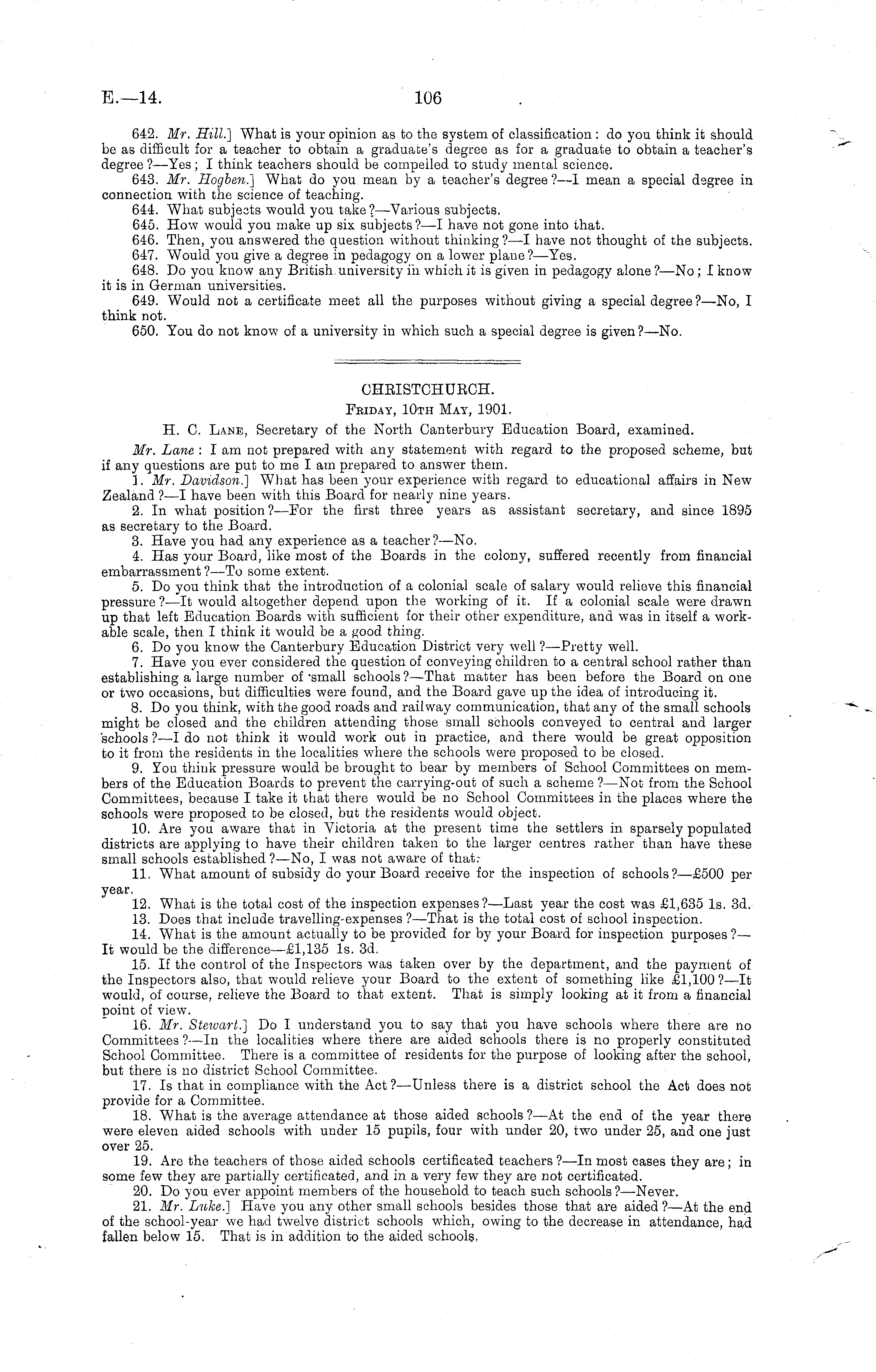 CHBISTCHUBCH. Feiday, 10th May, 1901. H. C. Lane, Secretary of the North Canterbury Education Board, examined. Mr. Lane : I am not prepared with any statement with regard to the proposed scheme, but if any questions are put to me I am prepared to answer them. 1. Mr. Davidson.] What has been your experience with regard to educational affairs in New Zealand ?—I have been with this Board for nearly nine years. 2. In what position ?—For the first three years as assistant secretary, and since 1895 as secretary to the Board. 3. Have you had any experience as a teacher?— No. 4. Has your Board, like most of the Boards in the colony, suffered recently from financial embarrassment ?—To some extent. 5. Do you think that the introduction of a colonial scale of salary would relieve this financial pressure ?—lt would altogether depend upon the working of it. If a colonial scale were drawn up that left Education Boards with sufficient for their other expenditure, and was in itself a workable scale, then I think it would be a good thing. 6. Do you know the Canterbury Education District very well ?—Pretty well. 7. Have you ever considered the question of conveying children to a central school rather than establishing a large number of 'small schools ?—That matter has been before the Board on one or two occasions, but difficulties were found, and the Board gave up the idea of introducing it. 8. Do you think, with the good roads and railway communication, that any of the small schools might be closed and the children attending those small schools conveyed to central and larger schools ? —I do not think it would work out in practice, and there would be great opposition to it from the residents in the localities where the schools were proposed to be closed. 9. You think pressure would be brought to bear by members of School Committees on members of the Education Boards to prevent the carrying-out of such a scheme ? —Not from the School Committees, because I take it that there would be no School Committees in the places where the schools were proposed to be closed, but the residents would object. 10. Are you aware that in Victoria at the present time the settlers in sparsely populated districts are applying to have their children taken to the larger centres rather than have these small schools established ?—No, I was not aware of that: 11. What amount of subsidy do your Board receive for the inspection of schools?—£soo per year. 12. What is the total cost of the inspection expenses?—-Last year the cost was £1,635 Is. 3d. 13. Does that include travelling-expenses ?—That is the total cost of school inspection. 14. What is the amount actually to be provided for by your Board for inspection purposes ?— It would be the difference —£1,135 Is. 3d. 15. If the control of the Inspectors was taken over by the department, and the payment of the Inspectors also, that would relieve your Board to the extent of something like £1,100 ?—lt would, of course, relieve the Board to that extent. That is simply looking at it from a financial point of view. 16. Mr. Stewart.] Do I understand you to say that you have schools where there are no Committees ?—ln the localities where there are aided schools there is no properly constituted School Committee. There is a committee of residents for the purpose of looking after the school, but there is no district School Committee. 17. Is that in compliance with the Act? —Unless there is a district school the Act does not provide for a Committee. 18. What is the average attendance at those aided schools ?—At the end of the year there were eleven aided schools with under 15 pupils, four with under 20, two under 25, and one just over 25. 19. Are the teachers of those aided schools certificated teachers ?—ln most cases they are; in some few they are partially certificated, and in a very few they are not certificated. 20. Do you ever appoint members of the household to teach such schools ? —Never. 21. Mr. Luke.] Have you any other small schools besides those that are aided?—At the end of the school-year we had twelve district schools which, owing to the decrease in attendance, had fallen below 15. That is in addition to the aided schools.