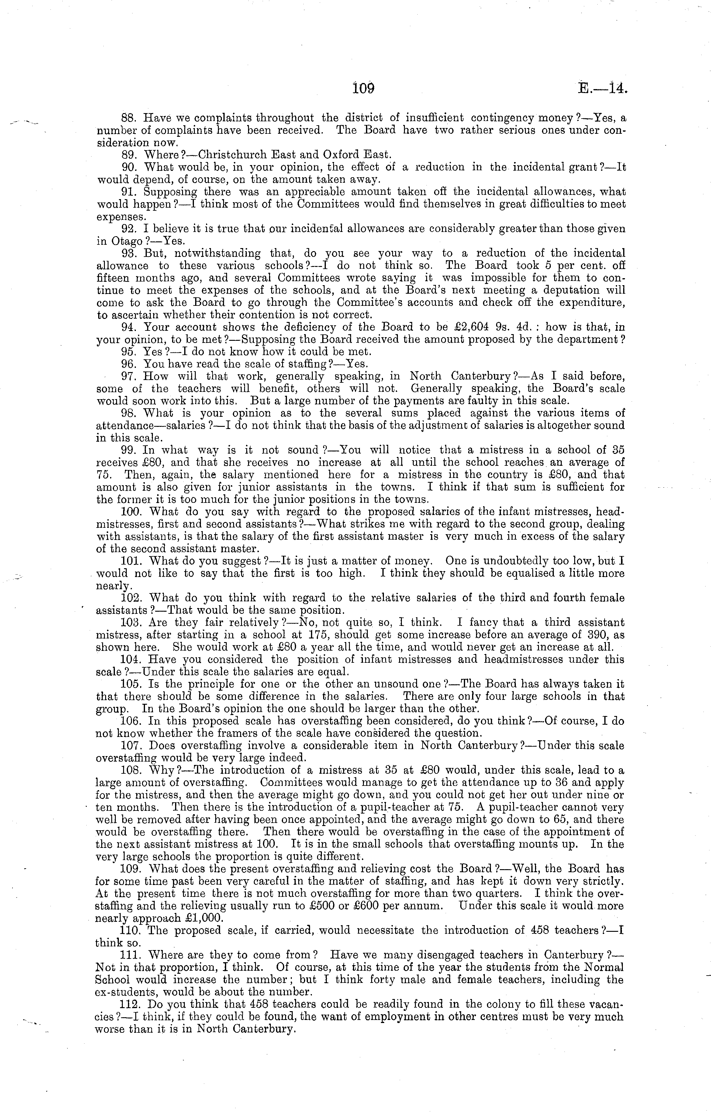 88. Have we complaints throughout the district of insufficient contingency money ?—Yes, a number of complaints have been received. The Board have two rather serious ones under consideration now. 89. Where? —Christchurch East and Oxford East. 90. What would be, in your opinion, the effect of a reduction in the incidental grant ?—lt would depend, of course, on the amount taken away. 91. Supposing there was an appreciable amount taken off the incidental allowances, what would happen ?—I think most of the Committees would find themselves in great difficulties to meet expenses. 92. I believe it is true that our incidental allowances are considerably greater than those given in Otago ? —Yes. 93. But, notwithstanding that, do you see your way to a reduction of the incidental allowance to these various schools?—l do not think so. The Board took 5 per cent, off fifteen months ago, and several Committees wrote saying it was impossible for them to continue to meet the expenses of the schools, and at the Board's next meeting a deputation will come to ask the Board to go through the Committee's accounts and check off the expenditure, to ascertain whether their contention is not correct. 94. Your account shows the deficiency of the Board to be £2,604 9s. 4d. : how is that, in your opinion, to be met ? —Supposing the Board received the amount proposed by the department ? 95. Yes ? —I do not know how it could be met. 96. You have read the scale of staffing?— Yes. 97. How will that work, generally speaking, in North Canterbury?—As I said before, some of the teachers will benefit, others will not. Generally speaking, the Board's scale would soon work into this. But a large number of the payments are faulty in this scale. 98. What is your opinion as to the several sums placed against the various items of attendance —salaries ? —I do not think that the basis of the adjustment of salaries is altogether sound in this scale. 99. In what way is it not sound ?—You will notice that a mistress in a school of 35 receives £80, and that she receives no increase at all until the school reaches an average of 75. Then, again, the salary mentioned here for a mistress in the country is £80, and that amount is also given for junior assistants in the towns. I think if that sum is sufficient for the former it is too much for the junior positions in the towns. 100. What do you say with regard to the proposed salaries of the infant mistresses, headmistresses, first and second assistants ? —What strikes me with regard to the second group, dealing with assistants, is that the salary of the first assistant master is very much in excess of the salary of the second assistant master. 101. What do you suggest ? —lt is just a matter of money. One is undoubtedly too low, but I would not like to say that the first is too high. I think they should be equalised a little more nearly. 102. What do you think with regard to the relative salaries of the third and fourth female assistants ?—That would be the same position. 103. Are they fair relatively ?—No, not quite so, I think. I fancy that a third assistant mistress, after starting in a school at 175, should get some increase before an average of 390, as shown here. She would work at £80 a year all the time, and would never get an increase at all. 104. Have you considered the position of infant mistresses and headmistresses under this scale ?—Under this scale the salaries are equal. 105. Is the principle for one or the other an unsound one ?—The Board has always taken it that there should be some difference in the salaries. There are only four large schools in that group. In the Board's opinion the one should be larger than the other. 106. In this proposed scale has overstaffing been considered, do you think ?—Of course, I do not know whether the framers of the scale have considered the question. 107. Does overstaffing involve a considerable item in North Canterbury?— Under this scale overstaffing would be very large indeed. 108. Why?— The introduction of a mistress at 35 at £80 would, under this scale, lead to a large amount of overstaffing. Committees would manage to get the attendance up to 36 and apply for the mistress, and then the average might go down, and you could not get her out under nine or ten months. Then there is the introduction of a pupil-teacher at 75. A pupil-teacher cannot very well be removed after having been once appointed, and the average might go down to 65, and there would be overstaffing there. Then there would be overstaffing in the case of the appointment of the next assistant mistress at 100. It is in the small schools that overstaffing mounts up. In the very large schools the proportion is quite different. 109. What does the present overstaffing and relieving cost the Board ? —Well, the Board has for some time past been very careful in the matter of staffing, and has kept it down very strictly. At the present time there is not much overstaffing for more than two quarters. I think the overstaffing and the relieving usually run to £500 or £600 per annum. Under this scale it would more nearly approach £1,000. 110. The proposed scale, if carried, would necessitate the introduction of 458 teachers ?—I think so. 111. Where are they to come from? Have we many disengaged teachers in Canterbury?—• Not in that proportion, I think. Of course, at this time of the year the students from the Normal School would increase the number; but I think forty male and female teachers, including the ex-students, would be about the number. 112. Do you think that 458 teachers could be readily found in the colony to fill these vacancies ? —I think, if they could be found, the want of employment in other centres must be very much worse than it is in North Canterbury.
