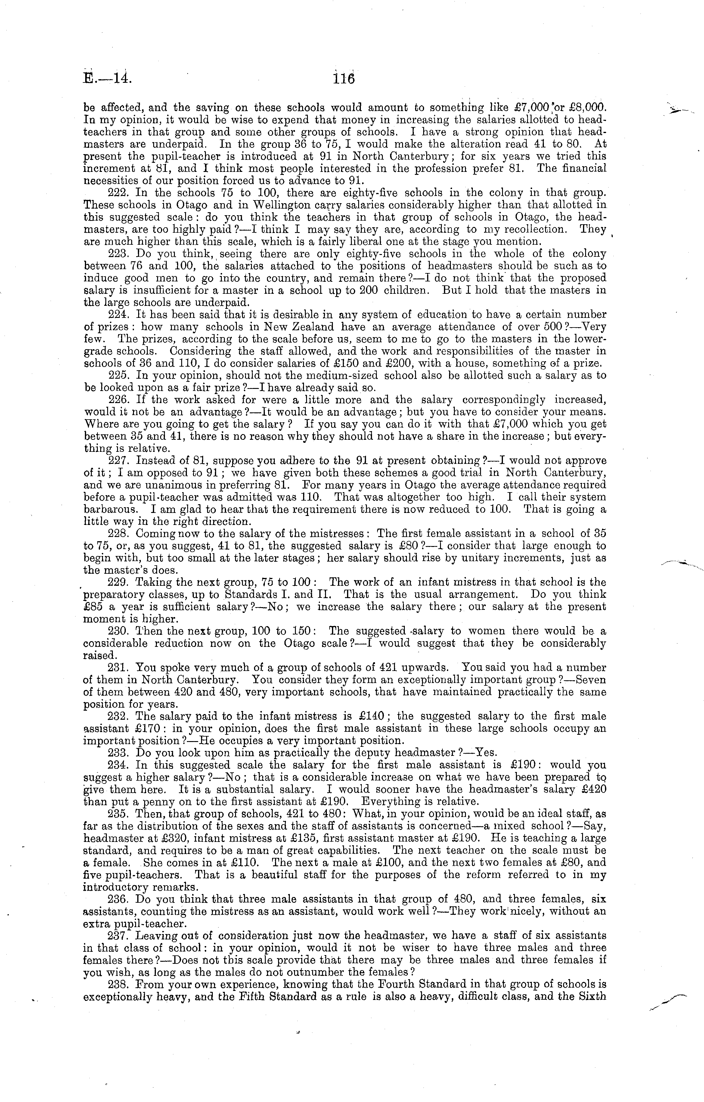 be affected, and the saving on these schools would amount to something like £7,000'0r £8,000. In my opinion, it would be wise to expend that money in increasing the salaries allotted to headteachers in that group and some other groups of schools. I have a strong opinion that headmasters are underpaid. In the group 36 to 75, I would make the alteration read 41 to 80. At present the pupil-teacher is introduced at 91 in North Canterbury; for six years we tried this increment at 81, and I think most people interested in the profession prefer 81. The financial necessities of our position forced us to advance to 91. 222. In the schools 75 to 100, there are eighty-five schools in the colony in that group. These schools in Otago and in Wellington carry salaries considerably higher than that allotted in this suggested scale : do you think the teachers in that group of schools in Otago, the headmasters, are too highly paid ?—I think I may say they are, according to my recollection. They are much higher than this scale, which is a fairly liberal one at the stage you mention. 223. Do you think, seeing there are only eighty-five schools in the whole of the colony between 76 and 100, the salaries attached to the positions of headmasters should be such as to induce good men to go into the country, and remain there ?—I do not think that the proposed salary is insufficient for a master in a school up to 200 children. But I hold that the masters in the large schools are underpaid. 224. It has been said that it is desirable in any system of education to have a certain number of prizes : how many schools in New Zealand have an average attendance of over 500 ?—Very few. The prizes, according to the scale before us, seem to me to go to the masters in the lowergrade schools. Considering the staff allowed, and the work and responsibilities of the master in schools of 36 and 110, I do consider salaries of £150 and £200, with a house, something of a prize. 225. In your opinion, should not the medium-sized school also be allotted such a salary as to be looked upon as a fair prize ?—I have already said so. 226. If the work asked for were a little more and the salary correspondingly increased, would it not be an advantage ? —lt would be an advantage ; but you have to consider your means. Where are you going to get the salary ? If you say you can do it with that £7,000 which you get between 35 and 41, there is no reason why they should not have a share in the increase ; but everything is relative. 227. Instead of 81, suppose you adhere to the 91 at present obtaining ?—I would not approve of it; lam opposed to 91 ; we have given both these schemes a good trial in North Canterbury, and we are unanimous in preferring 81. For many years in Otago the average attendance required before a pupil-teacher was admitted was 110. That was altogether too high. I call their system barbarous. lam glad to hear that the requirement there is now reduced to 100. That is going a little way in the right direction. 228. Coming now to the salary of the mistresses : The first female assistant in a school of 35 to 75, or, as you suggest, 41 to 81, the suggested salary is £80 ? —I consider that large enough to begin with, but too small at the later stages; her salary should rise by unitary increments, just as the master's does. 229. Taking the next group, 75 to 100 : The work of an infant mistress in that school is the preparatory classes, up to Standards I. and 11. That is the usual arrangement. Do you think £85 a year is sufficient salary ? —No; we increase the salary there ; our salary at the present moment is higher. 230. Then the next group, 100 to 150: The suggested salary to women there would be a considerable reduction now on the Otago scale ? —I would suggest that they be considerably raised. 231. You spoke very much of a group of schools of 421 upwards. You said you had a number of them in North Canterbury. You consider they form an exceptionally important group ?—Seven of them between 420 and 480, very important schools, that have maintained practically the same position for years. 232. The salary paid to the infant mistress is £140 ; the suggested salary to the first male assistant £170 : in your opinion, does the first male assistant in these large schools occupy an important position ?—He occupies a very important position. 233. Do you look upon him as practically the deputy headmaster ? —Yes. 234. In this suggested scale the salary for the first male assistant is £190: would you suggest a higher salary ?—No ; that is a considerable increase on what we have been prepared to give them here. It is a substantial salary. I would sooner have the headmaster's salary £420 than put a penny on to the first assistant at £190. Everything is relative. 235. Then, that group of schools, 421 to 480: What, in your opinion, would be an ideal staff, as far as the distribution of the sexes and the staff of assistants is concerned —a mixed school ?—Say, headmaster at £320, infant mistress at £135, first assistant master at £190. He is teaching a large standard, and requires to be a man of great capabilities. The next teacher on the scale must be a female. She comes in at £110. The next a male at £100, and the next two females at £80, and five pupil-teachers. That is a beautiful staff for the purposes of the reform referred to in my introductory remarks. 236. Do you think that three male assistants in that group of 480, and three females, six assistants, counting the mistress as an assistant, would work well ?—They work 1 nicely, without an extra pupil-teacher. 237. Leaving out of consideration just now the headmaster, we have a staff of six assistants in that class of school: in your opinion, would it not be wiser to have three males and three females there?— Does not this scale provide that there may be three males and three females if you wish, as long as the males do not outnumber the females ? 