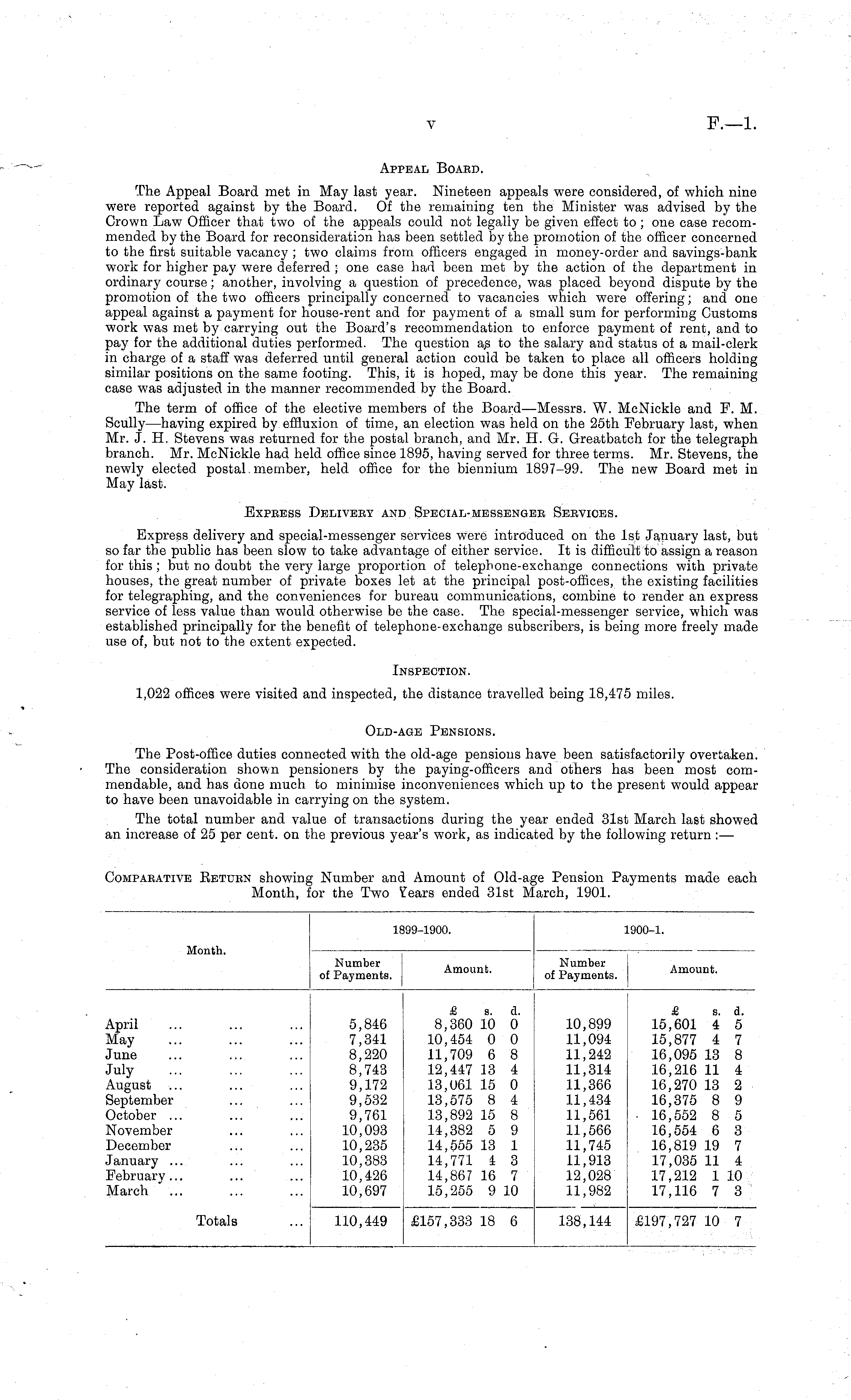 Appeal Board. The Appeal Board met in May last year. Nineteen appeals were considered, of which nine were reported against by the Board. Of the remaining ten the Minister was advised by the Crown Law Officer that two of the appeals could not legally be given effect to ; one case recommended by the Board for reconsideration has been settled by the promotion of the officer concerned to the first suitable vacancy ; two claims from officers engaged in money-order and savings-bank work for higher pay were deferred ; one case had been met by the action of the department in ordinary course; another, involving a question of precedence, was placed beyond dispute by the promotion of the two officers principally concerned to vacancies which were offering; and one appeal against a payment for house-rent and for payment of a small sum for performing Customs work was met by carrying out the Board's recommendation to enforce payment of rent, and to pay for the additional duties performed. The question a,s to the salary and status of a mail-clerk in charge of a staff was deferred until general action could be taken to place all officers holding similar positions on the same footing. This, it is hoped, may be done this year. The remaining case was adjusted in the manner recommended by the Board. The term of office of the elective members of the Board—Messrs. W. McNickle and F. M. Scully —having expired by effluxion of time, an election was held on the 25th February last, when Mr. J. H. Stevens was returned for the postal branch, and Mr. H. G. Greatbatch for the telegraph branch. Mr. McNickle had held office since 1895, having served for three terms. Mr. Stevens, the newly elected postal member, held office for the biennium 1897-99. The new Board met in May last. Expbess Dblivebt and Special-messenger Services. Express delivery and special-messenger services were introduced on the Ist January last, but so far the public has been slow to take advantage of either service. It is difficult to assign a reason for this; but no doubt the very large proportion of telephone-exchange connections with private houses, the great number of private boxes let at the principal post-offices, the existing facilities for telegraphing, and the conveniences for bureau communications, combine to render an express service of less value than would otherwise be the case. The special-messenger service, which was established principally for the benefit of telephone-exchange subscribers, is being more freely made use of, but not to the extent expected. Inspection. 1,022 offices were visited and inspected, the distance travelled being 18,475 miles. Old-age Pensions. The Post-office duties connected with the old-age pensions have been satisfactorily overtaken. The consideration shown pensioners by the paying-officers and others has been most commendable, and has done much to minimise inconveniences which up to the present would appear to have been unavoidable in carrying on the system. The total number and value of transactions during the year ended 31st March last showed an increase of 25 per cent, on the previous year's work, as indicated by the following return : —