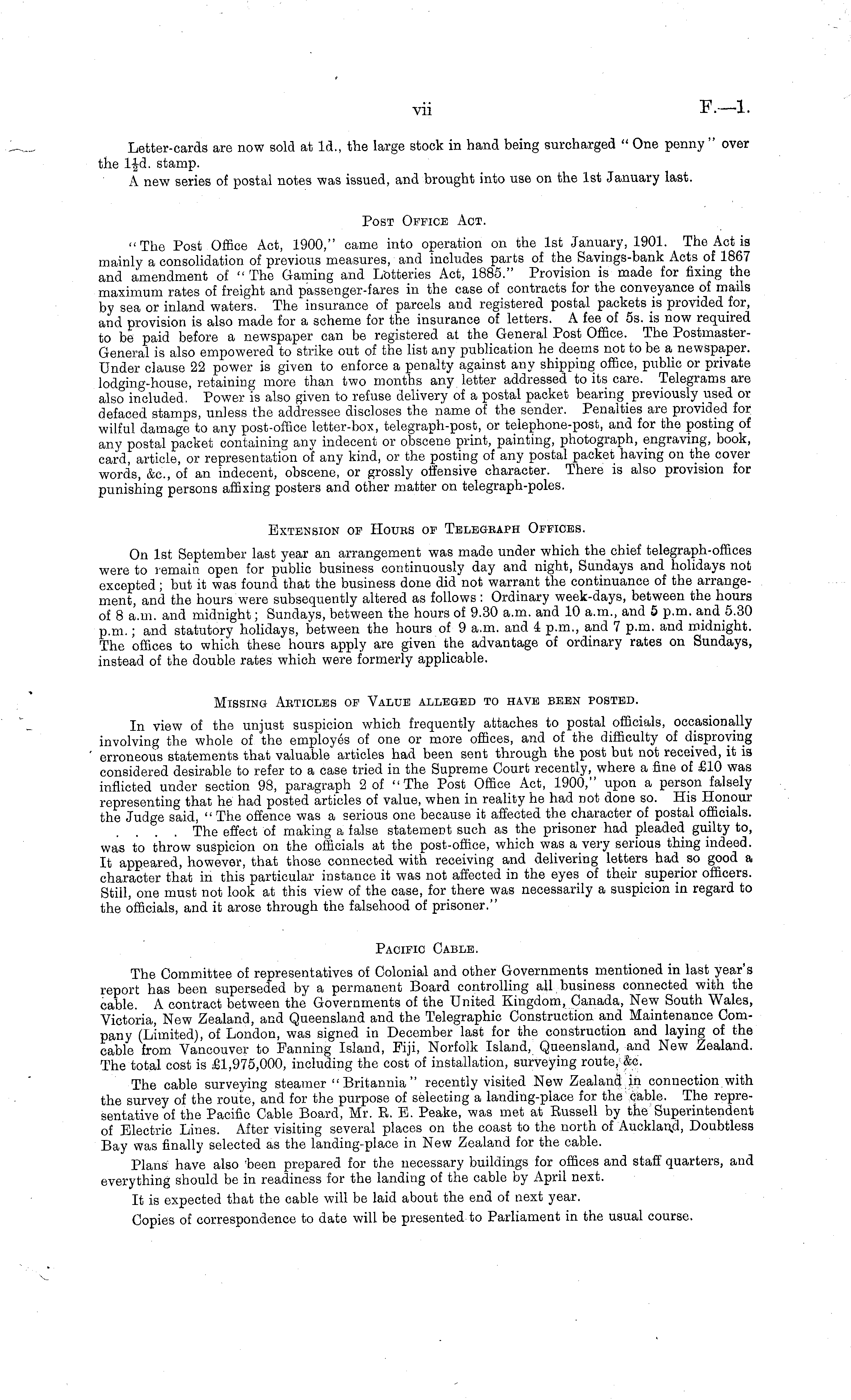 Letter-cards are now sold at Id., the large stock in hand being surcharged " One penny " over the ljd. stamp. A new series of postal notes was issued, and brought into use on the Ist January last. Post Office Act. "The Post Office Act, 1900," came into operation on the Ist January, 1901. The Act is mainly a consolidation of previous measures, and includes parts of the Savings-bank Acts of 1867 and amendment of " The Gaming and Lotteries Act, 1885." Provision is made for fixing the maximum rates of freight and passenger-fares in the case of contracts for the conveyance of mails by sea or inland waters. The insurance of parcels and registered postal packets is provided for, and provision is also made for a scheme for the insurance of letters. A fee of ss. is now required to be paid before a newspaper can be registered at the General Post Office. The PostmasterGeneral is also empowered to strike out of the list any publication he deems not to be a newspaper. Under clause 22 power is given to enforce a penalty against any shipping office, public or private lodging-house, retaining more than two months any letter addressed to its care. Telegrams are also included. Power is also given to refuse delivery of a postal packet bearing previously used or defaced stamps, unless the addressee discloses the name of the sender. Penalties are provided for wilful damage to any post-office letter-box, telegraph-post, or telephone-post, and for the posting of any postal packet containing any indecent or obscene print, painting, photograph, engraving, book, card, article, or representation oi any kind, or the posting of any postal packet having on the cover words, &c, of an indecent, obscene, or grossly offensive character. There is also provision for punishing persons affixing posters and other matter on telegraph-poles. Extension of Houes of Telegraph Offices. On Ist September last year an arrangement was made under which the chief telegraph-offices were to remain open for public business continuously day and night, Sundays and holidays not excepted; but it was found that the business done did not warrant the continuance of the arrangement, and the hours were subsequently altered as follows : Ordinary week-days, between the hours of 8 a.m. and midnight; Sundays, between the hours of 9.30 a.m. and 10 a.m., and 5 p.m. and 5.30 p.m.; and statutory holidays, between the hours of 9 a.m. and 4 p.m., and 7 p.m. and midnight. The offices to which these hours apply are given the advantage of ordinary rates on Sundays, instead of the double rates which were formerly applicable. Missing Abticles of Value alleged to have been posted. In view of the unjust suspicion which frequently attaches to postal officials, occasionally involving the whole of the employes of one or more offices, and of the difficulty of disproving erroneous statements that valuable articles had been sent through the post but not received, it is considered desirable to refer to a case tried in the Supreme Court recently, where a fine of £10 was inflicted under section 98, paragraph 2 of "The Post Office Act, 1900," upon a person falsely representing that he had posted articles of value, when in reality he had not done so. His Honour the Judge said, " The offence was a serious one because it affected the character of postal officials. The effect of making a false statement such as the prisoner had pleaded guilty to, was to throw suspicion on the officials at the post-office, which was a very serious thing indeed. It appeared, however, that those connected with receiving and delivering letters had so good a character that in this particular instance it was not affected in the eyes of their superior officers. Still, one must not look at this view of the case, for there was necessarily a suspicion in regard to the officials, and it arose through the falsehood of prisoner." Pacific Cable. The Committee of representatives of Colonial and other Governments mentioned in last year's report has been superseded by a permanent Board controlling all business connected with the cable. A contract between the Governments of the United Kingdom, Canada, New South Wales, Victoria, New Zealand, and Queensland and the Telegraphic Construction and Maintenance Company (Limited), of London, was signed in December last for the construction and laying of the cable from Vancouver to Fanning Island, Fiji, Norfolk Island, Queensland, and New Zealand. The total cost is £1,975,000, including the cost of installation, surveying route, &c. The cable surveying steamer "Britannia" recently visited New Zealand in connection with the survey of the route, and for the purpose of selecting a landing-place for the cable. The representative of the Pacific Cable Board, Mr. B. B. Peake, was met at Russell by the Superintendent of Electric Lines. After visiting several places on the coast to the north of Auckland, Doubtless Bay was finally selected as the landing-place in New Zealand for the cable. Plans have also 'been prepared for the necessary buildings for offices and staff quarters, and everything should be in readiness for the landing of the cable by April next. It is expected that the cable will be laid about the end of next year. Copies of correspondence to date will be presented to Parliament in the usual course.