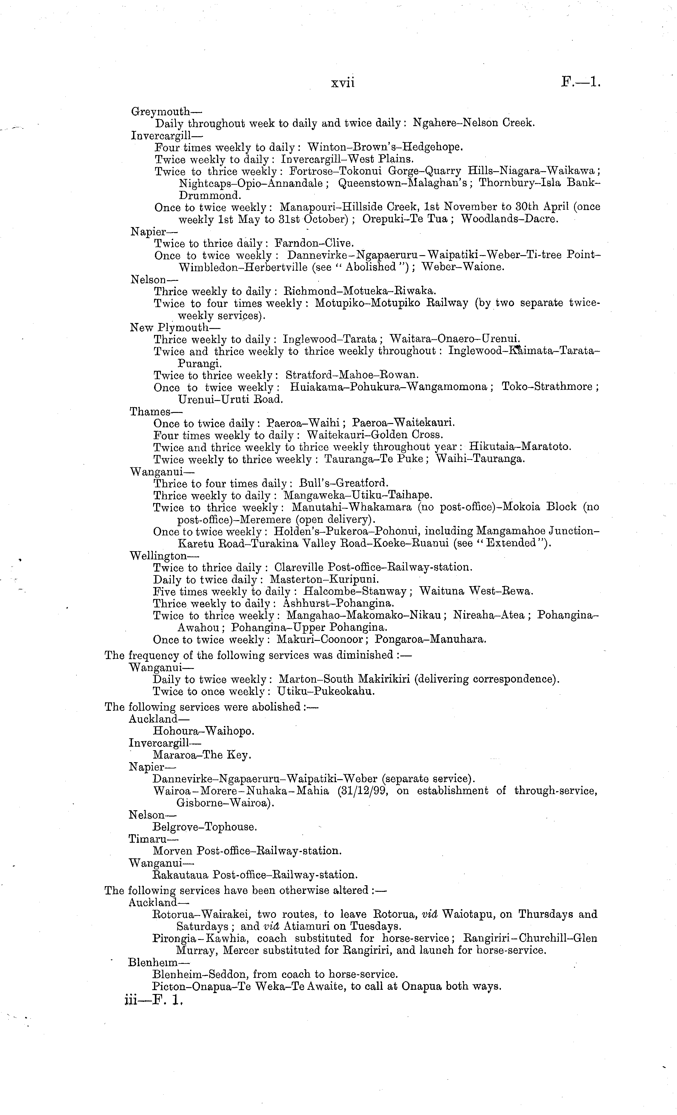Greymouth— Daily throughout week to daily and twice daily: Ngahere-Nelson Creek. Invereargill— Four times weekly to daily : Winton-Brown's-Hedgehope. Twice weekly to daily: Invereargill-West Plains. Twice to thrice weekly : Fortrose-Tokonui Gorge-Quarry Hills-Niagara-Waikawa; Nightcaps-Opio-Annandale ; Queenstown-Malaghan's ; Thornbury-Isla BankDrummond. Once to twice weekly : Manapouri-Hillside Creek, Ist November to 30th April (once weekly Ist May to 31st October) ; Orepuki-Te Tua; Woodlands-Dacre. Napier— Twice to thrice daily : Farndon-Clive. Once to twice weekly : Dannevirke-Ngapaeruru-Waipafciki-Weber-Ti-tree Point-Wimbledon-Herbertville (see " Abolished"); Weber-Waione. Nelson — Thrice weekly to daily : Bichmond-Motueka-Biwaka. Twice to four times weekly : Motupiko-Motupiko Railway (by two separate twiceweekly services). New Plymouth— Thrice weekly to daily : Inglewood-Tarata ; Waitara-Onaero-CJremii. Twice and thrice weekly to thrice weekly throughout: Inglewood-Kaimata-Tarata-Purangi. Twice to thrice weekly : Stratford-Mahoe-Bowan. Once to twice weekly : Huiakama-Pohukura-Wangamomona ; Toko-Strathmore ; Urenui-Uruti Boad. Thames— Once to twice daily : Paeroa-Waihi; Paeroa-Waitekauri. Four times weekly to daily : Waitekauri-Golden Gross. Twice and thrice weekly to thrice weekly throughout year: Hikutaia-Maratoto. Twice weekly to thrice weekly : Tauranga-Te Puke; Waihi-Tauranga. Wanganui— Thrice to four times daily : Bull's-Greatford. Thrice weekly to daily : Mangaweka-Utiku-Taihape. Twice to thrice weekly: Manutahi-Whakamara (no post-office)-Mokoia Block (no post-office)-Meremere (open delivery). Once to twice weekly : Holden's-Pukeroa-Pohonui, including Mangarnahoe JunctionKaretu Boad-Turakina Valley Boad-Koeke-Buanui (see "Extended"). Wellington— Twice to thrice daily : Clareville Post-office-Bailway-station. Daily to twice daily : Masterton-Kuripuni. Five times weekly to daily : Halcombe-Stanway; Waituna West-Bewa. Thrice weekly to daily : Ashhurst-Pohangina. Twice to thrice weekly : Mangahao-Makomako-Nikau; Nireaha-Atea ; PohanginaAwahou; Pohangina-Upper Pohangina. Once to twice weekly : Makuri-Coonoor; Pongaroa-Manuhara. The frequency of the following services was diminished :— Wanganui — Daily to twice weekly : Marton-South Makirikiri (delivering correspondence). Twice to once weekly : Utiku-Pukeokahu. The following services were abolished: — Auckland— Hohoura-Waihopo. Invereargill— Mararoa-The Key. Napier— Dannevirke-Ngapaeruru-Waipatiki-Weber (separate service). Wairoa-Morere-Nuhaka-Mahia (31/12/99, on establishment of through-service, Gisborne-Wairoa). Nelson — Belgrove-Tophouse. Timaru — Morven Post-office-Eailway-station. Wanganui— Bakautaua Post-office-Bailway-station. The following services have been otherwise altered : —■ Auckland —■ Botorua-Wairakei, two routes, to leave Botorua, vid Waiotapu, on Thursdays and Saturdays ; and vid Atiamuri on Tuesdays. Pirongia-Kawhia, coach substituted for horse-service; Ban giriri-Churchill-Glen Murray, Mercer substituted for Bangiriri, and launch for horse-service. Blenheim — Blenheim-Seddon, from coach to horse-service. Picton-Onapua-Te Weka-Te Awaite, to call at Onapua both ways. iii—F. 1.