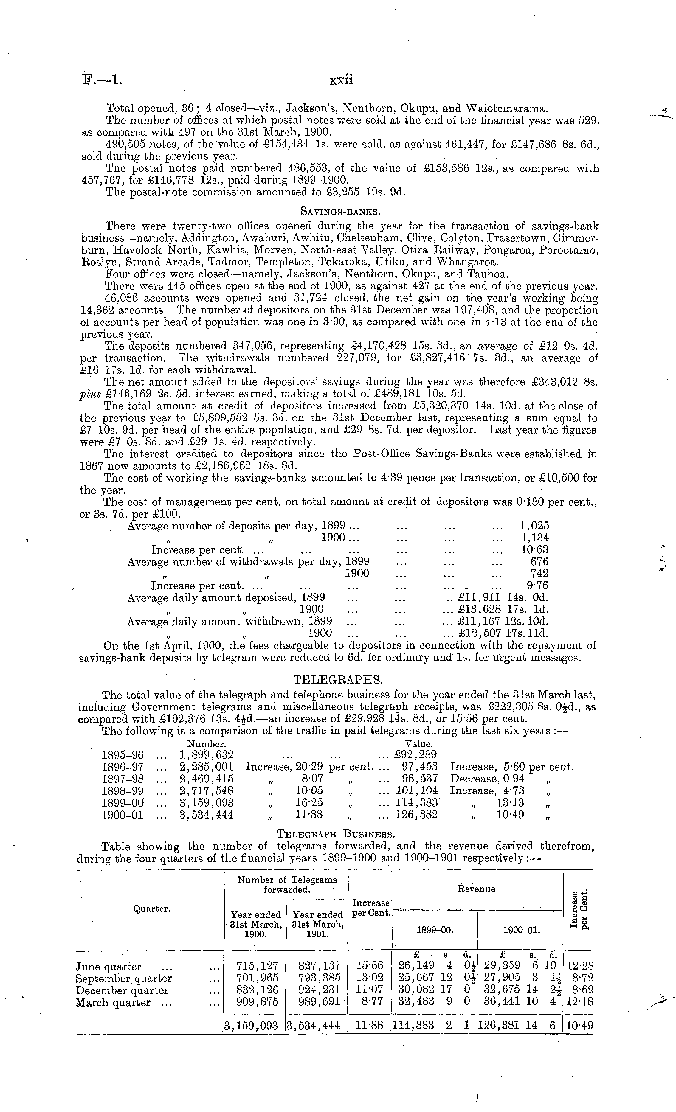 Total opened, 36 ; 4 closed—viz., Jackson's, Nenthorn, Okupu, and Waiotemarama. The number of offices at which postal notes were sold at the end of the financial year was 529, as compared with 497 on the 31st March, 1900. 490,505 notes, of the value of £154,434 Is. were sold, as against 461,447, for £147,686 Bs. 6d., sold during the previous year. The postal notes paid numbered 486,553, of the value of £153,586 125., as compared with 457,767, for £146,778 125., paid during 1899-1900. The postal-note commission amounted to £3,255 19s. 9d. Savings-banks. There were twenty-two offices opened during the year for the transaction of savings-bank business—namely, Addington, Awahuri, Awhitu, Cheltenham, Olive, Colyton, Frasertown, Gimmerburn, Havelock North, Kawhia, Morven, North-east Valley, Otira Railway, Pongaroa, Porootarao, Eoslyn, Strand Arcade, Tadmor, Templeton, Tokatoka, Utiku, and Whangaroa. Pour offices were closed—namely, Jackson's, Nenthorn, Okupu, and Tauhoa. There were 445 offices open at the end of 1900, as against 427 at the end of the previous year. 46,086 accounts were opened and 31,724 closed, the net gain on the year's working being 14,362 accounts. The number of depositors on the 31st December was 197,408, and the proportion of accounts per head of population was one in 3-90, as compared with one in 4-13 at the end of the previous year. The deposits numbered 347,056, representing £4,170,428 15s. 3d., an average of £12 os. 4d. per transaction. The withdrawals numbered 227,079, for £3,827,416' 7s. 3d., an average of £16 17s. Id. for each withdrawal. The net amount added to the depositors' savings during the year was therefore £343,012 Bs. plus £146,169 2s. sd. interest earned, making a total of £489,181 10s. sd. The total amount at credit of depositors increased from £5,320,370 14s. 10d. at the close of the previous year to £5,809,552 ss. 3d. on the 31st December last, representing a sum equal to £7 10s. 9d. per head of the entire population, and £29 Bs. 7d. per depositor. Last year the figures were £7 os. Bd. and £29 Is. 4d. respectively. The interest credited to depositors since the Post-Office Savings-Banks were established in 1867 now amounts to £2,186,962 18s. Bd. The cost of working the savings-banks amounted to 4-39 pence per transaction, or £10,500 for the year. The cost of management per cent, on total amount at credit of depositors was 0-180 per cent., or 3s. 7d. per £100. Average number of deposits per day, 1899 ... ... ... ... 1,025 1900... ... ... ... 1,134 Increase per cent. ... ... ... ... ... ... 10-63 Average number of withdrawals per day, 1899 ... ... ... 676 1900 ... ... ... 742 Increase per cent. ... ... ... ... ... ... 9-76 Average daily amount deposited, 1899 ... ... ... £11,911 14s. od. 1900 ... ... ... £13,628 17s. Id. Average daily amount withdrawn, 1899 ... ... ... £11,167 12s. 10d. 1900 ... ... ... £12,507 17s.lid. On the Ist April, 1900, the fees chargeable to depositors in connection with the repayment of savings-bank deposits by telegram were reduced to 6d. for ordinary and Is. for urgent messages. TELEGRAPHS. The total value of the telegraph and telephone business for the year ended the 31st March last, including Government telegrams and miscellaneous telegraph receipts, was £222,305 Bs. O-Jd., as compared with £192,376 13s. 4|d.—an increase of £29,928 14s. Bd., or 15-56 per cent. The following is a comparison of the traffic in paid telegrams during the last six years :— Number. Value. 1895-96 ... 1,899,632 ... ... ... £92,289 1896-97 ... 2,285,001 Increase, 20-29 per cent. ... 97,453 Increase, 5-60 per cent. 1897-98 ... 2,469,415 „ 8-07 „ ... 96,537 Decrease, 0-94 1898-99 ... 2,717,548 „ 10-05 „ ... 101,104 Increase, 4-73 1899-00 ... 3,159,093 „ 16-25 „ ... 114,383 „ 13-13 1900-01 ... 3,534,444 „ 11-88 „ ... 126,382 „ 1049 Tblbgkaph Business. Table showing the number of telegrams forwarded, and the revenue derived therefrom, during the four quarters of the financial years 1899-1900 and 1900-1901 respectively : —•