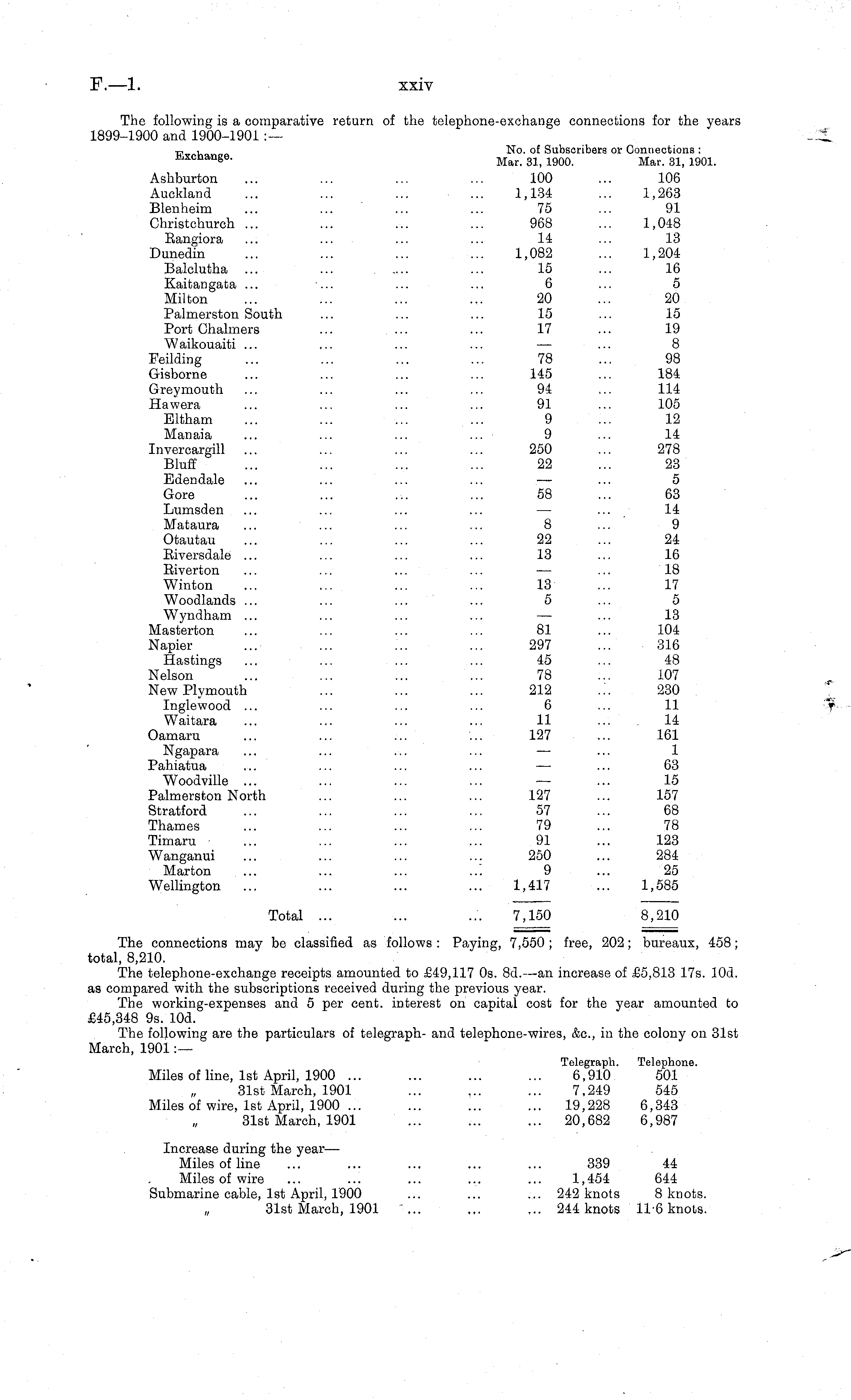 The following is a comparative return of the telephone-exchange connections for the years 1899-1900 and 1900-1901 :— -,-, , No. of Subscribers or Connections : Exchan § 6 - Mar. 31, 1900. Mar. 31, 1901. Ashburton ... ... ... ... 100 ... 106 Auckland ... ... ... ... 1,134 ... 1,263 Blenheim ... ... ... ... 75 ... 91 Christchurch ... ... ... ... 968 ... 1,048 Eangiora ... ... ... ... 14 ... 13 Dunedin ... ... ... ... 1,082 ... 1,204 Balclutha ... ... .... ... 15 ... 16 Kaitangata ... ... ... ... 6 ... 5 Milton ... ... ... ... 20 ... 20 Palmerston South ... ... ... 15 ... 15 Port Chalmers ... ... ... 17 ... 19 Waikouaiti ... ... ... ... — ... 8 Feilding ... ... ... ... 78 ... 98 Gisborne ... ... ... ... 145 ... 184 Greymouth ... ... ... ... 94 ... 114 Hawera ... ... ... ... 91 ... 105 Bltham ... ... ... ... 9 ... 12 Manaia ... ... ... ... 9 ... 14 Invercargill ... ... ... ... 250 ... 278 Bluff ... ... ... ... 22 ... 23 Edendale ... ... ... ... — ... 5 Gore ... ... ... ... 58 ... 63 Lumsden ... ... ... ... — ... ■ 14 Mataura ... ... ... ... 8 ... 9 Otautau ... ... ... ... 22 ... 24 Eiversdale ... ... ... ... 13 ... 16 Eiverton ... ... ... ... — ... 18 Winton ... ... ... ... 13 ... 17 Woodlands ... ... ... ... 5 ... 5 Wyndham ... ... ... ... ... 13 Masterton ... ... ... ... 81 ... 104 Napier ... ... ... ... 297 ... 316 Hastings ... ... ... ... 45 ... 48 Nelson ... ... ... ... 78 ... 107 New Plymouth ... ... ... 212 ..'. 230 Inglewood ... ... ... ... 6 ... 11 Waitara ... ... ... ... 11 ... . 14 Oamaru ... ... ... ... 127 ... 161 Ngapara ... ... ... ... — ... 1 Pahiatua ... ... ... ... — ... 63 Woodville ... ... ... ... — ... 15 Palmerston North ... ... ... 127 ... 157 Stratford ... ... ... ... 57 ... 68 Thames ... ... ... ... 79 ... 78 Timaru ... ... ... ... 91 ... 123 Wanganui ... ... ... ... 250 ... 284 Marton ... ... ... ... 9 ... 25 Wellington ... ... ... ... 1,417 ... 1,585 Total ... ... ..'. 7,150 8,210 The connections may be classified as follows : Paying, 7,550; free, 202; bureaux, 458; total, 8,210. The telephone-exchange receipts amounted to £49,117 os. Bd.—an increase of £5,813 17s. lOd. as compared with the subscriptions received during the previous year. The working-expenses and 5 per cent, interest on capital cost for the year amounted to £45,348 9s. lOd. The following are the particulars of telegraph- and telephone-wires, &c, in the colony on 31st March, 1901 :— Telegraph. Telephone. Miles of line, Ist April, 1900 ... ... ... ... 6,910 501 31st March, 1901 ... ... ... 7,249 545 Miles of wire, Ist April, 1900 ... ... ... ... 19,228 6,343 31st March, 1901 ... ... ... 20,682 6,987 Increase during the year —- Miles of line ... ... ... ... ... 339 44 Miles of wire ... ... ... ... ... 1,454 644 Submarine cable, Ist April, 1900 ... ... ... 242 knots 8 knots. 31st March, 1901 ' ... ... ... 244 knots 11-6 knots.