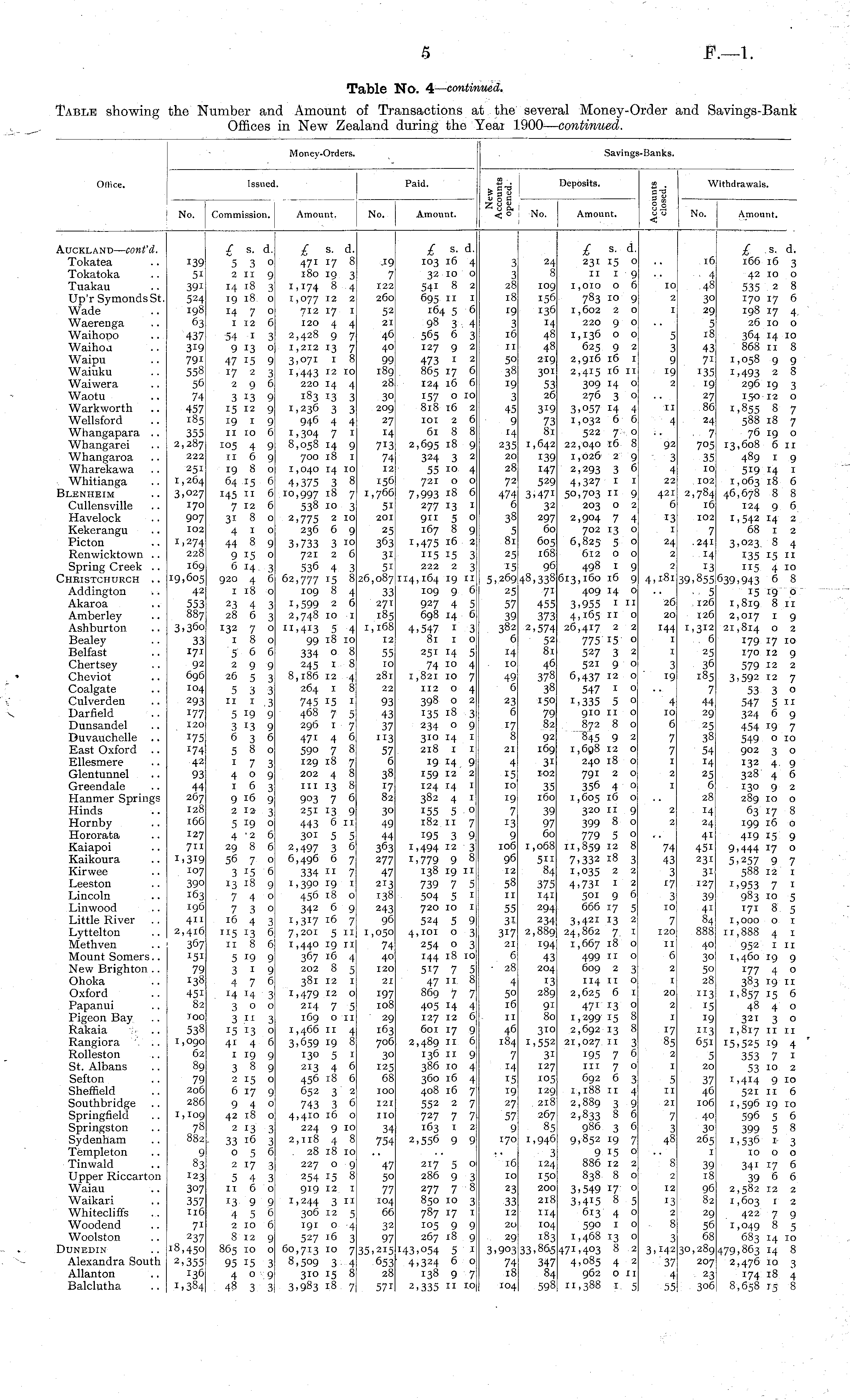 Table No. 4 — continued. Table showing the Number and Amount of Transactions at the several Money-Order and Savings-Bank Offices in New Zealand during the Year 1900— continued.
