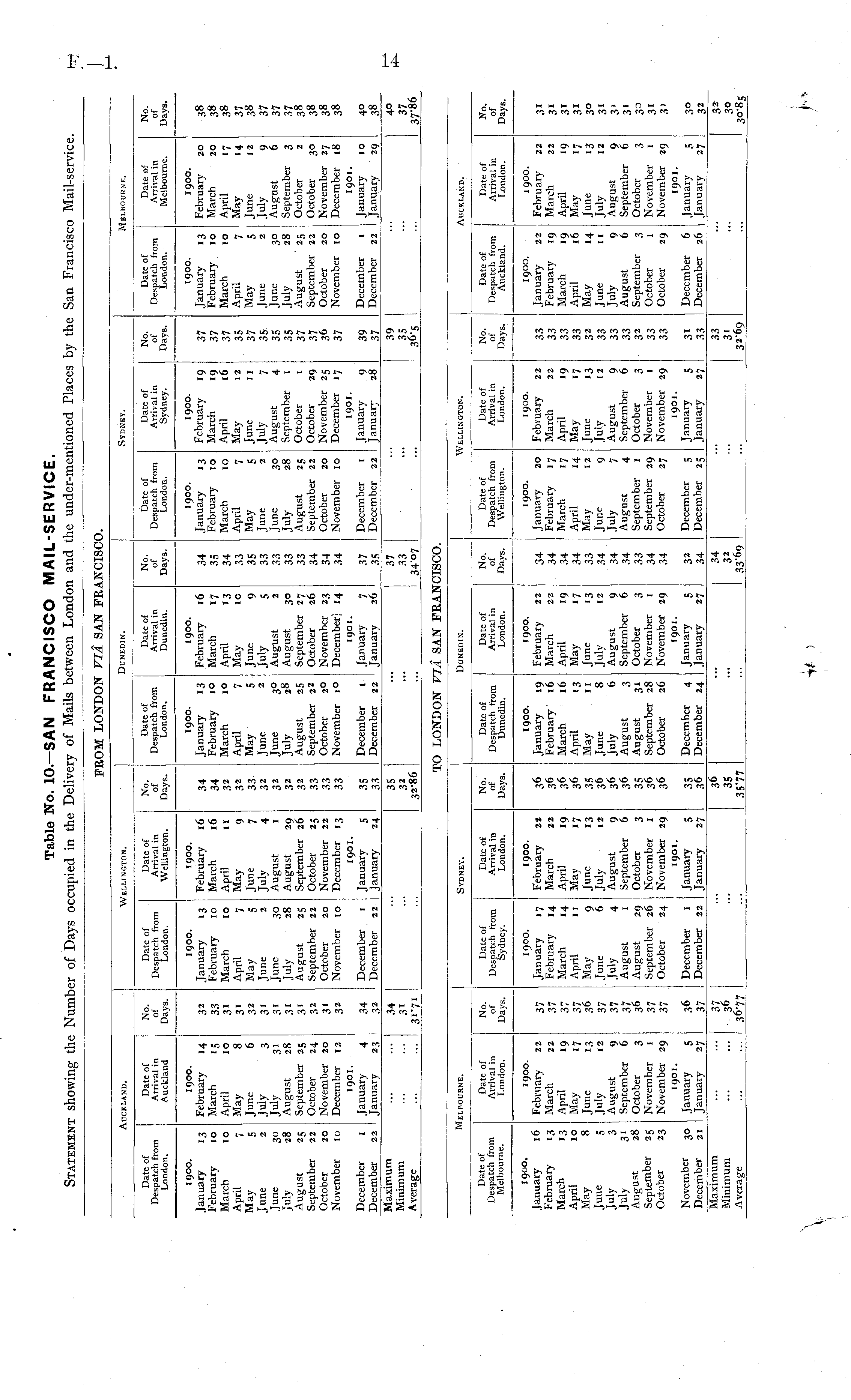 PROM LONDON VIA SAN FRANCISCO. Auckland. Wellington. DUNEDIN. Sydney. ELBOURNE. Date of Despatch from London. Date of Arrival in Auckland No. of Days. Date of Despatch from London. Date of Arrival in Wellington. No. of Days. Date of Despatch from London, Date of Arrival in Dunedin. No. of Days. Date of Despatch from London. Date of Arrival in Sydney. No. of Days. Date of Despatch from London. Date of Arrival in Melbourne. No. of Days. 1 — 1 • 1900. January February March April May June June July August September October November '3 IO IO 7 5 2 30 28 25 22 20 10 1900. February 14 March 15 April 10 May 8 June 6 July 3 July 31 August 28 September 25 October 24 November 20 December 12 33 3i 31 32 3i 31 31 3' 32 1900. January 13 February 10 March 10 April 7 May 5 June 2 June 30 July 28 August 25 September 22 I October 20 November 1 o 1900. February 16 March 16 April 11 May 9 June 7 July 4 August 1 August 29 September 26 October 25 November 22 December 13 34 34 32 32 32 32 32 32 33 33 33 1900. January 13 February 10 March 10 April 7 May 5 June 2 June 30 July 28 August 25 September 22 October 2° November 1° 1900. February 16 March 17 April 13 May 10 June 9 July 5 August 2 August 30 September 2 7 October 26 November 23 December] 14 34 35 34 33 35 33 33 33 33 34 34 34 1900. January 13 February 1 o March 10 April 7 May 5 June 2 June 30 July 28 August 25 September 22 October 20 November 10 1900. February 19 March 19 April 16 May 12 June 11 July 7 August 4 September 1 October 1 October 29 November 25 December 17 1901. January 9 January 28 37 37 37 35 37 35 35 35 37 37 36 37 1900. January 13 February 1 o March 1 o April 7 May 5 June 2 June 30 July 28 August 25 September 22 October 20 November 1 o 1900. ' February 20 March 20 April 17 May 14 June 12 July 9 August 6 September 3 October 2 October 30 November 27 December 18 38 38 38 37 38 37 37 37 38 38 38 38 December December 1 22 1901. January 4 January 23 34 32 I December 1 ' December 22 1901. January 5 January 24 35 33 December 1 December 22 190 1. January 7 January 26 37 35 December 1 December 22 39 37 December 1 December 2 2 190 1. January 10 January 29 40 38 Maximum Minimum Average 34 31 31171 35 32 32-86 37 33 34'°7 39 40 37 37-86 TO LONDON VIA SAN FRANCISCO. Melbourne. Sydney. Dunedin. ELLINGTON. Auckland. Date of Despatch from Melbourne. Date of Arrival in London. No. of Days. Date of Despatch from Sydney. Date of Arrival in London. No. of Days. Date of Despatch from Dunedin. Date of Arrival in London. No. of Days. Date of Despatch from Wellington. Date of Arrival in London. No. of Days. Date of Despatch from Auckland. Date of Arrival in London. No. of Days. ' 1900. January February March April May June July July August September October 16 •3 13 10 8 5 3 3' 28 25 23 1900. February 2 2 March 22 April 19 May 17 June 13 July 12 August 9 September 6 October 3 November i November 29 190 1. January 5 January 27 37 37 37 37 36 37 37 37 36 37 37 1900. January 17 February 14 March 14 April 11 May 9 June 6 July 4 August 1 August 29 September 26 October 24 1900. February 2 2 March 22 April 19 May 17 June 13 July 12 August 9 September 6 October 3 November 1 November 29 190 1. January 5 January 27 36 36 36 ! 35 36 36 35 36 36 1900. January 19 February 16 March 16 April 13 May 11 June 8 July 6 August 3 August 31 September 28 October 26 1900. February 22 March 22 April 19 May 17 June 13 July 12 August 9 September 6 October 3 November 1 November 29 1901. January 5 January 27 34 34 34 34 33 34 34 34 33 34 34 1900. January 20 February 17 March 17 April 14 May 12 June 9 July 7 August 4 September 1 September 29 October 27 1900. February 22 March 22 April 19 May 17 June 13 July 12 August 9 September 6 October 3 November 1 November 29 1901. January 5 January 27 33 33 33 33 32 33 33 33 32 33 33 January 22 February 19 March 19 April 16 May 14 June 11 July 9 August 6 September 3 October 1 October 29 19OO. February 22 March 22 April 19 May 17 June 13 July 12 August 9 September 6 October 3 November 1 November 29 31 31 31 31 3° 3i 3" 31 33 3' 31 November December 3° 21 36 37 December 1 December 22 35 36 December 4 December 24 32 34 December 5 December 25 3i 33 December 6 December 26 1901. January 5 January 27 3° 32 Maximum Minimum Average 37 36 36 35 3577 34 32 33^9 33 3i 32-69 32 3° 3°-85