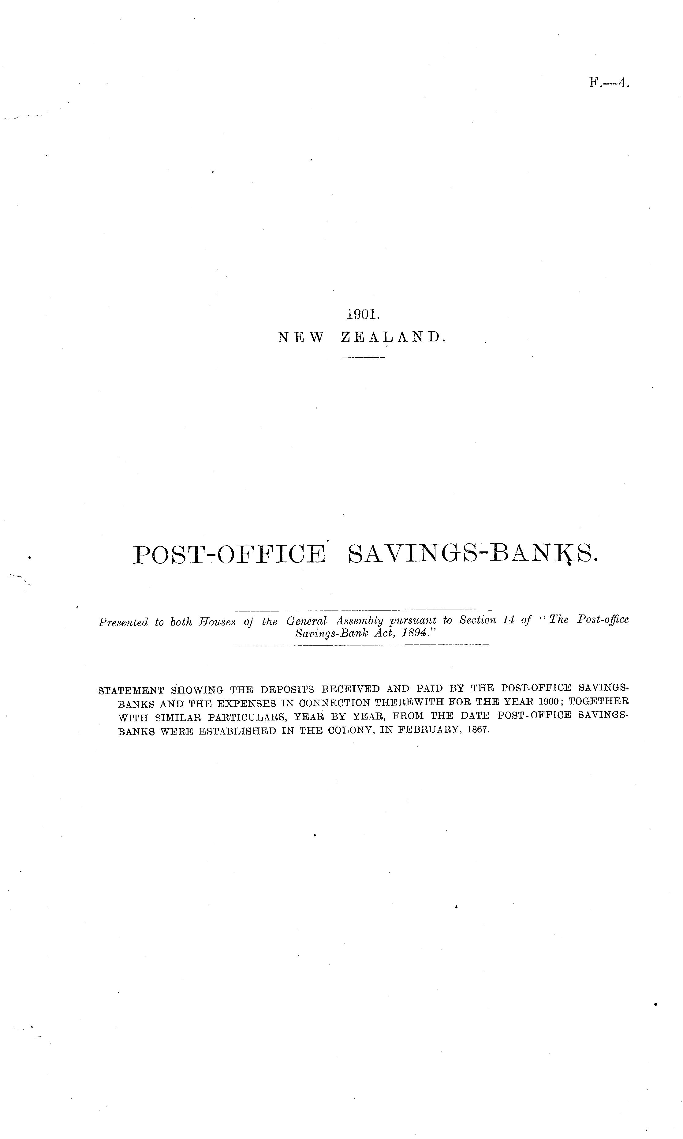 STATEMENT SHOWING THE DEPOSITS RECEIVED AND PAID BY THE POST-OFFICE SAVINGSBANKS AND THE EXPENSES IN CONNECTION THEREWITH FOR THE YEAR 1900; TOGETHER WITH SIMILAR PARTICULARS, YEAR BY YEAR, FROM THE DATE POST-OFFICE SAVINGSBANKS WERE ESTABLISHED IN THE COLONY, IN FEBRUARY, 1867.