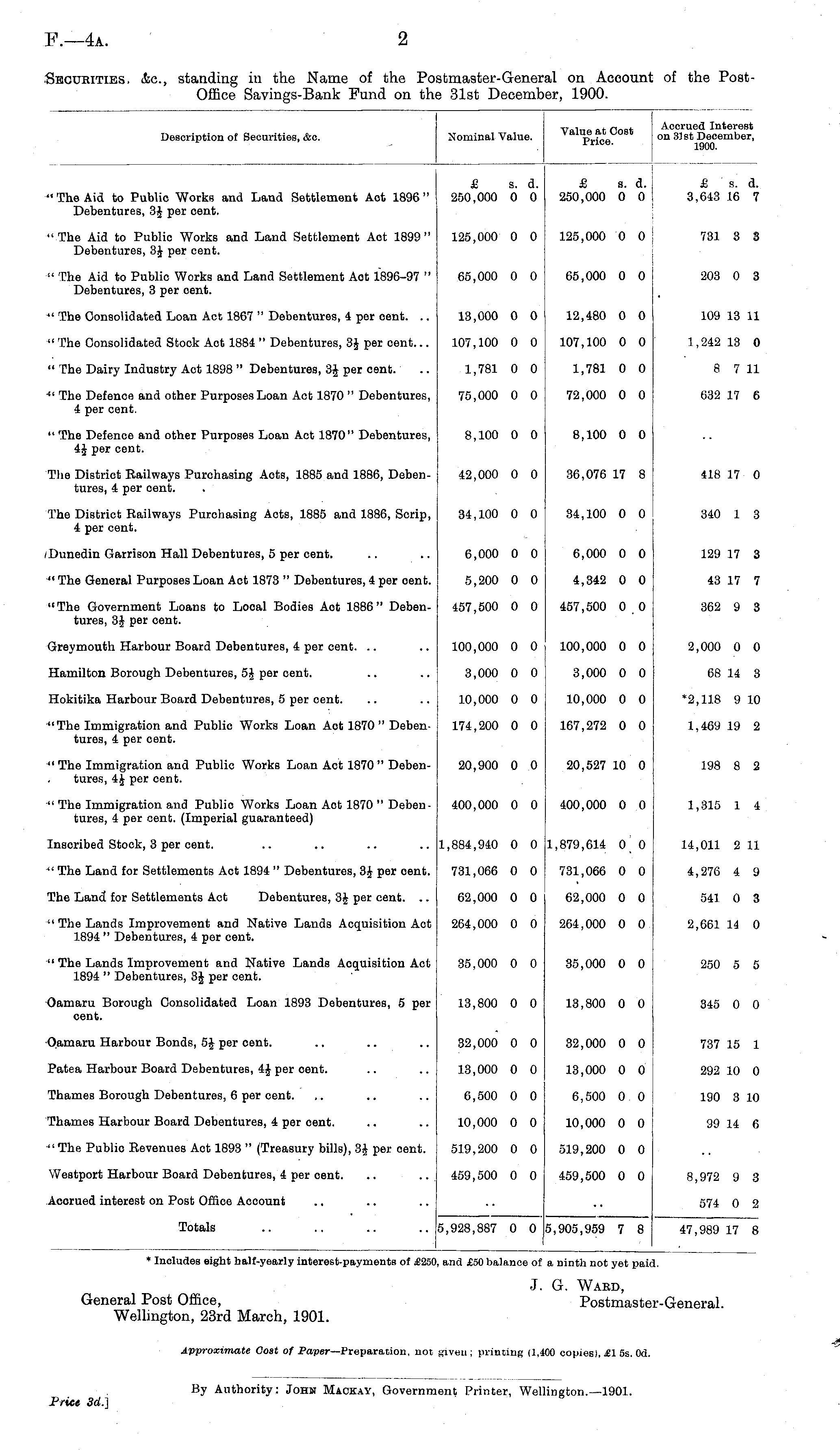 Description of Securities, &c. Nominal Value. Value at Cost Price. Accrued Interest on 31st December, 1900. "The Aid to Public Works and Land Settlement Aot 1896" Debentures, 3J per cent. £ s. d. 250,000 0 0 £ s. d. 250,000 0 0 £ s. d. 3,643 16 7 "The Aid to Public Works and Land Settlement Act 1899" Debentures, 3J per cent. 125,000 0 0 125,000 0 0 731 3 3 ■" The Aid to Public Works and Land Settlement Aot 1896-97 " Debentures, 3 per oent. 65,000 0 0 65,000 0 0 203 0 3 " The Consolidated Loan Act 1867 " Debentures, 4 per cent. .. 13,000 0 0 12,480 0 0 109 13 11 " The Consolidated Stock Act 1884 " Debentures, 3J per cent... 107,100 0 0 107,100 0 0 1,242 13 0 " The Dairy Industry Act 1898 " Debentures, 3J per cent. 1,781 0 0 1,781 0 0 8 7 11 " The Defence and other Purposes Loan Act 1870 " Debentures, 4 per cent. 75,000 0 0 72,000 0 0 632 17 6 " The Defence and other Purposes Loan Act 1870" Debentures, 4J per cent. 8,100 0 0 8,100 0 0 The District Railways Purchasing Acts, 1885 and 1886, Debentures, 4 per cent. 42,000 0 0 36,076 17 8 418 17 0 The District Railways Purchasing Acts, 1885 and 1886, Scrip, 4 per cent. 34,100 0 0 34,100 0 0 340 1 3 'Dunedin Garrison Hall Debentures, 5 per cent. 6,000 0 0 6,000 0 0 129 17 3 " The General Purposes Loan Act 1873 " Debentures, 4 per oent. 5,200 0 0 4,342 0 0 43 17 7 "The Government Loans to Looal Bodies Act 1886" Debentures, 3J per cent. 457,500 0 0 457,500 0 0 362 9 3 Greymouth Harbour Board Debentures, 4 per cent. 100,000 0 0 100,000 0 0 2,000 0 0 Hamilton Borough Debentures, 5_ per cent. 3,000 0 0 3,000 0 0 68 14 3 Hokitika Harbour Board Debentures, 5 per cent. 10,000 0 0 10,000 0 0 *2,118 9 10 "The Immigration and Public Works Loan Aot 1870 " Debentures, 4 per cent. 174,200 0 0 167,272 0 0 1,469 19 2 " The Immigration and Public Works Loan Act 1870 " Debentures, 4J per cent. 20,900 0 0 20,527 10 0 198 8 2 " The Immigration and Public Works Loan Act 1870 " Debentures, 4 per cent. (Imperial guaranteed) 400,000 0 0 400,000 0 0 1,315 1 4 Inscribed Stock, 3 per cent. 1,884,940 0 0 1,879,614 0 0 14,011 2 11 " The Land for Settlements Act 1894 " Debentures, 3J per oent. 731,066 0 0 731,066 0 0 4,276 4 9 The Land for Settlements Act Debentures, 3J per cent. .. 62,000 0 0 62,000 0 0 541 0 3 " The Lands Improvement and Native Lands Acquisition Act 1894 " Debentures, 4 per cent. 264,000 0 0 264,000 0 0 2,661 1. 0 " The Lands Improvement and Native Lands Acquisition Act 1894 " Debentures, 3J per cent. 35,000 0 0 35,000 0 0 250 5 5 Oamaru Borough Consolidated Loan 1893 Debentures, 5 per cent. 13,800 0 0 13,800 0 0 345 0 0 Oamaru Harbour Bonds, 5J per cent. 32,000 0 0 32,000 0 0 737 15 1 Patea Harbour Board Debentures, 4J per oent. 13,000 0 0 13,000 0 0 292 10 0 Thames Borough Debentures, 6 per cent. 6,500 0 0 6,500 0 0 190 3 10 Thames Harbour Board Debentures, 4 per cent. 10,000 0 0 10,000 0 0 99 14 6 "The Public Revenues Act 1893 " (Treasury bills), 3J per cent. 519,200 0 0 519,200 0 0 Westport Harbour Board Debentures, 4 per oent. 459,500 0 0 459,500 0 0 8,972 9 3 Accrued interest on Post Office Account 574 0 2 Totals 5,928,887 0 0 5,905,959 7 8 47,989 17 8 * Includes eight half-yearly interest-payments of £250, and £50 balance of a ninth not yet paid.