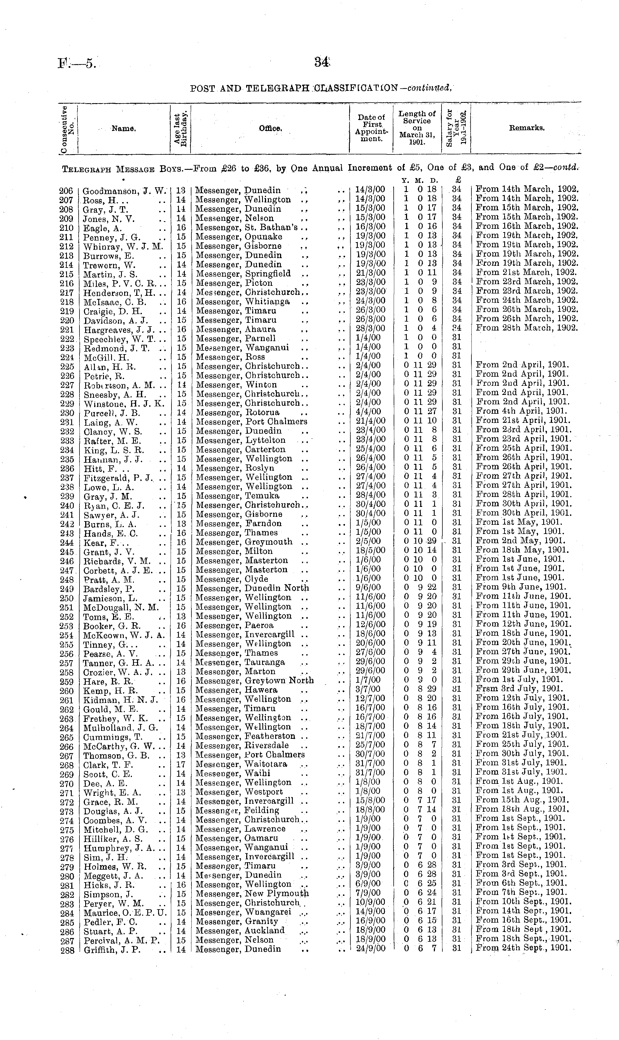 © > Id' ©is o o Name. 43 >, ©-S on* <a Office. Date of L s e e n r g * e of First on Appoint- M , 31 ment. mi o § _ * Oi >>d rH * © I, d o* 02 w Remarks. Tei .egraph Message Boys.--From £26 to £36, by One Annual [norement of £5, Oni i of £? , and One of £2— contd. 206 207 208 209 210 211 212 213 214 215 216 217 218 219 220 221 222 223 221 225 226 227 228 229 230 231 232 233 234 235 236 237 238 239 240 241 242 24.3 244 245 246 247. 248 249 250 251 252 253 254 255 256 257 258 259 260 261 262 263 264 265 266 267 268 269 270 271 272 273 274 275 276 277 278 279 280 281 282 283 284 285 286 287 288 Goodmanson, J. W. 13 Boss, H. .. .. 14 Gray, J. T. .. 14 Jones, N. V. .. 14 Eagle, A. ..16 Penney, J. G. .. 15 Wbinray, W. J. M. 15 Burrows, E. 15 Trewern, W. .. 14 Martin, J. S. .. 14 Miles, P. V. C B. .. 15 Henderson, T, H. .. 14 Mclsaao, C B. .. 16 Craigie, D. H. .. 14 Davidson, A. J. .. 15 Hargreaves, J. J. .. 16 Speechley, W. T. .. 15 Badmond, J. T. .. 15 McGill.H. .. 15 AlUn,H. B. .. 15 Petrie, B. .. 15 Robertson, A. M. .. 14 Sneesby, A. H. .. 15 Winstone, H. J. K. 15 Puroell, J. B. .. 14 Laing, AW. .. 14 Clancy, W. S. .. 15 Rafter, M. E. .. 15 King, L. S. R. .. 15 Hannan, J. J. .. 15 Hitt, F. .. ..14 Fitzgerald, P. J. .. 15 Lowe, L. A. 14 Gray, J.M. .. 15 Rjan, C.E.J. .. 15 Sawyer, A. J. .. 15 Burns, L. A. .. 13 Hands, E. 0. .. 16 Kear, F. .. .. 16 Grant, J. V. .. 15 Richards, V. M. .. 15 Corbett, A. J. E. .. 15 Pratt, A. M. .. 15 Bardsley, P. .. 15 Jamieson, L. 15 McDougall, N. M. 15 Toms, E. E. ,. 13 Booker, G. R. .. 16 McKeown, W. J. A. 14 Tinney, G 14 Pearse, A. V. .. 15 Tanner, G. H. A. .. 14 Crozier.W. A.J. .. 13 Hare, R. R. .. 16 Kemp, H. R. .. 15 Kidman, H. N. J. 16 Gould, M. E. .. 14 Frethey, W. K. .. 15 Mulhoiiand, J. G. 14 Cummings, T. 15 McCarthy, G. W. .. 14 Thomson, G. B. .. 13 Clark, T. F. .. 17 Scott, C. E. .. 14 Dee, A. E. .. 14 Wright, E. A. .. 1.3 Grace, R. M. .. 14 Douglas, A. J. .. 15 Coombes, A. V. .. 14 Mitchell, D. G. .. 14 Hilliker, A. S. .. 15 Humphrey, J. A. .. 14 Sim, J. H. .. 14 Holmes, W. R. .. 15 Meggett, J. A. .. 14 Hicks, J. R. .. 16 Simpson, J. 15 Peryer, W. M. .. 15 Maurice, 0. E. P. U. 15 Pedler, F. 0. .. 14 Stuart, A. P. .. 14 Percival, A. M. P. 15 Griffith, J. P. .. 14 Messenger, Dunedin ,", Messenger, Wellington ., , • Messenger, Dunedin Messenger, Nelson ,. ,. Messenger, St. Bathan's .. ,. Messenger, Opunake .. ., Messenger, Gisborne ,, ., Messenger, Dunedin Messenger, Dunedin Messenger, Springfield Messenger, Picton Messenger, Christchurch.. Messenger, Whitianga Messenger, Timaru Messenger, Timaru Messenger, Ahaura Messenger, Parnell Messenger, Wanganui Messenger, Boss Messenger, Christchurch.. Messenger, Cb ristchurch Messenger, Winton Messenger, Christchurch.. Messenger, Christchurch.. Messenger, Botorua Messenger, Port Chalmers Messenger, Dunedin Messenger, Lyttelton Messenger, Carterton Messenger, Wellington Messenger, Boslyn Messenger, Wellington ... Messenger, Wellington Messenger, Temuka Messenger, Christchuroh.. Messenger, Gisborne Messenger, Farndon Messenger, Thames Messenger, Greymouth Messenger, Milton Messenger, Masterton Messenger, Masterton Messenger, Clyde Messenger, Dunedin North Messenger, Wellington Messenger, Wellington Messenger, Wellington Messenger, Paeroa Messenger, Invercargill Messenger, Wellington .. Messenger, Thames Messenger, Tauranga Messenger, Marton Messenger, Greytown North Messenger, Hawera Messenger, Wellington Messenger, Timaru Messenger, Wellington .. Messenger, Wellington Messenger, Featherston Messenger, Biversdale Messenger, Port Chalmers Messenger, Waitotara Messenger, Waihi Messenger, Wellington Messenger, Westport Messenger, Invercargill Messenger, Feilding Messenger, Christchurch.. Messenger, Lawrence Messenger, Oamaru Messenger, Wanganui Messenger, Invercargill .. Messenger, Timaru Messenger, Dunedin Messenger, Wellington ... Messenger, New Plymouth Messenger, Christchurch Messenger, Wriangarei .... Messenger, Granity Messenger, Auckland Messenger, Nelson Messenger, Dunedin 14/3/00 14/3/00 15/3/00 15/3/00 16/3/00 19/3/00 19/3/00 19/3/00 19/3/00 21/3/00 23/3/00 23/3/00 24/3/00 26/3/00 26/3/00 28/3/00 1/4/00 1/4/00 1/4/00 2/4/00 2/4/00 2/4/00 2/4/00 2/4/00 4/4/00 21/4/00 23/4/00 23/4/00 25/4/00 26/4/00 26/4/00 27/4/00 27/4/00 28/4/00 30/4/00 30/4/00 1/5/00 1/5/00 2/5/00 18/5/00 1/6/00 1/6/00 1/6/00 9/6/00 11/6/00 11/6/00 11/6/00 12/6/00 18/6/00 20/6/00 27/6/00 29/6/00 29/6/00 1/7/00 3/7/00 12/7/00 16/7/00 16/7/00 18/7/00 21/7/00 25/7/00 30/7/00 31/7/00 31/7/00 1/8/00 1/8/00 15/8/00 18/8/00 1/9/00 1/9/00 1/9/00 1/9/00 1/9/00 3/9/00 3/9/00 6/9/00 7/9/00 10/9/00 14/9/00 16/9/00 18/9/00 18/9/00 24/9/00 Y. M. D. 1 0 18 1 0 18 1 0 17 1 0 17 1 0 16 1 0 13 1 0 13 1 0 13 1 0 13 1 0 11 10 9 10 9 10 8 10 6 10 6 10 4 10 0 10 0 10 0 0 11 29 0 11 29 0 11 29 0 11 29 0 11 29 0 11 27 0 11 10 0 11 8 0 11 8 0 11 6 0 11 5 0 11 5 0 11 4 0 11 4 0 11 3 0 11 1 0 11 1 0 11 0 0 11 0 0 10 29 0 10 14 0 10 0 0 10 0 0 10 0 0 9 22 0 9 20 0 9 20 0 9 20 0 9 19 0 9 13 0 9 11 0 9 4 0 9 2 0 9 2 0 9 0 0 8 29 0 8 20 0 8 16 0 8 16 0 8 14 0 8 11 0 8 7 0 8 2 0 8 1 0 8 1 0 8 0 0 8 0 0 7 17 0 7 14 0 7 0 0 7 0 0 7 0 0 7 0 0 7 0 0 6 28 0 6 28 C 6 25 0 6 24 0 6 21 0 6 17 0 6 15 0 6 13 0 6 13 0 6 7 £ 34 34 34 34 34 34 34 34 34 34 34 34 34 34 34 34 31 31 31 31 31 31 31 31 31 31 31 31 31 31 31 31 31 31 31 31 31 31 31 31 31 31 31 31 31 31 31 31 31 31 31 31 31 31 31 31 31 31 31 31 31 31 31 31 31 31 31 31 31 31 31 31 31 31 31 31 31 31 31 31 31 31 31 From 14th Maroh, 1902. From 14th March, 1902. From 15th March, 1902. From 15th March, 1902. From 16th March, 1902. From 19th March, 1902. From 19tU March, 1902. From 19th Maroh, 1902. From 19th March, 1902. From 21st March, 1902. From 23rd March, 1902. From 23rd March, 1902. From 24th March, 1902. From 26th Maroh, 1902. From 26th March, 1902. From 28th March, 1902. From 2nd April, 1901. From 2nd April, 1901. From 2nd April, 1901. From 2nd April, 1901. From 2nd April, 1901. From 4th April, 1901. From 2