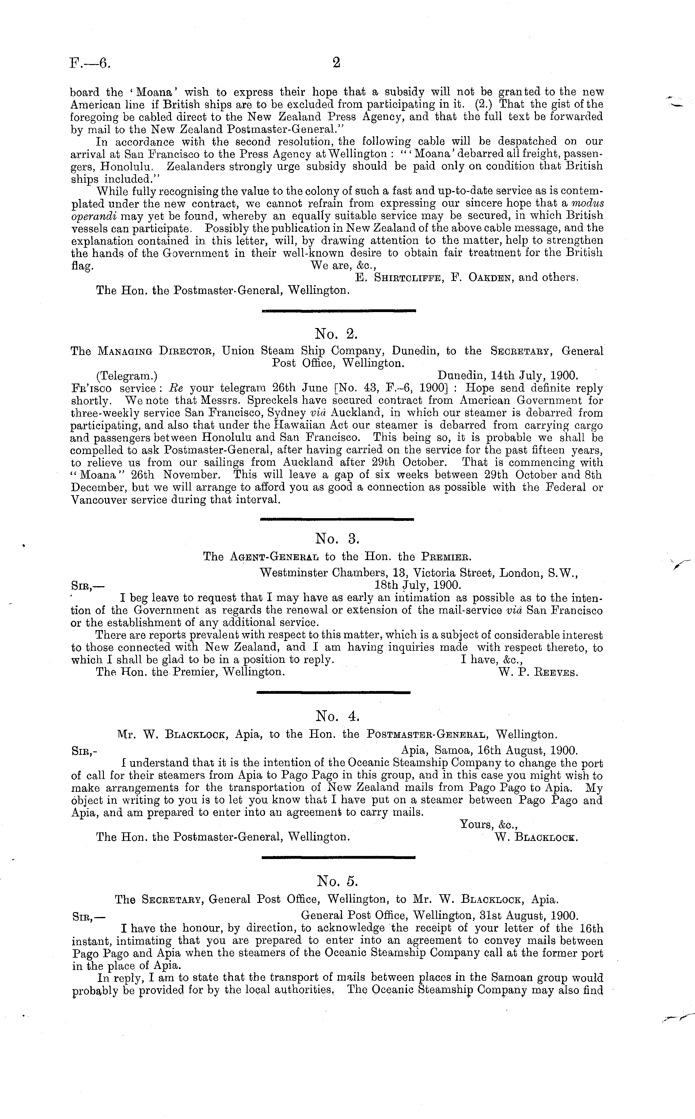 No. 5. The Secretary, General Post Office, Wellington, to Mr. W. Blacklock, Apia. Sir,— General Post Office, Wellington, 31st August, 1900. I have the honour, by direction, to acknowledge the receipt of your letter of the 16th instant, intimating that you are prepared to enter into an agreement to convey mails between Pago Pago and Apia when the steamers of the Oceanic Steamship Company call at the former port in the place of Apia. In reply, I am to state that the transport of mails between places in the Samoan group would probably be provided for by the local authorities, The Oceanic Steamship Company may also find