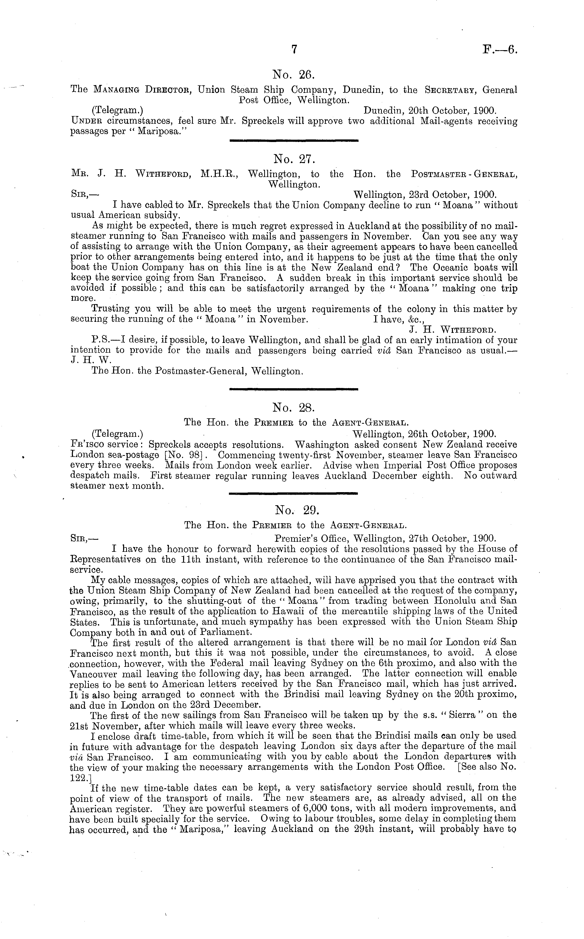 No. 29. The Hon. the Premier to the Agent-General. Sir,— Premier's Office, Wellington, 27th October, 1900. I have the honour to forward herewith copies of the resolutions passed by the House of Representatives on the 11th instant, with reference to the continuance of the San Francisco mailservice. My cable messages, copies of which are attached, will have apprised you that the contract with the Union Steam Ship Company of New Zealand had been cancelled at the request of the company, owing, primarily, to the shutting-out of the " Moana " from trading between Honolulu and San Francisco, as the result of the application to Hawaii of the mercantile shipping laws of the United States. This is unfortunate, and much sympathy has been expressed with the Union Steam Ship Company both in and out of Parliament. The first result of the altered arrangement is that there will be no mail for London vid San Francisco next month, but this it was not possible, under the circumstances, to avoid. A close connection, however, with the Federal mail leaving Sydney on the 6th proximo, and also with the Vancouver mail leaving the following day, has been arranged. The latter connection will enable replies to be sent to American letters received by the San Francisco mail, which has just arrived. It is also being arranged to connect with the Brindisi mail leaving Sydney on the 20th proximo, and due in London on the 23rd December. The first of the new sailings from San Francisco will be taken up by the s.s. " Sierra " on the 21st November, after which mails will leave every three weeks. I enclose draft time-table, from which it will be seen that the Brindisi mails can only be used in future with advantage for the despatch leaving London six days after the departure of the mail via San Francisco. I am communicating with you by cable about the London departures with the view of your making the necessary arrangements with the London Post Office. [See also No. 122.] If the new time-table dates can be kept, a very satisfactory service should result, from the point of view of the transport of mails. The new steamers are, as already advised, all on the American register. They are powerful steamers of 6,000 tons, with all modern improvements, and have been built specially for the service. Owing to labour troubles, some delay in completing them has occurred, and the " Mariposa," leaving Auckland on the 29th instant, will probably have to