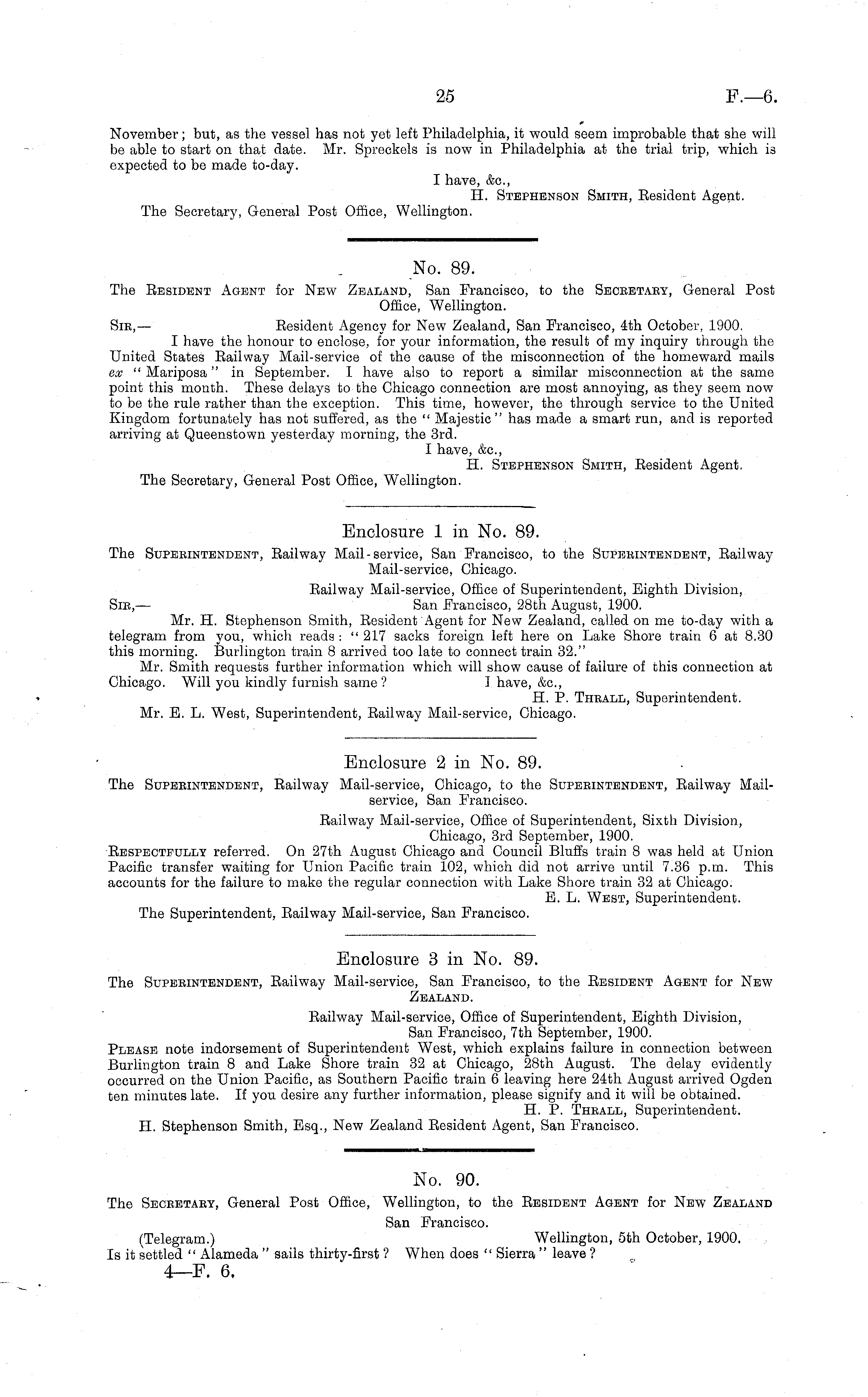 Enclosure 3 in No. 89. The Superintendent, Railway Mail-service, San Francisco, to the Resident Agent for New Zealand. Railway Mail-service, Office of Superintendent, Eighth Division, San Francisco, 7th September, 1900. Please note indorsement of Superintendent West, which explains failure in connection between Burlington train 8 and Lake Shore train 32 at Chicago, 28th August. The delay evidently occurred on the Union Pacific, as Southern Pacific train 6 leaving here 24th August arrived Ogden ten minutes late. If you desire any further information, please signify and it will be obtained. H. P. Thrall, Superintendent. H. Stephenson Smith, Esq., New Zealand Resident Agent, San Prancisco.
