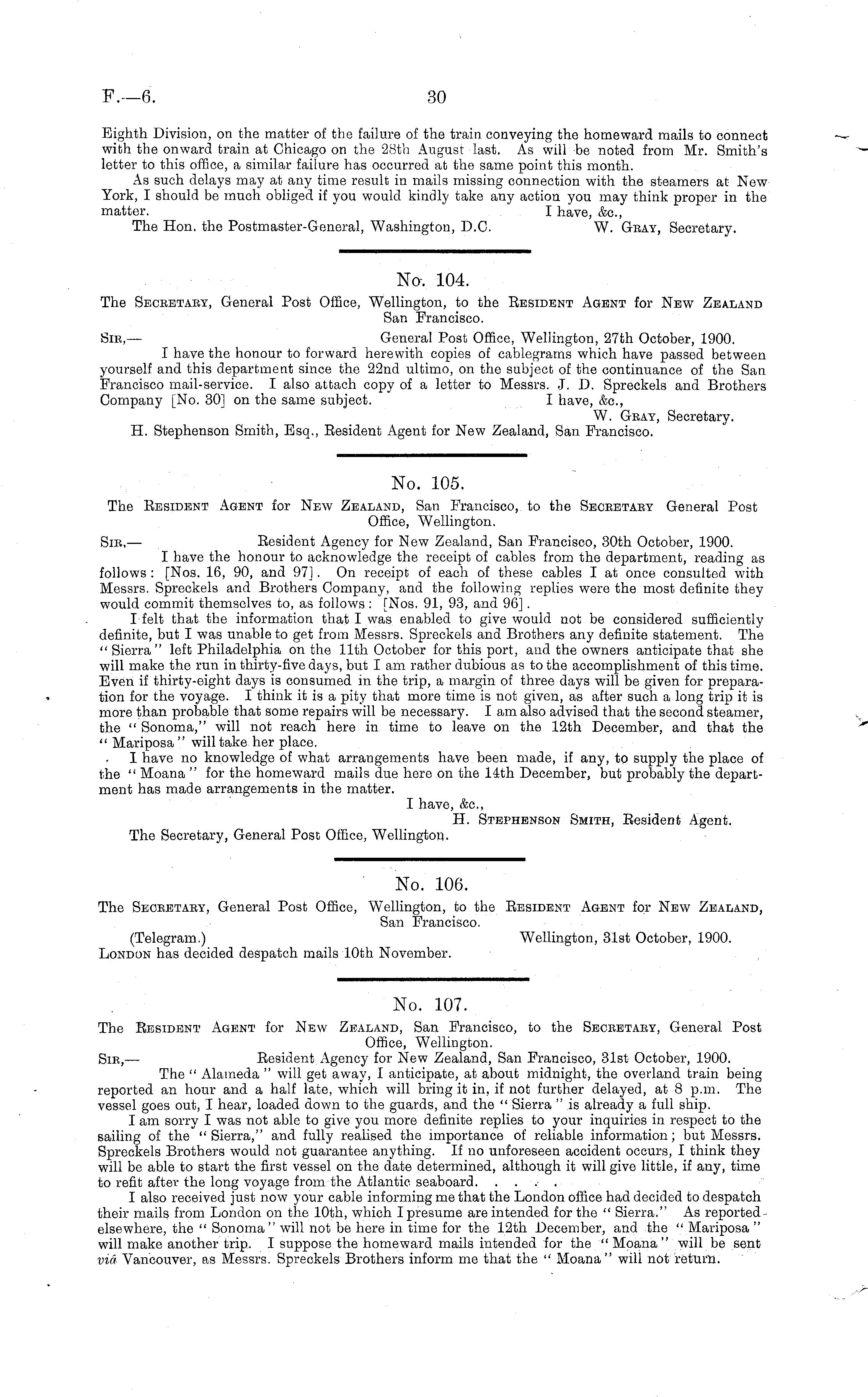 No. 107. The Resident Agent for New Zealand, San Francisco, to the Secretary, General Post Office, Wellington. Sir, — Resident Agency for New Zealand, San Francisco, 31st October, 1900. The " Alameda " will get away, I anticipate, at about midnight, the overland train being reported an hour and a half late, which will bring it in, if not further delayed, at 8 p.m. The vessel goes out, I hear, loaded down to the guards, and the " Sierra " is already a full ship. I am sorry I was not able to give you more definite replies to your inquiries in respect to the sailing of the "Sierra," and fully realised the importance of reliable information; but Messrs. Spreckels Brothers would not guarantee anything. If no unforeseen accident occurs, I think they will be able to start the first vessel on the date determined, although it will give little, if any, time to refit after the long voyage from the Atlantic seaboard. .... I also received just now your cable informing me that the London office had decided to despatch their mails from London on the 10th, which Ipresume are intended for the " Sierra." As reported - elsewhere, the " Sonoma" will not be here in time for the 12th December, and the " Mariposa " will make another trip. I suppose the homeward mails intended for the "Moana" will be sent vid Vancouver, as Messrs. Spreckels Brothers inform me that the " Moana" will not return.