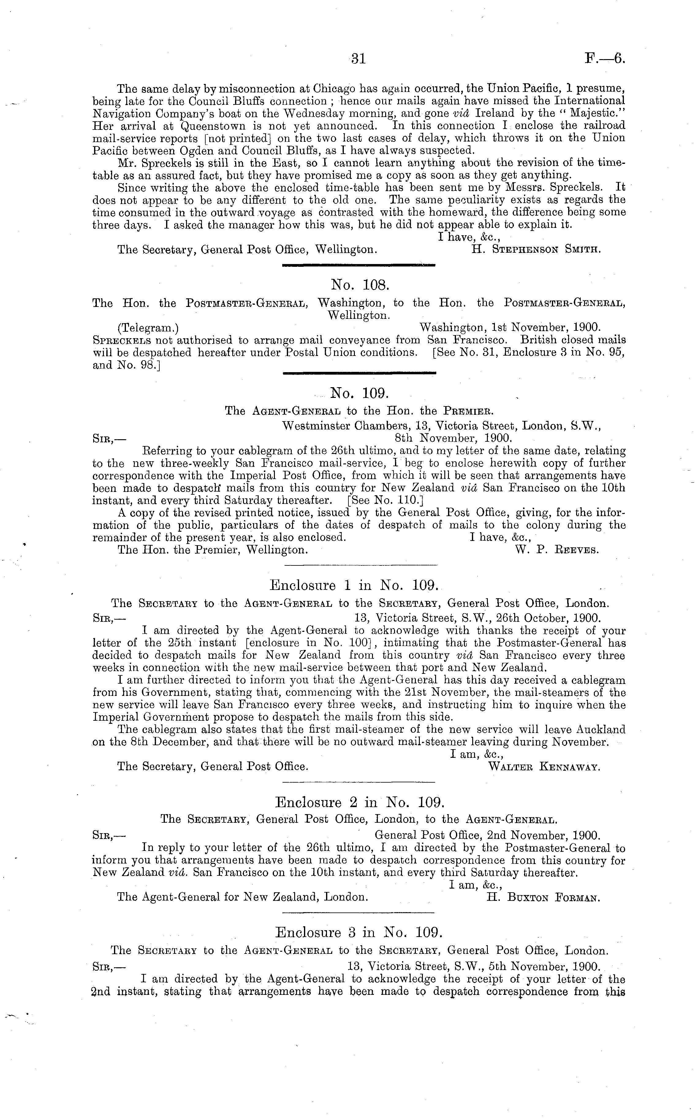 Enclosure 2 in No. 109. The Secretary, General Post Office, London, to the Agent-General. Sir, — General Post Office, 2nd November, 1900. In reply to your letter of the 26th ultimo, I am directed by the Postmaster-General to inform you that arrangements have been made to despatch correspondence from this country for New Zealand vid. San Francisco on the 10th instant, and every third Saturday thereafter. I am, &c, The Agent-General for New Zealand, London. H. Buxton Forman.
