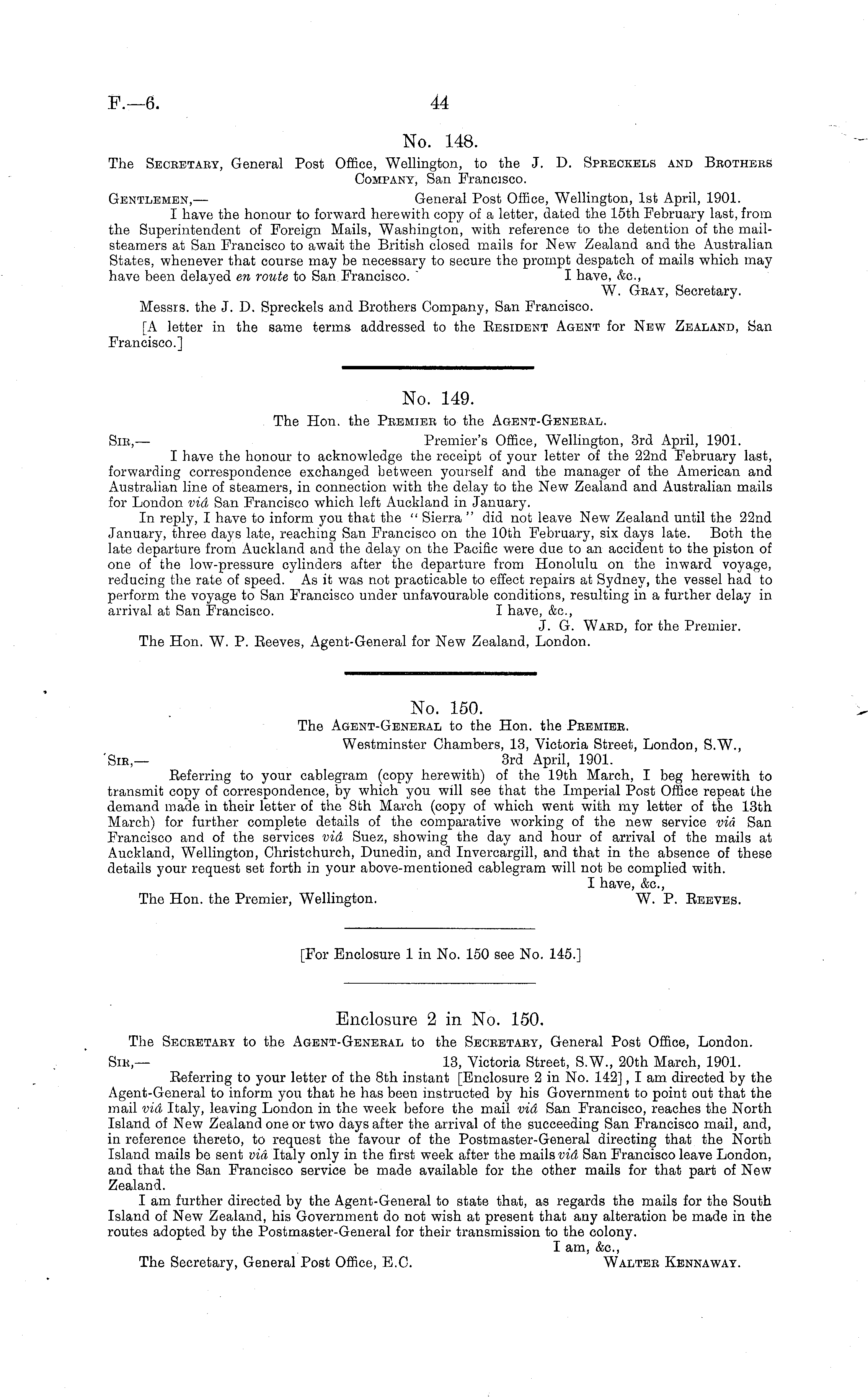[For Enclosure 1 in No. 150 see No. 145.] Enclosure 2 in No. 150. The Secretary to the Agent-General to the Secretary, General Post Office, London. Sir,— 13, Victoria Street, S.W., 20th March, 1901. Referring to your letter of the Bth instant [Enclosure 2in No. 142], lam directed by the Agent-General to inform you that he has been instructed by his Government to point out that the mail vid Italy, leaving London in the week before the mail vid San Francisco, reaches the North Island of New Zealand one or two days after the arrival of the succeeding San Francisco mail, and, in reference thereto, to request the favour of the Postmaster-General directing that the North Island mails be sent vid Italy only in the first week after the mails vid San Francisco leave London, and that the San Francisco service be made available for the other mails for that part of New Zealand. I am further directed by the Agent-General to state that, as regards the mails for the South Island of New Zealand, his Government do not wish at present that any alteration be made in the routes adopted by the Postmaster-General for their transmission to the colony. I am, &c, The Secretary, General Post Office, E.C. Walter Kennaway.