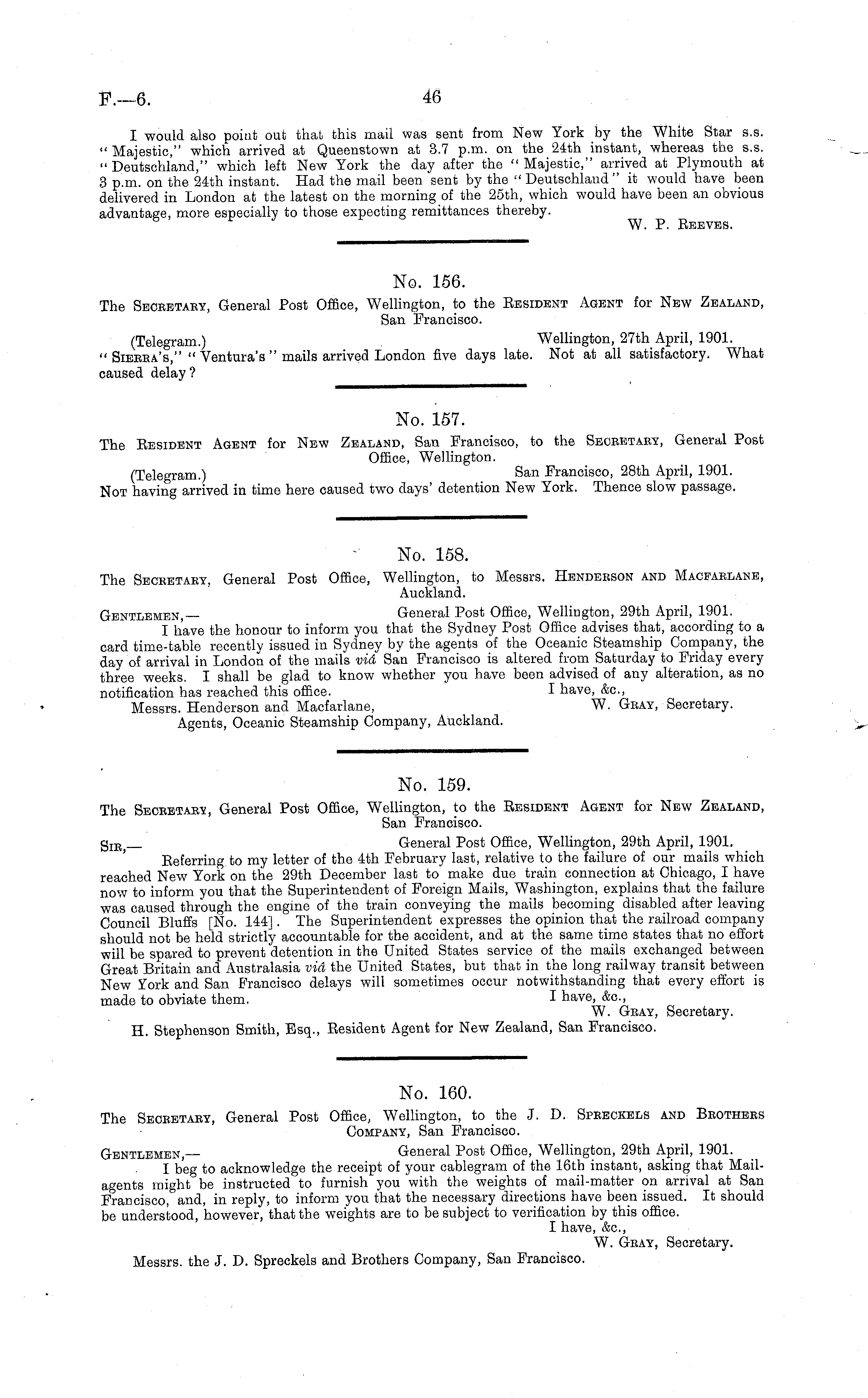 No. 158. The Secretary, General Post Office, Wellington, to Messrs. Henderson and Macfarlane, Auckland. Gentlemen,— General Post Office, Wellington, 29th April, 1901. I have the honour to inform you that the Sydney Post Office advises that, according to a card time-table recently issued in Sydney by the agents of the Oceanic Steamship Company, the day of arrival in London of the mails vid San Francisco is altered from Saturday to Friday every three weeks. I shall be glad to know whether you have been advised of any alteration, as no notification has reached this office. I have, &c, Messrs. Henderson and Macfarlane, W. Gray, Secretary. Agents, Oceanic Steamship Company, Auckland.