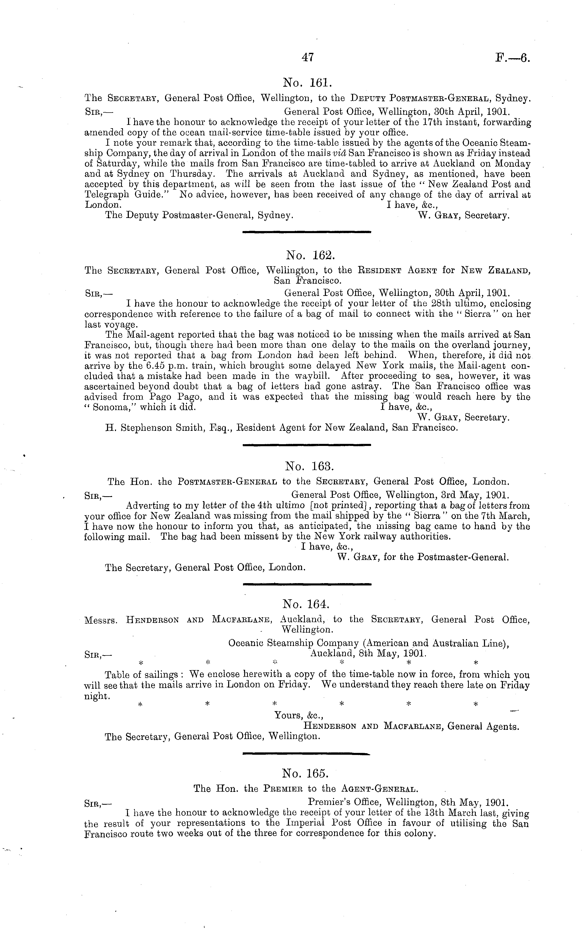 No. 162. The Secretary, General Post Office, Wellington, to the Resident Agent for New Zealand, San Francisco. Sir,— General Post Office, Wellington, 30th April, 1901. I have the honour to acknowledge the receipt of your letter of the 28th ultimo, enclosing correspondence with reference to the failure of a bag of mail to connect with the " Sierra" on her last voyage. The Mail-agent reported that the bag was noticed to be missing when the mails arrived at San Francisco, but, though there had been more than one delay to the mails on the overland journey, it was not reported that a bag from London had been left behind. When, therefore, it did not arrive by the 6.45 p.m. train, which brought some delayed New York mails, the Mail-agent concluded that a mistake had been made in the waybill. After proceeding to sea, however, it was ascertained beyond doubt that a bag of letters had gone astray. The San Francisco office was advised from Pago Pago, and it was expected that the missing bag would reach here by the " Sonoma," which it did. I have, &c, W. Gray, Secretary. H. Stephenson Smith, Esq., Resident Agent for New Zealand, San Francisco.