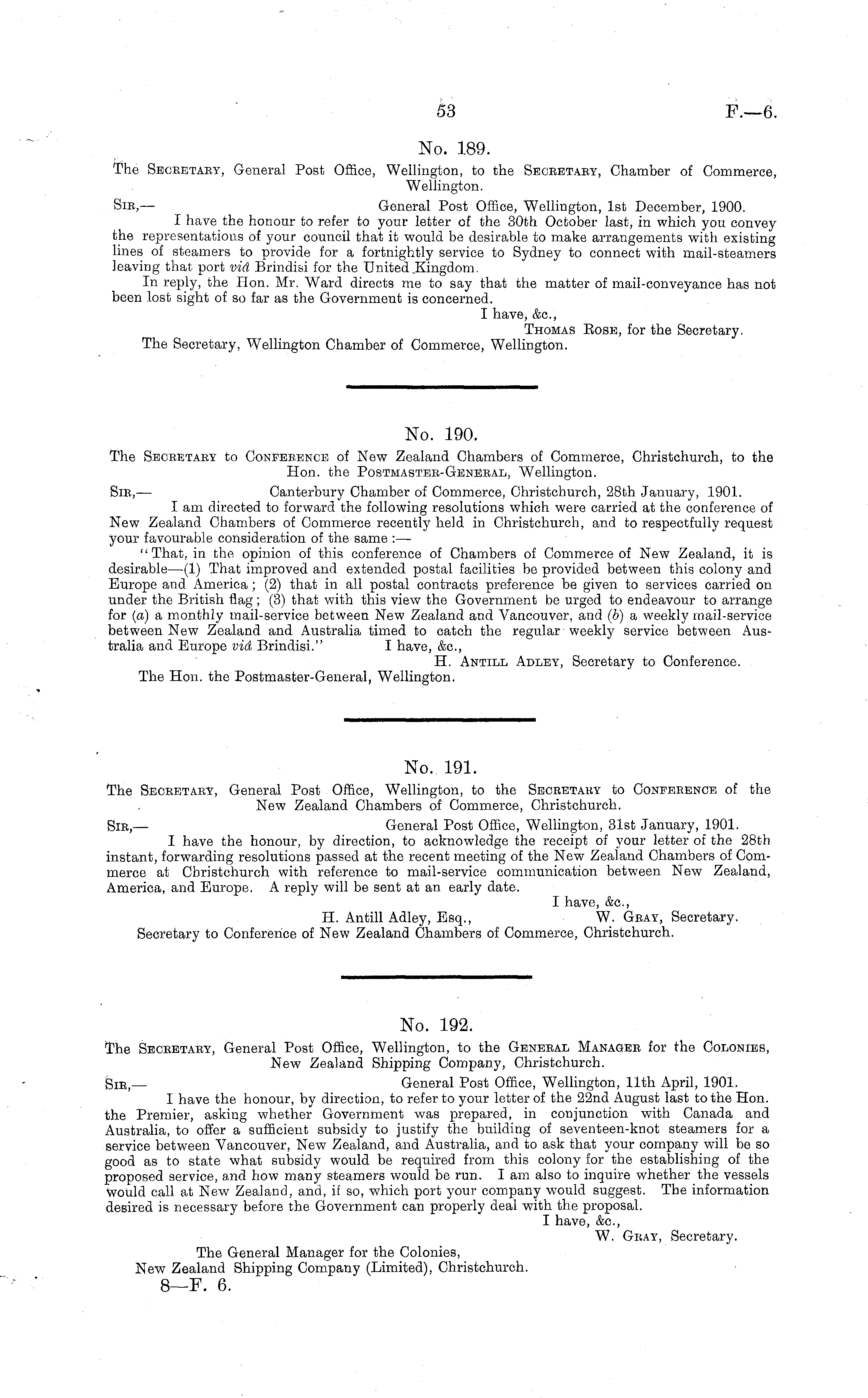 No. 191. The Secretary, General Post Office, Wellington, to the Secretary to Conference of the New Zealand Chambers of Commerce, Christchurch. Sir, — General Post Office, Wellington, 31st January, 1901. I have the honour, by direction, to acknowledge the receipt of your letter of the 28th instant, forwarding resolutions passed at the recent meeting of the New Zealand Chambers of Commerce at Christchurch with reference to mail-service communication between New Zealand, America, and Europe. A reply will be sent at an early date. I have, &c, H. Antill Adley, Esq., W. Gray, Secretary. Secretary to Conference of New Zealand Chambers of Commerce, Christchurch.