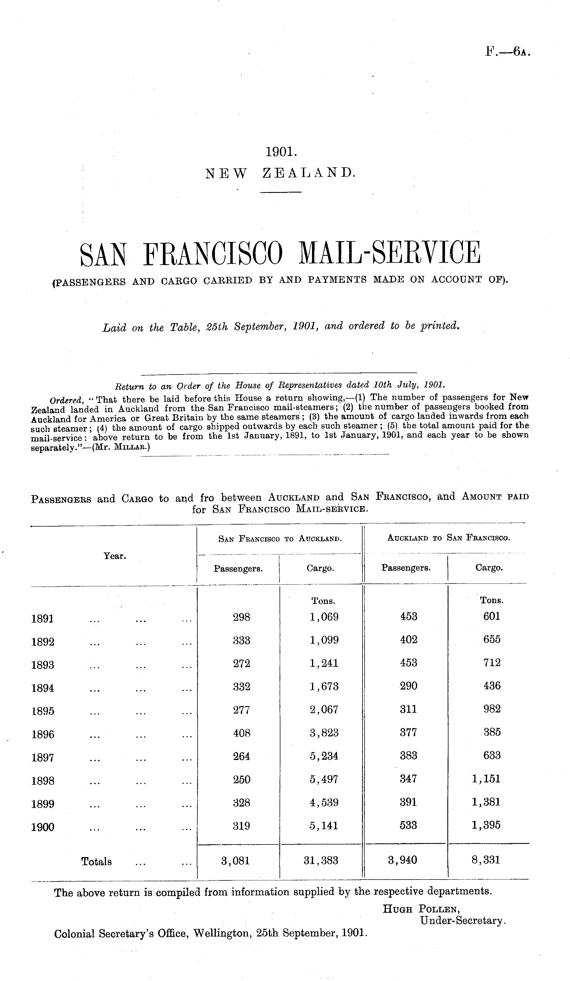 Return to an Order of the House of Representatives dated 10th July, 1901. Ordered, " That there be laid before this House a return showing,-—(1) The number of passengers for New Zealand landed in Auckland from the San Francisco mail-steamers; (2) the number of passengers booked from Auckland for America or Great Britain by the same steamers ; (3) the amount of cargo landed inwards from each such steamer; (4) the amount of cargo shipped outwards by each such steamer ; (5) the total amount paid for the mail-service:'above return to be from the Ist January, 1891, to Ist January, 1901, and each year to be shown separately."—(Mr. Millar.)