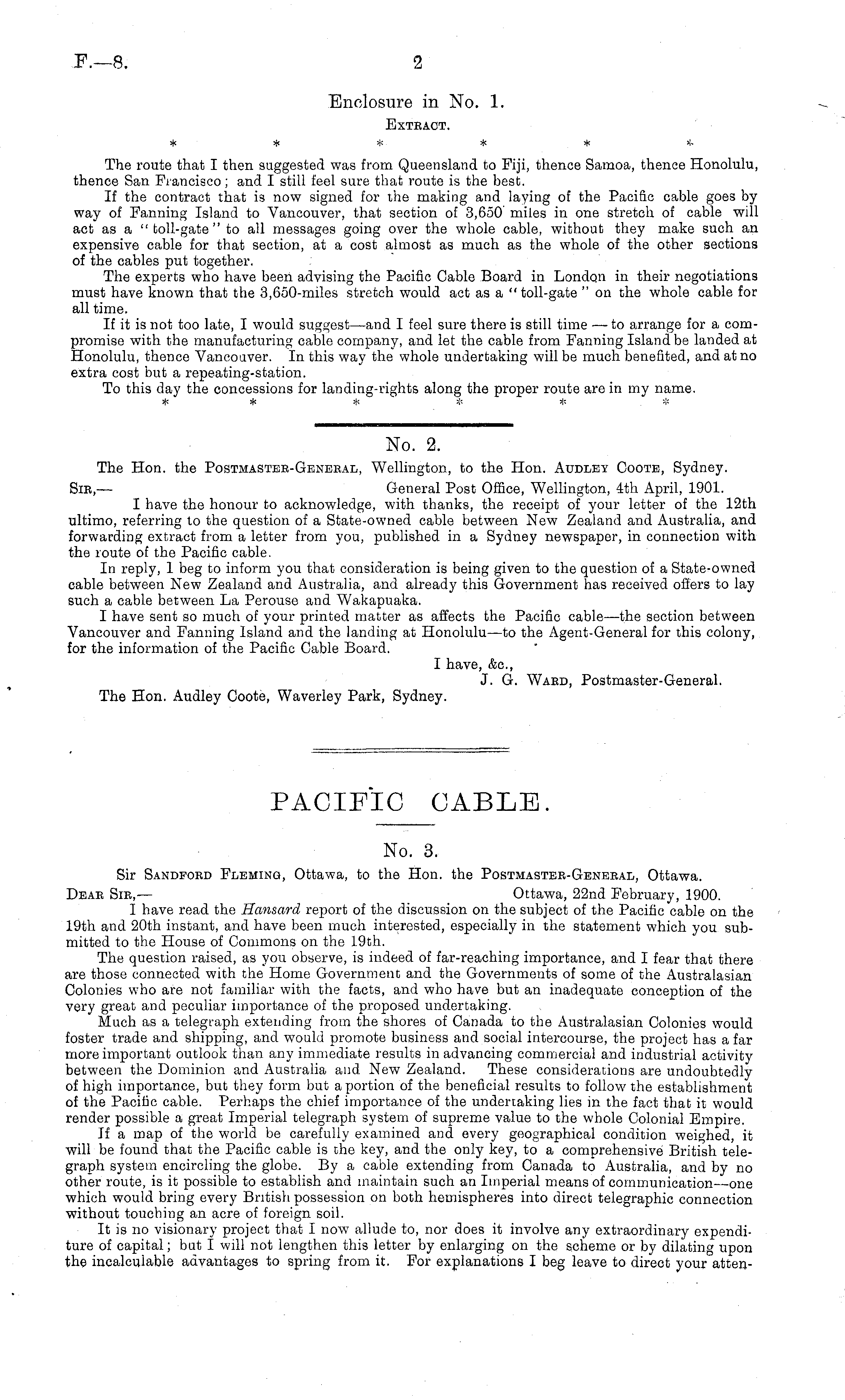 No. 2, The Hon. the Postmaster-General, Wellington, to the Hon. Audley Coote, Sydney. Sib,— General Post Office, Wellington, 4th April, 1901. I have the honour to acknowledge, with thanks, the receipt of your letter of the 12th ultimo, referring to the question of a State-owned cable between New Zealand and Australia, and forwarding extract from a letter from you, published in a Sydney newspaper, in connection with the route of the Pacific cable. In reply, 1 beg to inform you that consideration is being given to the question of a State-owned cable between New Zealand and Australia, and already this Government has received offers to lay such a cable between La Perouse and Wakapuaka. I have sent so much of your printed matter as affects the Pacific cable —the section between Vancouver and Fanning Island and the landing at Honolulu—to the Agent-General for this colony, for the information of the Pacific Cable Board. I have, &c, J. G. Ward, Postmaster-General. The Hon. Audley Coote, Waverley Park, Sydney.