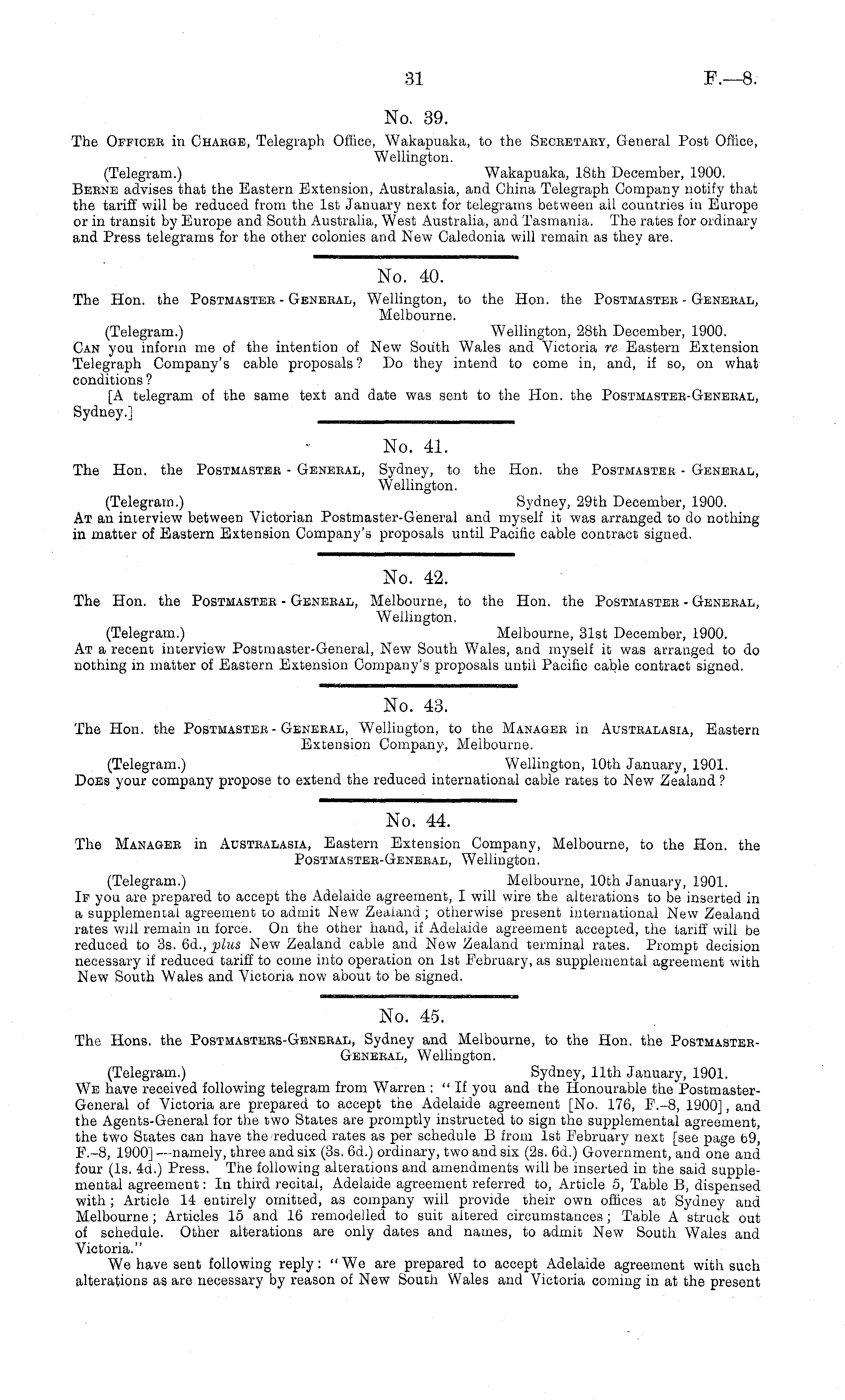 No. 45. The Hons. the Postmastees-Genebal, Sydney and Melbourne, to the Hon. the PostmasterGeneral, Wellington. (Telegram.) Sydney, 11th January, 1901. We have received following telegram from Warren : " If you and the Honourable the PostmasterGeneral of Victoria are prepared to accept the Adelaide agreement [No. 176, F.-8, 1900], and the Agents-General for the two States are promptly instructed to sign the supplemental agreement, the two States can have the reduced rates as per schedule B from Ist February next [see page b9, F.-8, 1900] —namely, three and six (3s. 6d.) ordinary, two and six (2s. 6d.) Government, and one and four (Is. 4d.) Press. The following alterations and amendments will be inserted in the said supplemental agreement: In third recital, Adelaide agreement referred to, Article 5, Table B, dispensed with; Article 14 entirely omitted, as company will provide their own offices at Sydney and Melbourne ; Articles 15 and 16 remodelled to suit altered circumstances; Table A struck out of schedule. Other alterations are only dates and names, to admit New South Wales and Victoria." We have sent following reply: "We are prepared to accept Adelaide agreement with such alterations as are necessary by reason of New Soutn Wales and Victoria coming in at the present