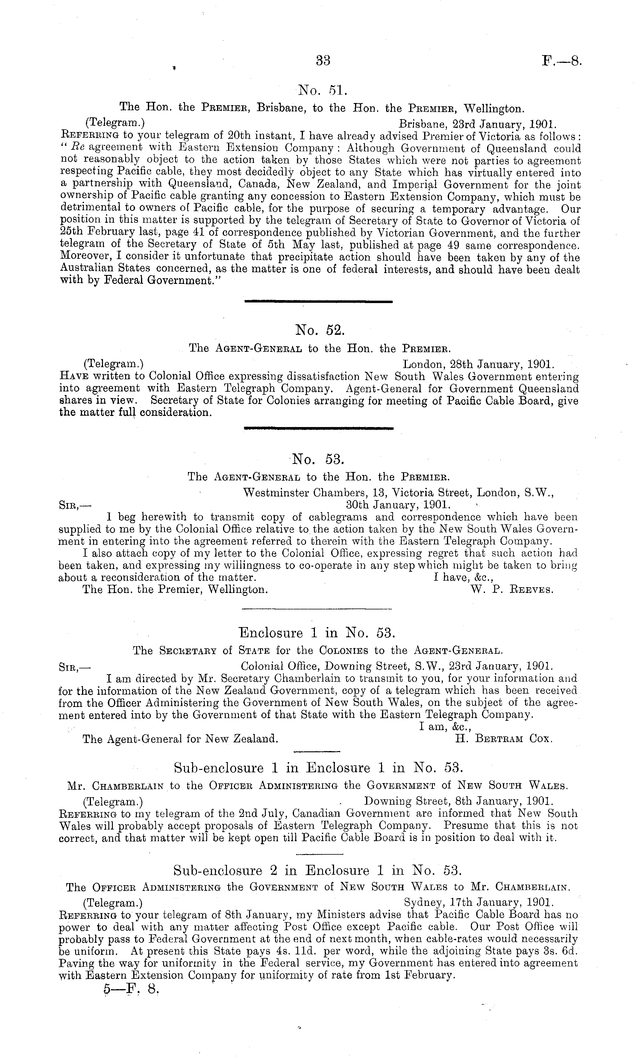 No. 52. The Agent-Genebal to the Hon. the Peemieb. (Telegram.) London, 28th January, 1901. Have written to Colonial Office expressing dissatisfaction New South Wales Government entering into agreement with Eastern Telegraph Company. Agent-General for Government Queensland shares in view. Secretary of State for Colonies arranging for meeting of Pacific Cable Board, give the matter full consideration.