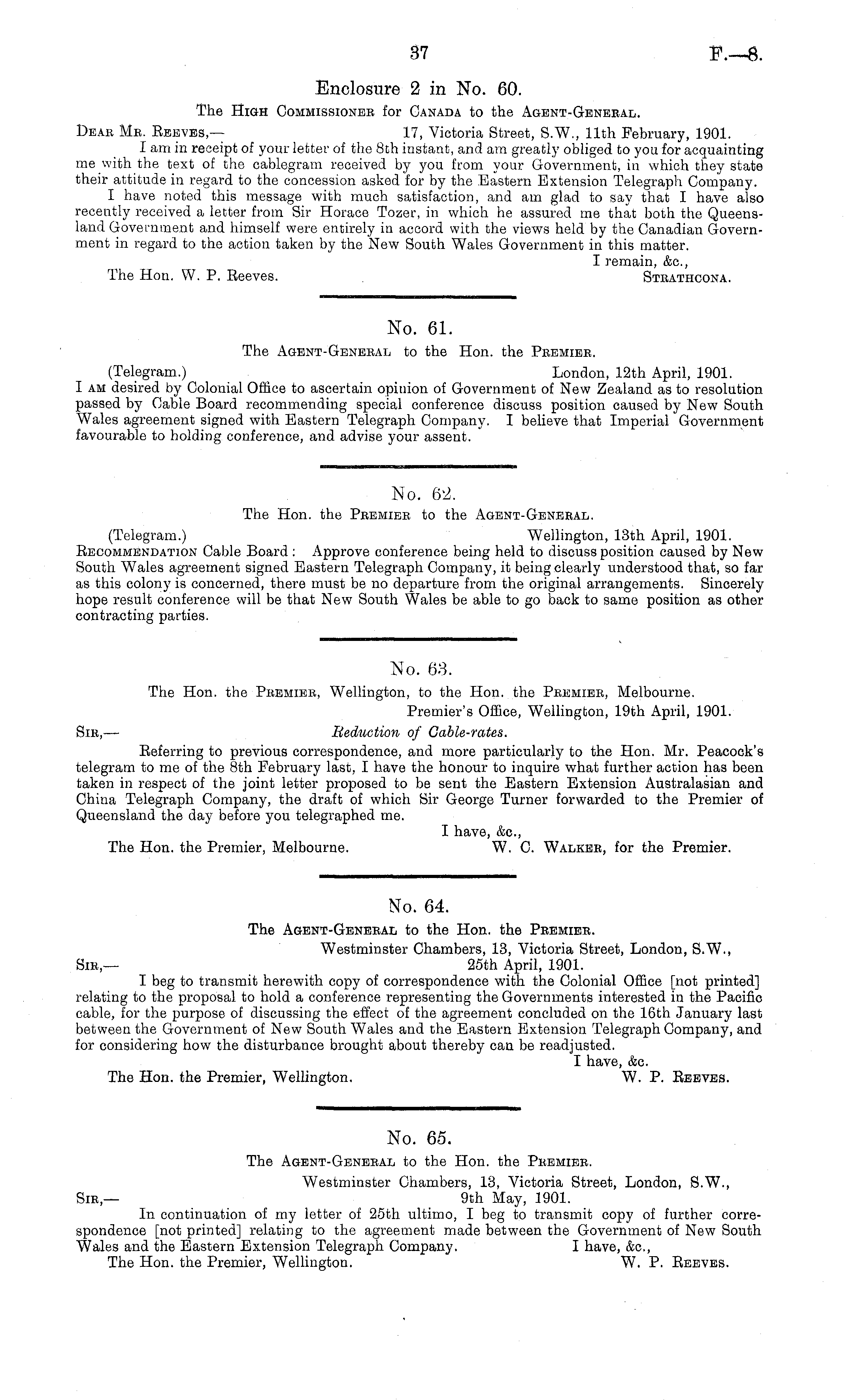 No. 64. The Agent-Geneeal to the Hon. the Peemieb. Westminster Chambers, 13, Victoria Street, London, S.W., Sib— 25th April, 1901. I beg to transmit herewith copy of correspondence with the Colonial Office [not printed] relating to the proposal to hold a conference representing the Governments interested in the Pacific cable, for the purpose of discussing the effect of the agreement concluded on the 16th January last between the Government of New South Wales and the Eastern Extension Telegraph Company, and for considering how the disturbance brought about thereby can be readjusted. I have, &c. The Hon. the Premier, Wellington. W. P. Eeeves.
