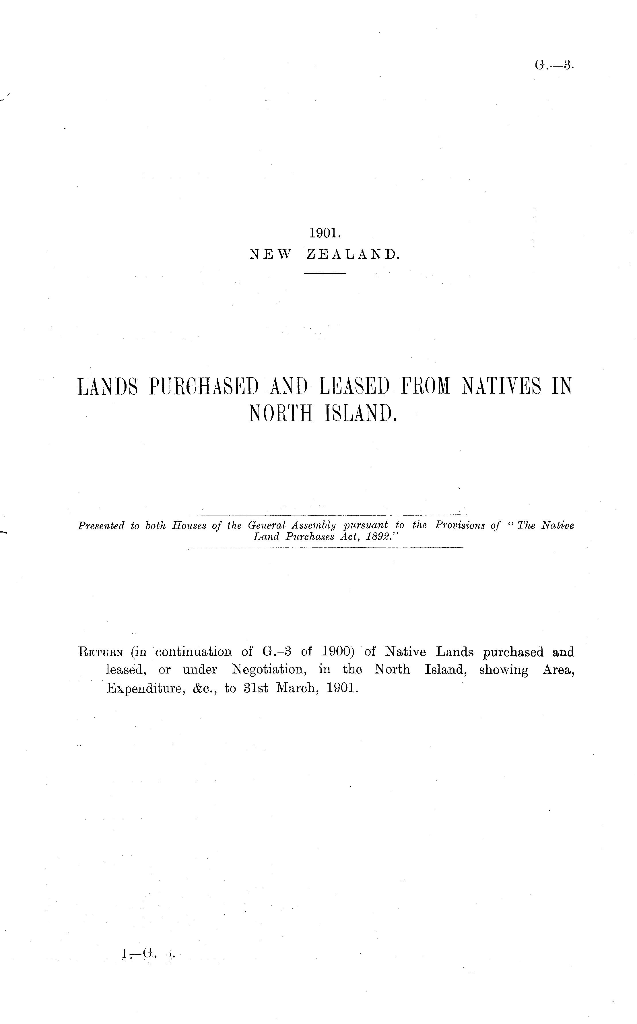 Return (in continuation of G.-3 of 1900) of Native Lands purchased and leased, or under Negotiation, in the North Island, showing Area, Expenditure, &c, to 31st March, 1901.