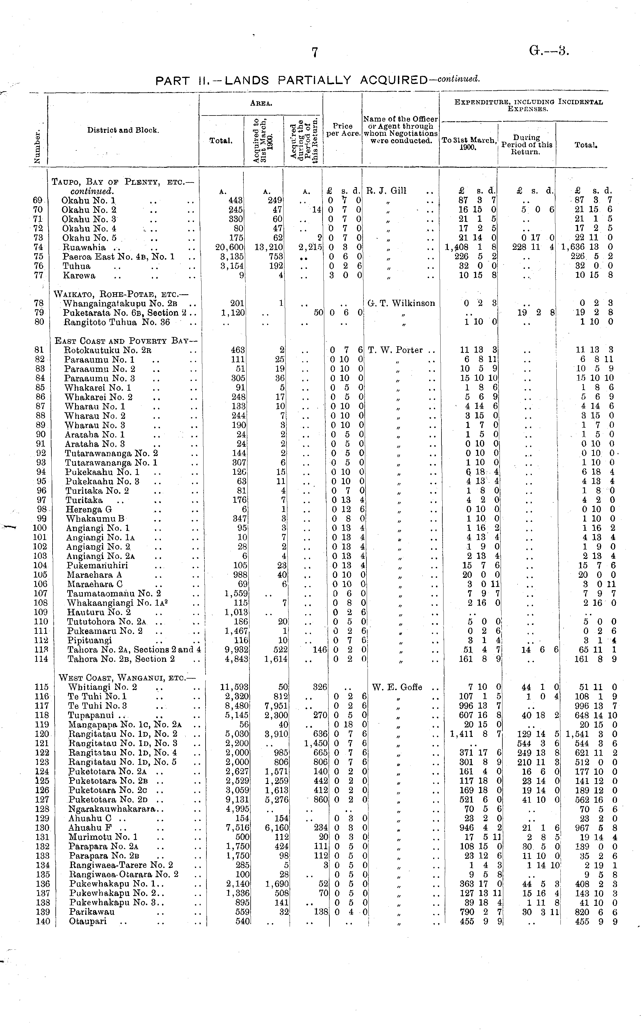 Area. Expenditure, including Incidental Expenses. 0J I Z District and Block. Total. °i vS-st Price "So "μ-o" per Acre. ■i s § Ifll 3s ■***$ Name of the Officer or Agent through whom Negotiations were conducted. To 31st March, 1900. During '. Period of this Return. Total. f>9 70 71 72 73 74 75 76 77 Taupo, Bay op Plenty, etc. — continued. Okahu No. 1 Okahu No. 2 Okahu No. 3 Okahu No. 4 Okahu No. 5 Ruawahia Paeroa East No. 4b, No. 1 Tuhua .. .. Karewa A. 443 245 330 80 175 20,600 3,135 8,154 9 A. 249 47 60 47 62 13,210 753 192 4 I A. i 1 ( 14 < ( i £ s. d. 1 0 V 0 0 7 0 0 7 0 0 7 0 0 7 0 0 3 Of 0 6 0 0 2 6 3 0 0 R.J. Gill £ s. d. 87 3 7 16 15 0 21 1 5 17 2 5 21 14 0 1,408 1 8 226 5 2 32 0 0 10 15 8 £ s, d. 5 0 6 ■' 017 0 228 11 4 £ s. d. 87 3 7 21 15 6 21 1 5 17 2 5 22 11 0 1,636 13 0 226 5 2 32 0 0 10 15 8 2 I 2,23.5 i ' 78 79 80 Waikato, Rohe-Potae, etc. — Whangaingatakupu No. 2b Puketarata No. 6b, Seotion 2 .. i Bangitoto Tuhua No. 36 .. | 201 1,120: 1 50 ( 0 6 0 G. T. Wilkinson 0 2 3 19 - 2 8J 0 2 3 19 2 8 1 10 0 110 Ol 81 82 83 84 85 86 87 88 89 90 91 92 93 94 95 96 97 98 99 100 101 102 103 104 105 106 107 108 109 110 111 112 US 114 East Coast and Povebty Bay— Rotokautuku No. 2r Paraaurnu No. 1 .. .. Paraaumu No. 2 Paraaumu No. 3 Whakarei No. 1 Whakarai No. 2 Wharau No. 1 Wharau No. 2 Wharau No. 3 Arataha No. 1 Arataha No. 3 Tutarawananga No. 2 Tutarawananga No. 1 Pukekaahu No. 1 Pukekaahu No. 3 .. Turitaka No. 2 Turitaka Herenga G WhakaumuB Angiangi No. 1 Angiangi No. Iα Angiangi No. 2 Angiangi No. 2a Pukemanuhiri Maraehara A Maraehara 0 Taumataomanu No. 2 Whakaangiangi No. Iα 2 Hauturu No. 2 Tututohora No. 2a .. Pukeamaru No. 2 Pipituangi Taliora No. 2a, Sections 2 and 4 Tahora No. 2b, Seotion 2 463 111 51 305 91 248 133 244 190 24 24 144 307 120 63 81 176 6 347 95 10 28 6 105 988 69 1,559 115 1,013 186 1,467 116 9,932 4,843 2 25 19 36 5 17 10 7 i 3 2 t 6 15 11 4 7 1 3 3 7 2 4 23 40 6 0 7 6! ' 0 10 0 0 10 0 0 10 0 0 5 0 0 5 0| 0 10 01 0 10 0 0 10 0 0 5 0 0 5 0 0 5 0 0 5 0 0 10 0 0 10 0 0 7 0 0 13 4 0 12 6. 0 8 0! 0 13 4 0 13 4 0 13 4 0 13 4 0 13 4 0 10 0 0 10 0 0 6 0 0 8 0 ; 0 2 6! 10 5 01 0 2 61 0 7 6 1 > 0 2 0 0 2 0 T. W. Porter .. " " 11 13 3 6 8 ll! 10 5 9 15 10 10 18 6 5 6 9 4 14 6 3 15 0 17 0 15 0 0 10 0 0 10 0 1 10 0 6 18 4 i 13 i 18 0 4 2 0 0 10 0 1 10 0 1 16 2 4 13' 4 19 0 2 13 4 15 7 6 20 0 0 3 0 11 7 9 7 2 16 0 " 11 13 8 6 8 11 10 5 9 15 10 10 18 6 5 6 9 4 14 6 3 15 0 17 0 15 0 0 10 0 0 10 0 1 10 0 6 18 4 4 13 4 18 0 4 2 0 0 10 0 1 10 0 1 16 2 4 13 4 19 0 2 13 4 15 7 6 20 0 0 3 0 11 7 9 7 2 16 0 " 1 1 „ 1 1 I 1 7 I I i 5' 0 0 0 2 6| 3 14: 51 4 71 161 8 9 5 0 0 0 2 6 3 14 65 11 1 161 8 9 20i 1| 10 522 1,614 146 [I 1 I li' 6 6 ) ) 115 116 117 118 119 120 121 122 123 124 125 126 127 12S 129 130 131 132 133 134 135 136 137 138 139 140 West Coast, Wanganui, etc. — Whitiangi No. 2 Te Tuhi No. 1 Te Tuhi No. 3 Tupapanui Mangapapa No. lc, No. 2a Rangitatau No. Id, No. 2 .. Rangitatau No. Id, No. 3 Rangitatau No. Id, No. 4 Rangitatau No. Id, No. 5 Puketotara No. 2a .. Puketotara No. 2b .. Puketotara No. 2o .. Puketotara No. 2d .. Ngarakauwhakarara.. Ahuahu C .. Ahuahu F .. Murimotu No. 1 Parapara No. 2a Parapara No. 2b Rangiwaea-Tarere No. 2 Rangiwaea-Otarara No. 2 Pukewhakapu No. 1.. Pukewhakapu No. 2.. Pukewhakapu No. 3.. Parikawau Otaupari 11,593 2,320 8,480 5,145 56 5,030 2,200 2,000 2,000 2,627 2,529 3,059 9,131 4,995 154 7,516 500 1,750 1,750 285 100 2, HO 1,336 895 559 540 50 812 7,951 2,300 40 3,910 985 806 1,571 1,259 1,613 5,276 326 "270 636 1,450 665 806 140 442 412 860 0 2 6 0 2 6 ) 0 5 0 0 18 0 5 0 7 6 3 0 7 6 5 0 7 6! 3 0 7 6 3 0 2 0 3 0 2 0 2 0 2 0 3 0 2 0 : W. E. Goffe .. \ ) ) \ ) ) ) 7 10 0 107 1 5 996 13 7 607 16 8 20 15 0 1,411 8 7 371 17 6 301 8 9 161 4 0 117 18 0 169 18 0 521 6 0 70 5 6 23 2 0 946 4 2 17 5 11 108 15 0 23 12 6 14 3 9 5 8 363 17 0 127 13 11 39 18 4 790 2 7 I 455 9 9 44 1 0 10 4 40 18 2 129 14 5 544 3 6 249 13 8 210 11 3 16 6 0 23 14 0 19 14 0 41 10 0 51 11 0 108 1 9 996 13 7 648 14 10 20 15 0 1,541 3 0 544 3 6 621 11 2 512 0 0 177 10 0 141 12 0 189 12 0 562 16 0 70 5 6 23 2 0 967 5 8 19 14 4 139 0 0 ! 35 2 6 2 19 1 9 5 8 408 2 3 143 10 3 41 10 0 820 6 6 455 9 9 1541 6,160i 112 424 98 5 28 1,690 508 141 32! 234 20 111 112 3 0 3 0 10 3 0 3 0 3 0 1 0 5 0j 2 0 5 0 : 3 0 5 0i 0 5 0! 2 0 5 0: 3 0 5 0 0 5 0 3 0 4 0 \ ) ) )| . 1 21 1 6 ! 2 8 5 30 5 0: 11 10 0! 1 14 10 1 •52 70 3 v 31 "1 3 44 5 8 15 16 4i 1 11 8 30 3 11 138 3 3 •• I w * •