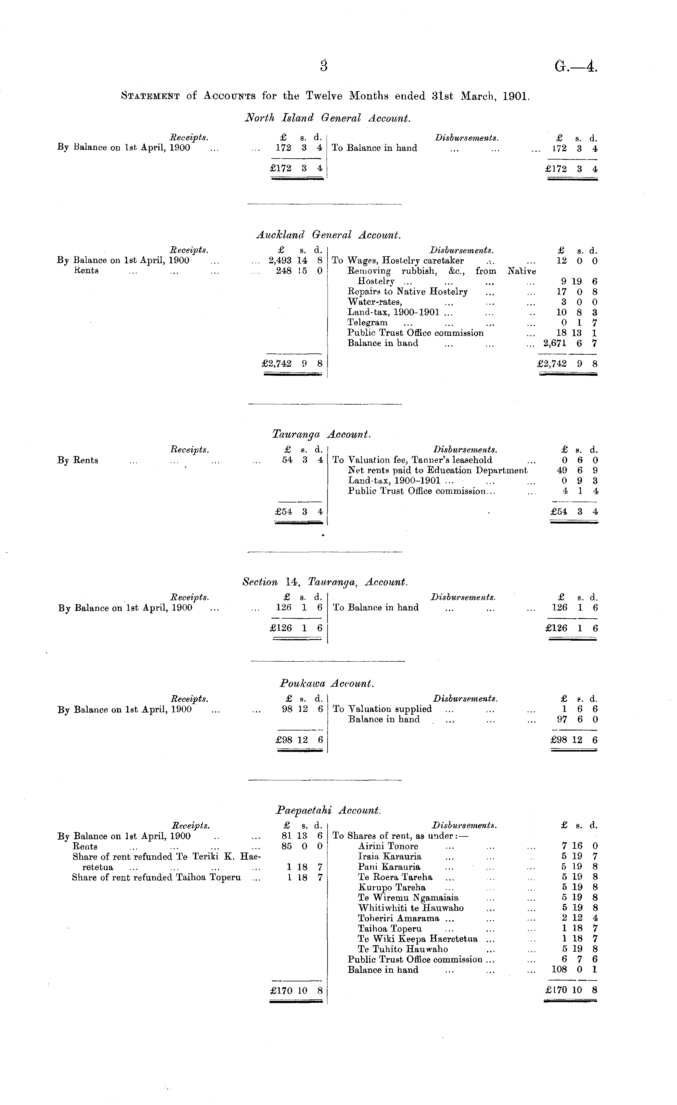 Poukaioa Account. Receipts. £ s. d. Disbursements. £ s. d. By Balance on Ist April, 1900 ... ... 98 12 6To Valuation supplied ... ... ... 166 Balance in hand ... ... ... 97 6 0 £98 12 6 £98 12 6