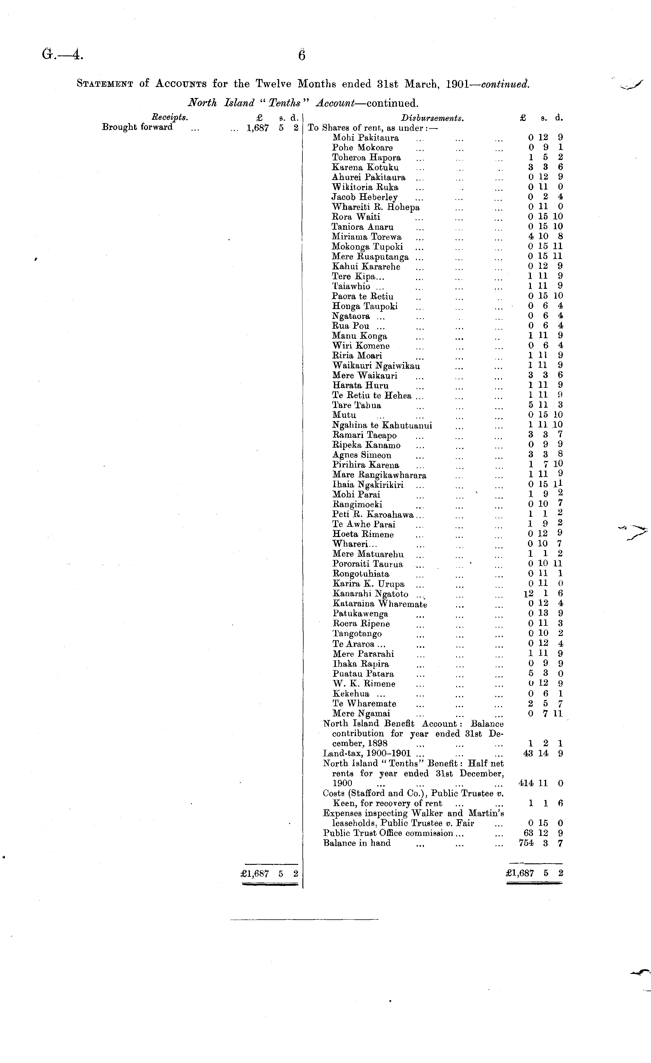 " Account —continued. Disbursements. £ s. d. To Shares of rent, as under : — Mohi Pakitaura ... ... ... 0 12 9 Pohe Mokoare ... ... ... 0 9 1 Toheroa Hapora ... ... ... 152 Karena Kotuku ... ... .. 3 3 6 Ahurei Pakitaura ... ... ... 0 12 9 Wikitoriaßuka ... ~ ... 0 11 0 Jacob Heberley ... ... ... 0 2 4 Whareiti R. Hohepa ... ... 0 11 0 Rora Waiti ... ... ... 0 15 10 Taniora Anaru ... ... ... 0 15 10 Miriama Torewa ... ... ... 4108 Mokonga Tupoki ... ... ... 015 11 Mere Ruaputanga ... ... ... 0 15 11 Kahui Kararehe ... ... .. 0 12 9 Tere Kipa... ... ... ... 1 11 9 Taiawhio ... ... ... ... 1 11 9 Paora te Retiu .. ... 0 15 10 Honga Taupoki ... ... ... 064 Ngataora ... ... 064 RuaPou ... ... ... ... 0 6 4 Manu Konga ... ... .. 1 11 9 Wiri Komene ... ... ... 064 Riria Moari ... ... ... 1 11 9 Waikauri Ngaiwikau ... ... 1 11 9 Mere Waikauri ... ... ... 336 Harata Huru ... ... ... 1 11 9 Te Retiu te Hehea ... ... ... 1 11 9 Tare Talma 5 11 3 Mutu ... ... ... ... 0 15 10 Ngahina te Kahutuanui ... ... 1 11 10 Ramari Taeapo ... ... ... 337 Ripeka Kanamo ... ... ... 099 Agnes Simeon ... ... ... 338 Pirihira Karena ... ... ... 1 710 Mare Rangikawharara ... ... 1 11 9 Ihaia Ngakirikiri ... ... ... 015 ll MohiParai ... ... ' ... 19 2 Rangimoeki ... ... ... 0 10 7 Peti R. Karoahawa... ... 112 TeAwheParai ... 19 2 Hoeta Rimene ... ... 0 12 9 Whareri... ... ... ... 0 10 7 Mere Matuarehu ... ... ... 112 Pororaiti Taurua ... ... • ... 010 11 Rongotuhiata ... ... ... 0 11 1 Karira K. Urupa ... ... ... 011 0 Kanarahi Ngatoto ... ... ... 12 1 6 KataraiDa Wharemate ... ... 0 12 4 Patukawenga ... ~, ... 0 13 9 Roera Ripene ... ... ... 0 11 3 Tangotango ... ... ... 0 10 2 Te Araroa... ... ... ... 0 12 4 Mere Pararahi ... ... ... 1 11 9 Ihaka Rapira ... ... ... 099 Puatau Patara ... ... ... 530 W. K. Rimene ... ... ... 0 12 9 Kekehua ... ... ... ... 0 6 1 Te Wharemate ... ... ... 2 5 7 Mere Ngamai ... ... ... 0 7 11 North Island Benefit Account: Balance contribution for year ended 31st December, 1898 ... ... ... 12 1 Land-tax, 1900-1901 ... ... ... 43 14 9 North Island " Tenths" Benefit: Half net rents for year ended 31st December, 1900 ... ... ... ... 414 11 0 Costs (Stafford and Co.), Public Trustee v. Keen, for recovery of rent ... ... 116 Expenses inspecting Walker and Martin's leaseholds, Public Trustee v. Pair ... 0 15 0 Public Trust Office commission... ... 63 12 9 Balance in hand ... ... ... 754 3 7 £1,687 5 2