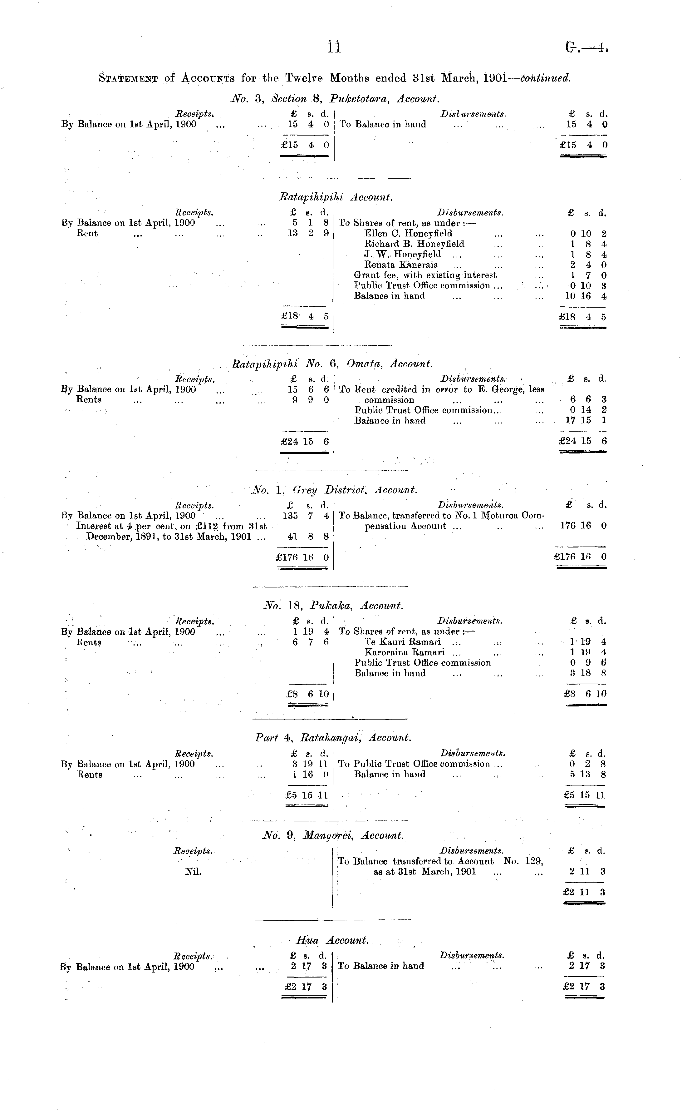 Part 4, RataJiangai, Account. Receipts. £ s. d. Disbursements. £ s. d. By Balance on Ist April, 1900 ... ... 319 11 To Public Trust Office commission ... ... 0 2 8 Rents ... ... ... ... 1 16 0 Balance in hand ... ... ... 5 13 8 £5 15 11 ..-■.■ £5 15 11