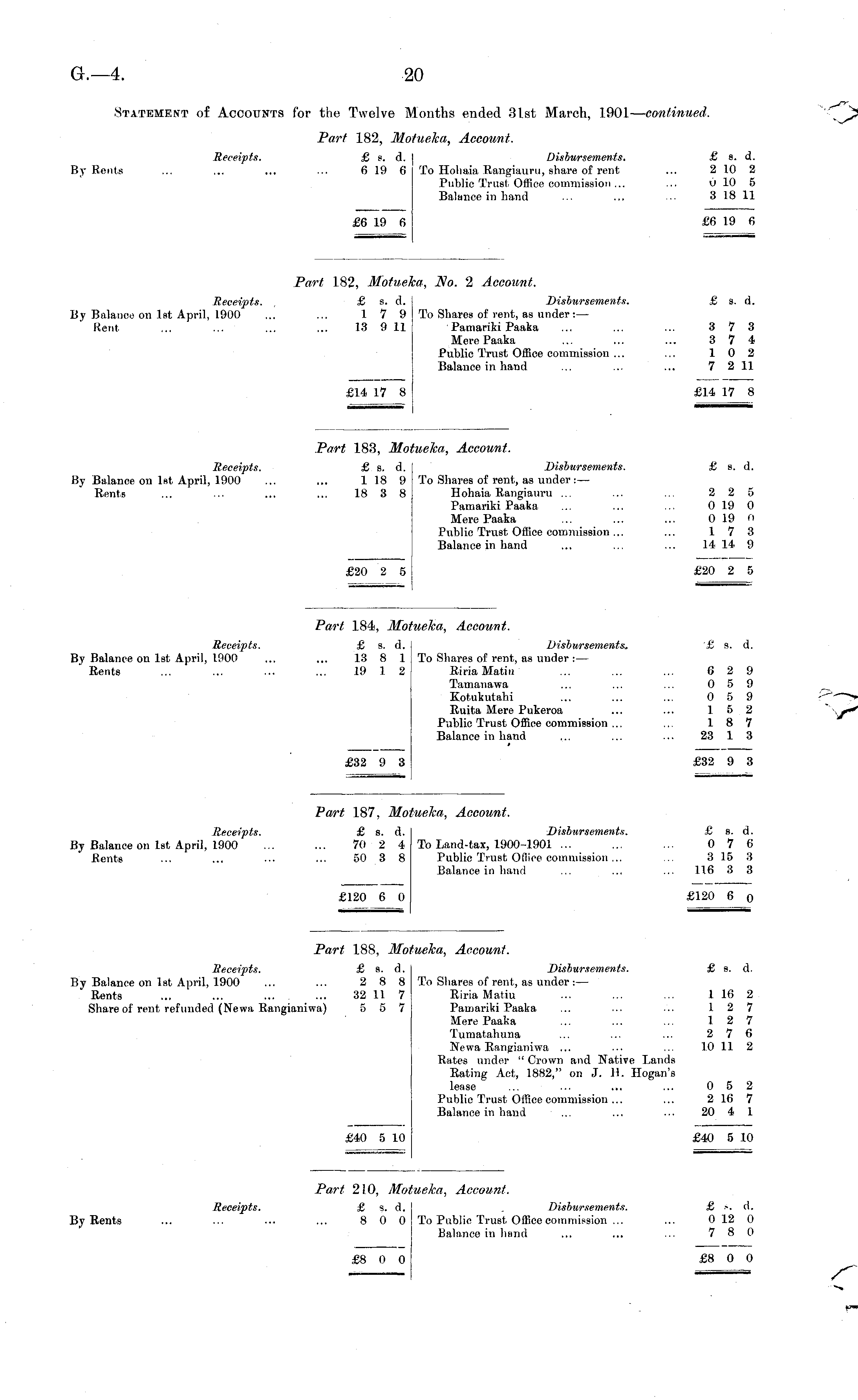 Part 183, Motueka, Account. Receipts. £ s. d. Disbursements. £ s. d. By Balance on Ist April, 1900 ... ... 118 9 To Shares of rent, as under : — Rents ... ... ... ... 18 3 8 Hohaia Rangiauru ... ... ... 2 2 5 Pamariki Paaka ... ... ... 0 19 0 Mere Paaka ... ... ... 0 19 O Public Trust Office commission ... ... 17 3 Balance in hand ... ... ... 14 14 9 £20 2 5 £20 2 5