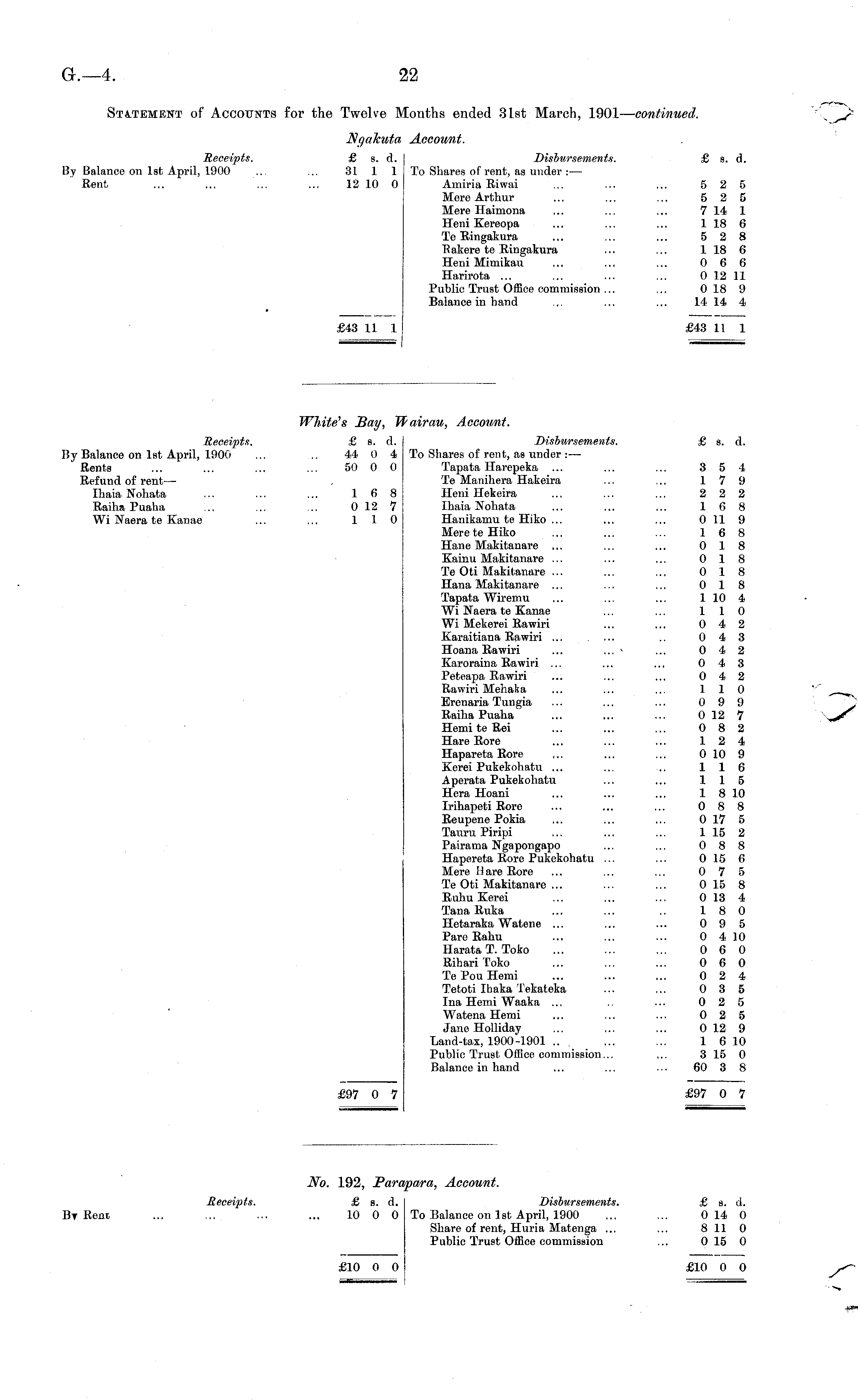 No. 192, Parapara, Account. Receipts. £ s. d. Disbursements. £ s. d. Bt Rent ... ... ... ... 10 0 0 To Balance on Ist April, 1900 ... ... 0 14 0 Share of rent, Huria Matenga ... ... 8 11 0 Public Trust Office commission ... 0 15 0 £10 0 0 £10 0 0