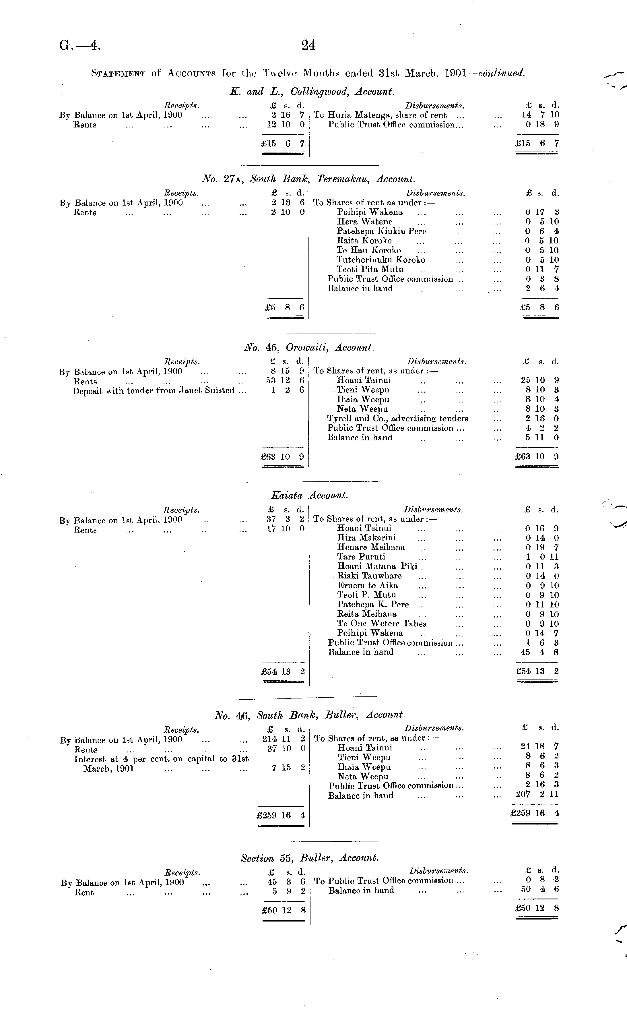No. 27a, South Bank, Teremakau, Account. Receipts. £ s. d. Disbursements. £ s. d. By Balance on Ist April, 1900 ... ... 2 18 6 To Shares of rent as under: — Rents ... ... ... ... 210 0 Poihipi Wakena ... ... ... 017 3 Hera Watene ... ... ... 0 5 10 Patehepa Kiukiu Pere ... ... 0 6 4 RaitaKoroko ... ... ... 0 5 10 TeHauKoroko ... ... ... 0 5 10 Tutehorinuku Koroko ... ... 0 5 10 Teoti Pita Mutu ... ... ... 0 11 7 Public Trust Office commission ... ... 0 3 8 Balance in hand ... ... .... 264 £5 8 6 £5 8 6