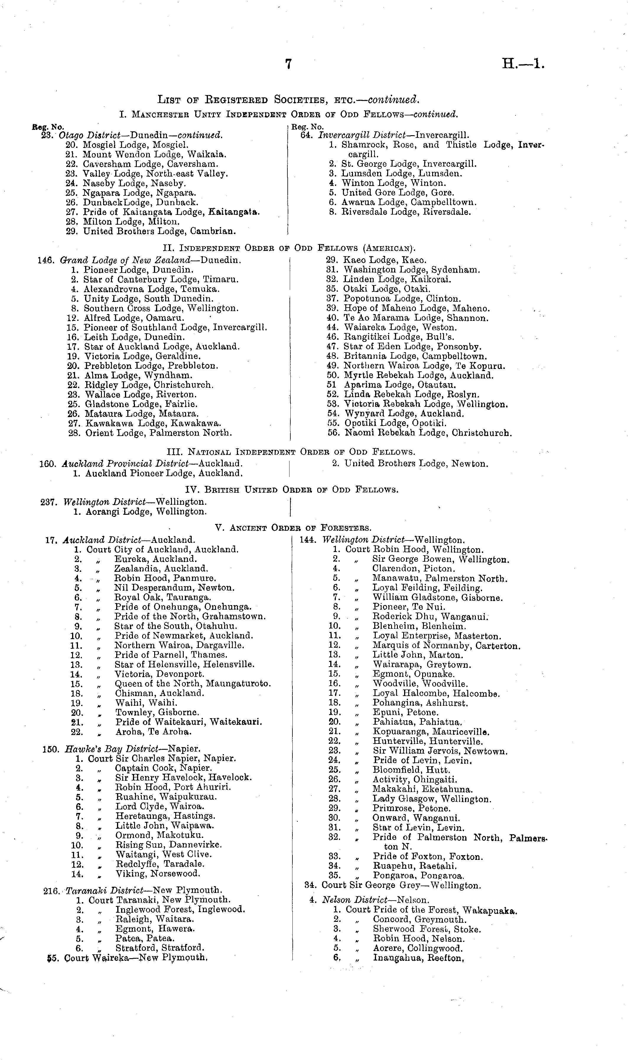 List op Registered Societies, etc. — continued. I. Manchester Unity Independent Order of Odd Fellows— continued. Keg. No. Reg. No. 23. Otago District— Dunedin— continued. 64. Invercargill District —lnvercargill. 20. Mosgiel Lodge, Mosgiel. 1. Shamrock, Rose, and Thistle Lodge, Inver--21. Mount Wendon Lodge, Waikaia. cargill. 22. Caversham Lodge, Caversham. 2. St. George Lodge, Invercargill. 23. Valley Lodge, North-east Valley. 3. Lumsden Lodge, Lumsden. 24. Naseby Lodge, Naseby. 4. Winton Lodge, Winton. 25. Ngapara Lodge, Ngapara. 5. United Gore Lodge, Gore. 26. DunbackLodge, Dunback. 6. Awarua Lodge, Campbelltown. 27. Pride of Kaitangata Lodge, Kaitangata. 8. Riversdale Lodge, Riversdale. 28. Milton Lodge, Milton. 29. United Brothers Lodge, Cambrian. 11. Independent Order of Odd Fellows (American). 146. Grand Lodge of New Zealand —Dunedin. 29. Kaeo Lodge, Kaeo. 1. Pioneer Lodge, Dunedin. 31. Washington Lodge, Sydenham. 2. Star of Canterbury Lodge, Timaru. 32. Linden Lodge, Kaikorai. 4. Alexandrovna Lodge, Temuka. 35. Otaki Lodge, Otaki. 5. Unity Lodge, South Dunedin. 37. Popotunoa Lodge, Clinton. 8. Southern Cross Lodge, Wellington. 39. Hope of Maheno Lodge, Maheno. 12. Alfred Lodge, Oamaru. 40. Te Ao Marama Lodge, Shannon. 15. Pioneer of Southland Lodge, Invercargill. 44. Waiareka Lodge, Weston. 16. Leith Lodge, Dunedin. 46. Rangitikei Lodge, Bull's. 17. Star of Auckland Lodge, Auckland. 47. Star of Eden Lodge, Ponsonby. 19. Victoria Lodge, Geraldine. 48. Britannia Lodge, Campbelltown. 20. Prebbleton Lodge, Prebbleton. 49. Northern Wairoa Lodge, Te Kopuru. 21. Alma Lodge, Wyndham. 50. Myrtle Rebekah Lodge, Auckland. 22. Ridgley Lodge, Christchureh. 51 Aparima Lodge, Otautau. 23. Wallace Lodge, Riverton. 52. Linda Rebekah Lodge, Roslyn. 25. Gladstone Lodge, B'airlie. 53. Viotoria Rebekah Lodge, Wellington. 26. Mataura Lodge, Mataura. 54. Wynyard Lodge, Auckland. 27. Kawakawa Lodge, Kawakawa. 55. Opotiki Lodge, Opotiki. 28. Orient Lodge, Palmerston North. 56. Naomi Rebekah Lodge, Christchureh. 111. National Independent Order of Odd Fellows. 160. Auckland Provincial District —Auckland. 2. United Brothers Lodge, Newton. 1. Auckland Pioneer Lodge, Auckland. IV. British United Order of Odd Fellows. 237. Wellington District —Wellington. I. Aorangi Lodge, Wellington. V. Ancient Order of Foresters. 17. Auckland District —Auckland. 144. Wellington District —Wellington. 1. Court City of Auckland, Auckland. 1. Court Robin Hood, Wellington. 2. „ Eureka, Auckland. 2. „ Sir George Bowen, Wellington. 3. „ Zealandia, Auckland. 4. Clarendon, Picton. 4. „ Robin Hood, Pannrare. 5. „ Manawatu, Palmerston North. 5. „ Nil Desperandum, Newton. 6. „ Loyal Feilding, Feilding. 6. „ Royal Oak, Tauranga. 7. „ William Gladstone, Gisborne. 7. „ Pride of Onehunga, Onehunga. 8. „ Pioneer, Te Nui. 8. „ Pride of the North, Grahamstown. 9, „ Roderick Dhu, Wanganui. 9. „ Star of the South, Otahuhu. 10. „ Blenheim, Blenheim. 10. „ Pride of Newmarket, Auckland. 11. „ Loyal Enterprise, Masterton. 11. „ Northern Wairoa, Dargaville. 12. „ Marquis of Normanby, Carterton. 12. „ Pride of Parnell, Thames. 13. „ Little John, Marton. 13. „ Star of Helensville, Helensville. 14. „ Wairarapa, Greytown. 14. „ Victoria, Devonport. 15. „ Egmont, Opunake. 15. „ Queen of the North, Maungaturoto. 16. „ Woodville, Woodville. 18. „ Chisman, Auckland. 17. „ Loyal Halcombe, Halcombe. 19. „ Waihi, Waihi. 18. „ Pohangina, Ashhurst. 20. » Townley, Gisborne. 19. „ Epuni, Petone. 21. „ Pride of Waitekauri, Waitekauri. 20. „ Pahiatua, Pahiatua. 22. „ Aroha, Te Aroha. 21. „ Kopuaranga, Mauricevilla. 22. „ Hunterville, Hunterville. 150. Hawke's Bay District— Napier. 0,3, n sir William Jervois, Newtown. 1. Court Sir Charles Napier, Napier. 2 4. m Pride of Levin, Levin. 2. „ Captain Cook, Napier. 0.5. /; Bloomfield, Hutt. 3. » Sir Henry Havelock, Havelook. 2 6. „ Activity, Ohingaiti. 4. . Robin Hood, Port Ahuriri. 2 7. n Makakahi, Eketahuna. 5. „ Ruahine, Waipukurau. 2 8. „ Lady Glasgow, Wellington. 6. „ Lord Clyde, Wairoa. 2 9. _ Primrose, Petone. 7. „ Heretaunga, Hastings. 30. , Onward, Wanganui. 8. „ Little John, Waipawa. 31, v star of Levin, Levin. 9. „ Ormond, Makotuku. 32. , p r ide of Palmerston North, Palmers--10. „ Rising Sun, Dannevirke. t on N. 11. , Waitangi, West Clive. 33. v p r i de of Foxton, Foxton. 12. , Redclyffe, Taradale. 34. a Ruapehu, Raetahi. 14. , Viking, Norsewood. 35. v Pongaroa, Ponparoa. ,„„ ™ , • r,- • 1 -vr -m „ i-u 34- Court Sir George Grey—Wellington. 216. Taranaki District —New Plymouth. s J & 1. Court Taranaki, New Plymouth. 4. Nelson District —Nelson. 2. „ Inglewood Forest, Inglewood. 1. Court Pride of the Forest, Wakapuaka. 3. „ Raleigh, Waitara. 2. „ Concord, Greymouth. 4. „ Egmont, Hawera. 3. » Sherwood Forest, Stoke. 5. » Patea, Patea. 4. , Robin Hood, Nelson. 6. „ Stratford, Stratford. 5. » Aorere, Collingwood. 55. Court Waireka—New Plymouth, 6. „ Inangahua, Reefton,