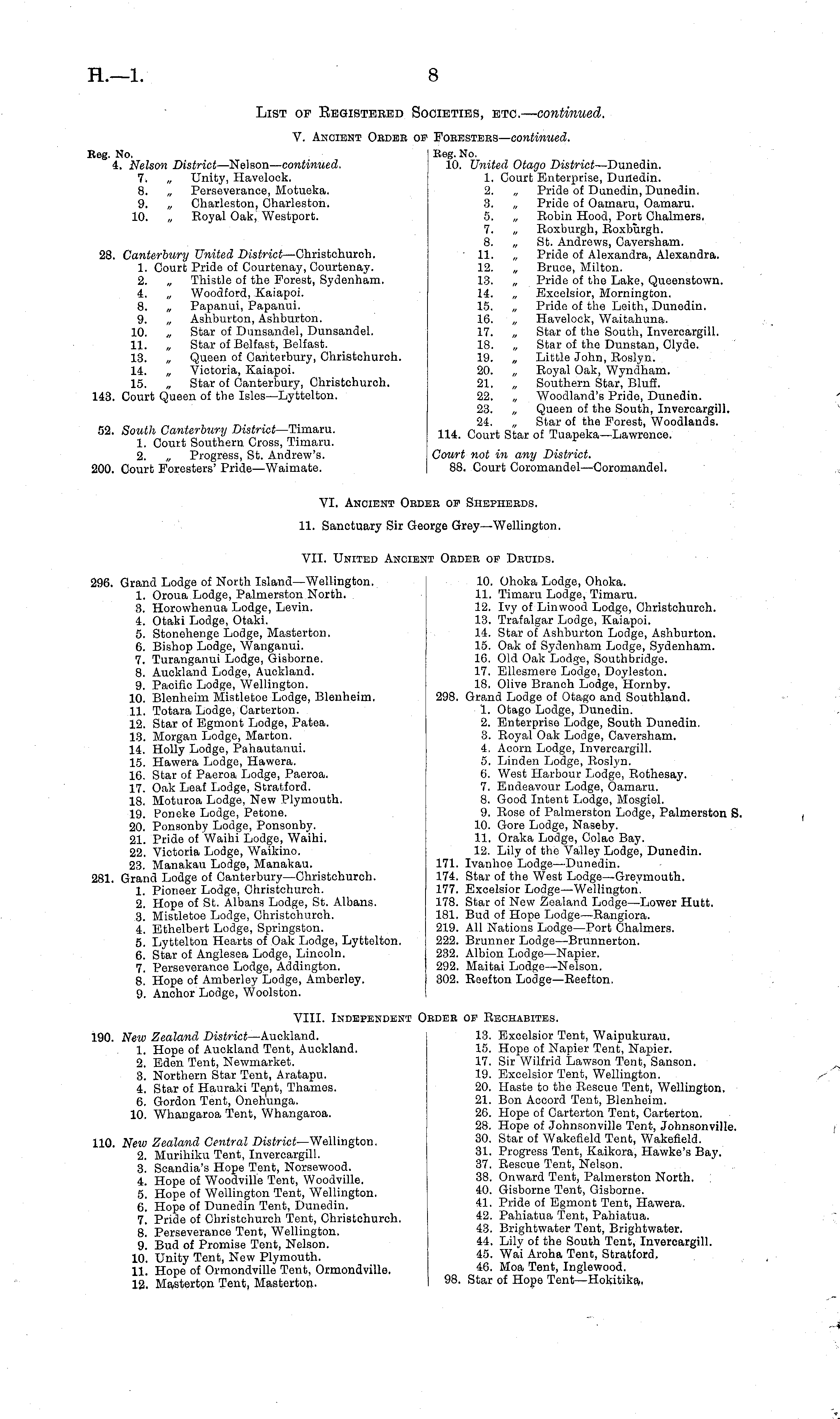 List op Eegisteeed Societies, etc. — continued. V. Ancient Order of Foresters— continued. Eeg. No. Eeg. No. i. Nelson District —Nelson— continued. 10. United Otago District —Dunedin. 7. „ Unity, Havelock. 1. Court Enterprise, Dunedin. 8. „ Perseverance, Motueka. 2. „ Pride of Dunedin, Dunedin. 9. „ Charleston, Charleston. 3. „ Pride of Oamaru, Oamaru. 10. „ Royal Oak, Westport. 5. „ Robin Hood, Port Chalmers. 7. „ Roxburgh, Roxburgh. 8. „ St. Andrews, Caversham. 28. Canterbury United District —Christchureh. 11. „ Pride of Alexandra, Alexandra. 1. Court Pride of Courtenay, Courtenay. 12. „ Bruce, Milton. 2. „ Thistle of the Forest, Sydenham. 13. „ Pride of the Lake, Queenstown. 4. „ Woodford, Kaiapoi. 14. „ Excelsior, Mornington. 8. „ Papanui, Papanui. 15. „ Pride of the Leith, Dunedin. 9. „ Ashburton, Ashburton. 16. „ Havelock, Waitahuna. 10. „ Star of Dunsandel, Dunsandel. 17. „ Star of the South, Invercargill. 11. „ Star of Belfast, Belfast. 18. „ Star of the Dunstan, Clyde. 13. „ Queen of Canterbury, Christchureh. 19. „ Little John, Roslyn. 14. „ Victoria, Kaiapoi. 20. „ Royal Oak, Wyndham. 15. „ Star of Canterbury, Christchureh. 21. „ Southern Star, Bluff. 143. Court Queen of the Isles—Lyttelton. 22. „ Woodland's Pride, Dunedin. 23. „ Queen of the South, Invercargill. „.,„,, „. ... m . 24. ~ Star of the Forest, Woodlands. 52. South Canterbury lv Comt Star of Tuapeka-Lawrence. 1. Court Southern Cross, Timaru. 2. „ Progress, St. Andrew's. Court not in any District. 200. Court Foresters' Pride —Waimate. 88. Court Coromandel —Coromandel. VI. Ancient Order of Shepherds. 11. Sanctuary Sir George Grey—Wellington. VII. United Ancient Order of Druids. 296. Grand Lodge of North Island—Wellington. 10. Ohoka Lodge, Ohoka. 1. Oroua Lodge, Palmerston North. 11. Timaru Lodge, Timaru. 3. Horowhenua Lodge, Levin. 12. Ivy of Linwood Lodge, Christchureh. 4. Otaki Lodge, Otaki. 13. Trafalgar Lodge, Kaiapoi. 5. Stonehenge Lodge, Masterton. 14. Star of Ashburton Lodge, Ashburton. 6. Bishop Lodge, Wanganui. 15. Oak of Sydenham Lodge, Sydenham. 7. Turanganui Lodge, Gisborne. 16. Old Oak Lodge, Southbridge. 8. Auckland Lodge, Auckland. 17. Ellesmere Lodge, Doyleston. 9. Pacific Lodge, Wellington. 18. Olive Branch Lodge, Hornby. 10. Blenheim Mistletoe Lodge, Blenheim. 298. Grand Lodge of Otago and Southland. 11. Totara Lodge, Carterton. 1. Otago Lodge, Dunedin. 12. Star of Egmont Lodge, Patea. 2. Enterprise Lodge, South Dunedin. 13. Morgan Lodge, Marton. 3. Royal Oak Lodge, Caversham. 14. Holly Lodge, Pahautanui. 4. Acorn Lodge, Invercargill. 15. Hawera Lodge, Hawera. 5. Linden Lodge, Roslyn. 16. Star of Paeroa Lodge, Paeroa. 6. West Harbour Lodge, Rothesay. 17. Oak Leaf Lodge, Stratford. 7. Endeavour Lodge, Oamaru. 18. Moturoa Lodge, New Plymouth. 8. Good Intent Lodge, Mosgiel. 19. Poneke Lodge, Petone. 9. Rose of Palmerston Lodge, Palmerston S. 20. Ponsonby Lodge, Ponsonby. 10. Gore Lodge, Naseby. 21. Pride of Waihi Lodge, Waihi. 11. Oraka Lodge, Colae Bay. 22. Victoria Lodge, Waikino. 12. Lily of the Valley Lodge, Dunedin. 23. Manakau Lodge, Manakau. 171. Ivanhoe Lodge—Dunedin. 281. Grand Lodge of Canterbury—Christchureh. 174. Star of the West Lodge—Greymouth. 1. Pioneer Lodge, Christchureh. 177. Excelsior Lodge—Wellington. 2. Hope of St. Albans Lodge, St. Albans. 178. Star of New Zealand Lodge—Lower Hutt. 3. Mistletoe Lodge, Christchureh. 181. Bud of Hope Lodge—Rangiora. 4. Ethelbert Lodge, Springston. 219. All Nations Lodge—Port Chalmers. 5. Lyttelton Hearts of Oak Lodge, Lyttelton. 222. Brunner Lodge—Brunnerton. 6. Star of Anglesea Lodge, Lincoln. 232. Albion Lodge—Napier. 7. Perseverance Lodge, Aldington. 292. Maitai Lodge—Nelson. 8. Hope of Amberley Lodge, Amberley. 302. Reefton Lodge—Reefton. 9. Anchor Lodge, Woolston. VIII. Independent Order of Rechaeites. 190. New Zealand District —Auckland. 13. Excelsior Tent, Waipukurau. 1. Hope of Auckland Tent, Auckland. 15. Hope of Napier Tent, Napier. 2. Eden Tent, Newmarket. 17. Sir Wilfrid Lawson Tent, Sanson. 3. Northern Star Tent, Aratapu. 19. Excelsior Tent, Wellington. 4. Star of Hauraki Tept, Thames. 20. Haste to the Rescue Tent, Wellington. 6. Gordon Tent, Onehunga. 21. Bon Accord Tent, Blenheim. 10. Whangaroa Tent, Whangaroa. 26. Hope of Carterton Tent, Carterton. 28. Hope of Johnsonville Tent, Johnsonville. 110. New Zealand Central District— Wellington. 30. Star of Wakefield Tent, Wakefield. 2. Murihiku Tent, Invercargill. 31. Progress Tent, Kaikora, Hawke's Bay. 3. Scandia's Hope Tent, Norsewood. 37. Rescue Tent, Nelson. 4. Hope of Woodville Tent, Woodville. 38. Onward Tent, Palmerston North. 5. Hope of Wellington Tent, Wellington. 40. Gisborne Tent, Gisborne. 6. Hope of Dunedin Tent, Dunedin. 41. P nd e ° f Egmont Tent, Hawera. 7. Pride of Christchureh Tent, Christchureh. 42. Pahiatua Tent, Pahiatua. 8. Perseverance Tent, Wellington. 43. Bnghtwater Tent, Brightwater. 9 Bud of Promise Tent, Nelson. 44. Lily of the South Tent, Invercargill. 10 Unity Tent, New Plymouth. 45. Wai Aroha Tent, Stratford. 11. Hope of Ormondville Tent, Ormondville. 46. Moa Tent, Inglewood. 12. Masterton Tent, Masterton. 98. Star of Hope Tent—Hokitika,
