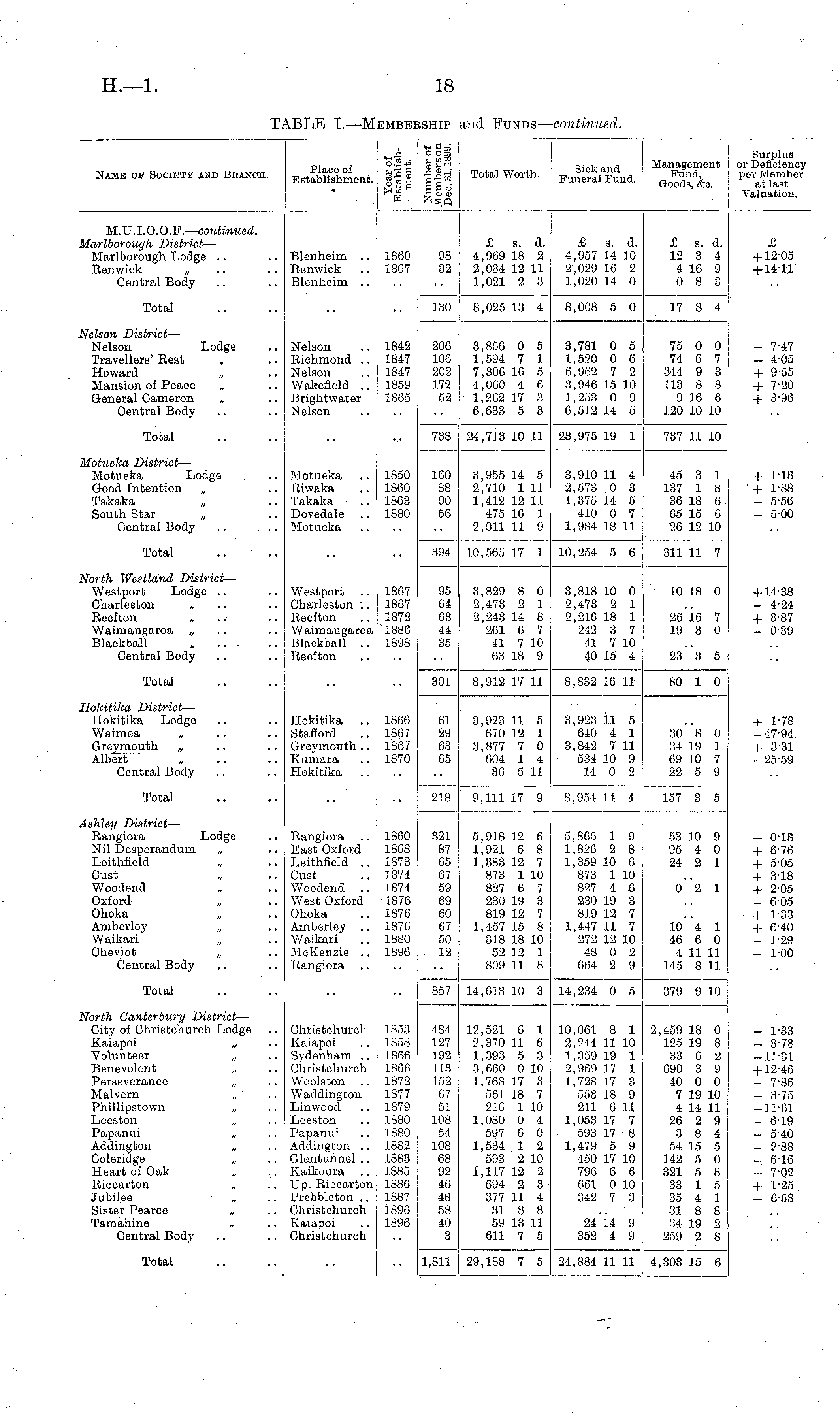 Name of Society and Beanch. Place of Establishment. S3 a tH CO H . "S 3 crj O O m u to 00 a a a £2% i ! Sick and Management Total Worth. Pu neral Fund Fmld - mineral iund. G 00 ds, &c. Surplus or Deficiency per Member at last Valuation. M.U.I.O.O.F. — continued. Marlborough District — Marlborough Lodge .. Renwick „ Central Body Blenheim .. Renwick Blenheim .. 1860 1867 98 32 £ s. d. 4,969 18 2 2,034 12 11 1,021 2 3 £ s. d. 4,957 14 10 2,029 16 2 1,020 14 0 £ s. d. 12 3 4 4 16 9 0 8 3 £ + 12-05 + 14-11 Total 130 8,025 13 4 8,008 5 0 17 8 4 Nelson District — Nelson Lodge Travellers' Rest „ Howard Mansion of Peace General Cameron „ Central Body Nelson Richmond .. Nelson Wakefield .. Brightwater Nelson 1842 1847 1847 1859 1865 206 106 202 172 52 3,856 0 5 1,594 7 1 7,306 16 5 4,060 4 6 1,262 17 3 6,633 5 3 3,781 0 5 1,520 0 6 6,962 7 2 3,946 15 10 1,253 0 9 6,512 14 5 75 0 0 74 6 7 344 9 3 113 8 8 9 16 6 120 10 10 - 7-47 - 4-05 + 9-55 + 7-20 + 3-96 Total 738 24,713 10 11 23,975 19 1 737 11 10 Motueka District — Motueka Lodge Good Intention „ Takaka South Star „ Central Body Motueka Riwaka Takaka Dovedale Motueka 1850 1860 1863 1880 160 88 90 56 3,955 14 5 2,710 1 11 1,412 12 11 475 16 1 2,011 11 9 3,910 11 4 2,573 0 3 1,375 14 5 410 0 7 1,984 18 11 45 3 1 137 1 8 36 18 6 65 15 6 26 12 10 + 1-18 + 1-88 - 5-56 - 500 Total 394 10,565 17 1 10,254 5 6 311 11 7 North Westland District — Westport Lodge .. Charleston „ Reefton „ Waimangaroa „ Blackball „ .. - Central Body Westport Charleston .. Reefton Waimangaroa Blackball .. Reefton 1867 1867 1872 1886 1898 95 64 63 44 35 3,829 8 0 2,473 2 1 2,243 14 8 261 6 7 41 7 10 63 18 9 3,818 10 0 2,473 2 1 2,216 18 1 242 3 7 41 7 10 40 15 4 10 18 0 26 16 7 19 3 0 + 14-38 - 4-24 + 3-87 - 0 39 23".3 5 Total 301 8,912 17 11 8,832 16 11 80 1 0 Hokitika District — Hokitika Lodge Waimea „ Greymouth „ Albert Central Body Hokitika Stafford Greymouth.. Kumara Hokitika 1866 1867 1867 1870 61 29 63 65 3,923 11 5 670 12 1 3,877 7 0 604 1 4 30 5 11 3,923 11 5 640 4 1 3,842 7 11 534 10 9 14 0 2 30 8 0 34 19 1 69 10 7 22 5 9 + 1-78 -47-94 + 3-31 - 25-59 Total 218 9,111 17 9 8,954 14 4 157 3 5 Ashley District — Rangiora Lodge Nil Desperandum Leithfield Cust Woodend Oxford „ Ohoka „ Amberley Waikari „ Cheviot „ Central Body Rangiora East Oxford Leithfield .. Cust Woodend West Oxford Ohoka Amberley Waikari McKenzie .. Rangiora 1860 1868 1873 1874 1874 1876 1876 1876 1880 1896 321 87 65 67 59 69 60 67 50 12 5,918 12 6 1,921 6 8 1,383 12 7 873 1 10 827 6 7 230 19 3 819 12 7 1,457 15 8 318 18 10 52 12 1 809 11 8 5,865 1 9 1,826 2 8 1,359 10 6 873 1 10 827 4 6 230 19 3 819 12 7 1,447 11 7 272 12 10 48 0 2 664 2 9 53 10 9 95 4 0 24 2 1 0 2 1 - 0-18 + 6-76 + 5-05 + 3-18 + 2-05 - 605 + 1-33 + 6-40 - 1-29 - 1-00 10 4 1 46 6 0 4 11 11 145 8 11 Total 857 14,613 10 3 14,234 0 5 379 9 10 North Canterbury District — City of Christchureh Lodge Kaiapoi „ Volunteer „ Benevolent „ Perseverance Malvern Phillipstown Leeston Papanui Addington Coleridge Heart of Oak Riccarton „ Jubilee Sister Pearce „ Tamahine Central Body Christchureh Kaiapoi Sydenham .. Christchureh Woolston Waddington Linwood Leeston Papanui Addington .. Glentunnel .. Kaikoura Up. Riccarton Prebbleton .. Christchureh Kaiapoi Christchureh 1853 1858 1866 1866 1872 1877 1879 1880 1880 1882 1883 1885 1886 1887 1896 1896 484 127 192 113 152 67 51 108 54 108 68 92 46 48 58 40 3 12,521 6 1 2,370 11 6 1,393 5 3 3,660 0 10 1,763 17 3 561 18 7 216 1 10 1,080 0 4 597 6 0 1,534 1 2 593 2 10 1,117 12 2 694 2 3 377 11 4 31 8 8 59 13 11 611 7 5 10,061 8 1 2,244 11 10 1,359 19 1 2,969 17 1 1,723 17 3 553 18 9 211 6 11 1,053 17 7 593 17 8 1,479 5 9 450 17 10 796 6 6 661 0 10 342 7 3 2,459 18 0 125 19 8 33 6 2 690 3 9 40 0 0 7 19 10 4 14 11 26 2 9 3 8 4 54 15 5 142 5 0 321 5 8 33 1 5 35 4 1 31 8 8 34 19 2 259 2 8 - 1-33 - 3-73 -11-31 + 12-46 - 7-86 - 3-75 -11-61 - 6-19 - 5-40 - 2-88 - 6-16 - 7-02 + 1-25 - 6-53 24 14 9 352 4 9 Total 1,811 29,188 7 5 24,884 11 11 4,303 15