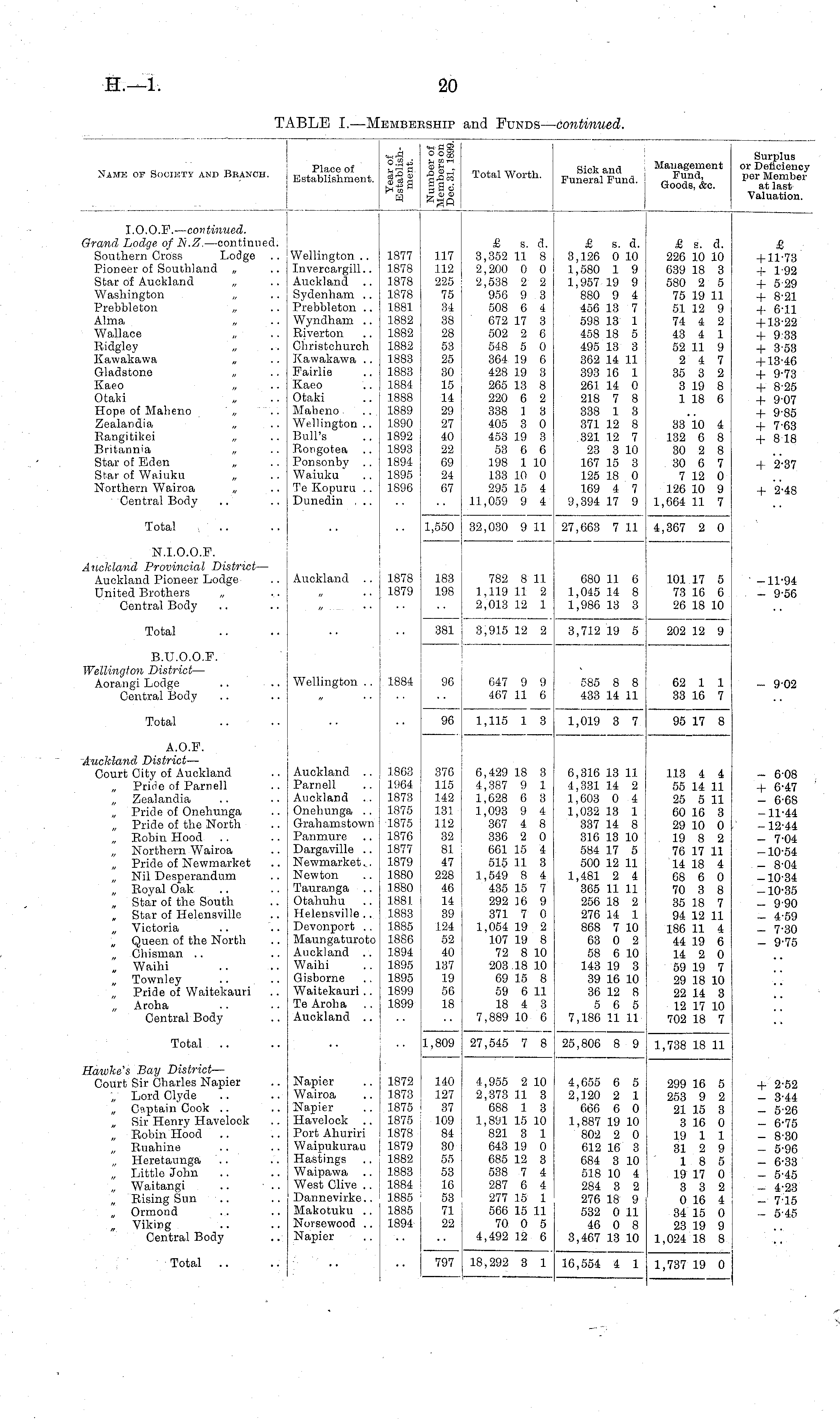 Name of Society and Branch. Place of Establishment. h-b a t3 * a c. p cm a s> a og rH CO rH O r< q a CO £2£ Riclc and Management Total Worth. G^c . Surplus or Deficiency per Member at last Valuation. I.O.O.F.— continued. Grand Lodge of N.Z. —continued. Southern Cross Lodge .. Pioneer of Southland „ Star of Auckland Washington „ Prebbleton - „ Alma „ Wallace Ridgley Kawakawa „ Gladstone Kaeo „ Otaki Hope of Maheno ' „ Zealandia Rangitikei „ Britannia „ Star of Eden Star of Waiuku „ Northern Wairoa Central Body Wellington .. Invercargill.. Auckland .. Sydenham .. Prebbleton .. Wyndham .. Riverton Christchureh Kawakawa .. Fairlie Kaeo Otaki Maheno Wellington .. Bull's Rongotea Ponsonby .. Waiuku Te Kopuru .. Dunedin 1877 1878 1878 1878 1881 1882 1882 1882 1883 1883 1884 1888 1889 1890 1892 1893 1894 1895 1896 117 112 225 75 34 38 28 53 25 30 15 14 29 27 40 22 69 24 67 £ s. d. 3,352 11 8 2,200 0 0 2,538 2 2 956 9 3 508 6 4 672 17 3 502 2 6 548 5 0 364 19 6 428 19 3 265 13 8 220 6 2 338 1 8 405 3 0 453 19 3 53 6 6 198 1 10 133 10 0 295 15 4 11,059 9 4 £ s. d. 3,126 0 10 1,580 1 9 1,957 19 9 880 9 4 456 13 7 598 13 1 458 18 5 495 13 3 362 14 11 393 16 1 261 14 0 218 7 8 338 1 3 371 12 8 321 12 7 23 3 10 167 15 3 125 18 0 169 4 7 9,394 17 9 £ s. d. 226 10 10 639 18 3 580 2 5 75 19 11 51 12 9 74 4 2 43 4 1 52 11 9 2 4 7 35 3 2 3 19 8 1 18 6 £ + 11-73 + 1-92 + 529 + 8-21 + 6-11 + 13-22 + 9:33 + 3-53 + 13-46 + 9-73 + 8-25 + 9-07 + 9-85 + 7-63 + 8 18 33 10 4 132 6 8 30 2 8 30 6 7 7 12 0 126 10 9 1,664 11 7 + 2-37 + 2-48 Total 1,550 32,030 9 11 27,663 7 11 4,367 2 0 N.I.O.O.F. Auckland Provincial District — Auckland Pioneer Lodge United Brothers Central Body Auckland 1878 1879 183 198 782 8 11 1,119 11 2 2,013 12 1 680 11 6 1,045 14 8 1,986 13 3 10117 5 73 16 6 26 18 10 -11-94 - 9-56 Total 381 3,915 12 2 3,712 19 5 202 12 9 B.U.O.O.F. Wellington District — Aorangi Lodge Central Body Wellington .. 585 8 8 433 14 11 - 9-02 1884 96 647 9 9 467 11 6 62 1 1 33 16 7 Total 96 1,115 1 3 1,019 3 7 95 17 8 A.O.F. Auckland District — Court City of Auckland „ Pride of Parnell „ Zealandia „ Pride of Onehunga Pride of the North Robin Hood Northern Wairoa „ Pride of Newmarket „ Nil Desperandum „ Royal Oak „ Star of the South Star of Helensville „ Victoria Queen of the North „ Chisman .. , Waihi Towniey Pride of Waitekauri „ Aroha Central Body Auckland .. Parnell Auckland Onehunga .. Grahamstown Panmure Dargaville .. Newmarket.. Newton Tauranga Otahuhu Helensville .. Devonport .. Maungaturoto Auckland .. Waihi Gisborne Waitekauri .. Te Aroha Auckland .. 1863 1964 1873 1875 1875 1876 1877 1879 1880 1880 1881 1883 1885 1886 1894 1895 1895 1899 1899 376 115 142 131 112 32 81 47 228 46 14 39 124 52 40 137 19 56 18 6,429 18 3 4,387 9 1 1,628 6 3 1,093 9 4 367 4 8 336 2 0 661 15 4 515 11 3 1,549 8 4 435 15 7 292 16 9 371 7 0 1,054 19 2 107 19 8 72 8 10 203.18 10 69 15 8 59 6 11 18 4 3 7,889 10 6 6,316 13 11 4,331 14 2 1,603 0 4 1,032 13 1 337 14 8 316 13 10 584 17 5 500 12 11 1,481 2 4 365 11 11 256 18 2 276 14 1 868 7 10 63 0 2 58 6 10 143 19 3 39 16 10 36 12 8 5 6 5 7,186 11 11 113 4 4 55 14 11 25 5 11 60 16 3 29 10 0 19 8 2 76 17 11 14 18 4 68 6 0 70 3 8 35 18 7 94 12 11 186 11 4 44 19 6 14 2 0 59 19 7 29 18 10 22 14 3 12 17 10 702 18 7 - 6-08 + 6-47 - 6-68 -11-44 -12-44 - 7-04 -10-54 - 8-04 -10-34 -10-35 - 9-90 - 4-59 - 7-30 - 9-75 Total 1,809 27,545 7 8 25,806 8 9 1,738 18 11 Hawke's Bay District — Court Sir Charles Napier „ Lord Clyde „ Captain Cook Sir Henry Havelock Robin Hood „ Ruahine Heretaunga '.. „ Little John „ Waitangi .. - .. Rising Sun „ Ormond Viking Central Body Napier Wairoa Napier Havelock Port Ahuriri Waipukurau Hastings Waipawa West Clive .. Dannevirke.. Makotuku .. Norsewood .. Napier 1872 1873 1875 1875 1878 1879 1882 1883 1884 1885 1885 1894 140 127 37 109 84 30 55 53 16 53 71 22 4,955 2 10 2,373 11 3 688 1 3 1,891 15 10 821 3 1 643 19 0 685 12 3 538 7 4 287 6 4 277 15 1 566 15 11 70 0 5 4,492 12 6 4,655 6 5 2,120 2 1 666 6 0 1,887 19 10 802 2 0 612 16 3 684 3 10 518 10 4 284 3 2 276 18 9 532 0 11 46 0 8 3,467 13 10 299 16 5 253 9 2 21 15 3 3 16 0 19 1 1 31 2 9 18 5 19 17 0 3 3 2 0 16 4 34 15 0 23 19 9 1,024 18 8 + 2-52 - 3-44 - 5-26 - 6-75 - 8-30 - 5-96 - 6-33 - 5-45 - 4-23 - 7-15 - 5-45 Total .. 797 18,292 3 1 16,554 4 1 1,737 19 0