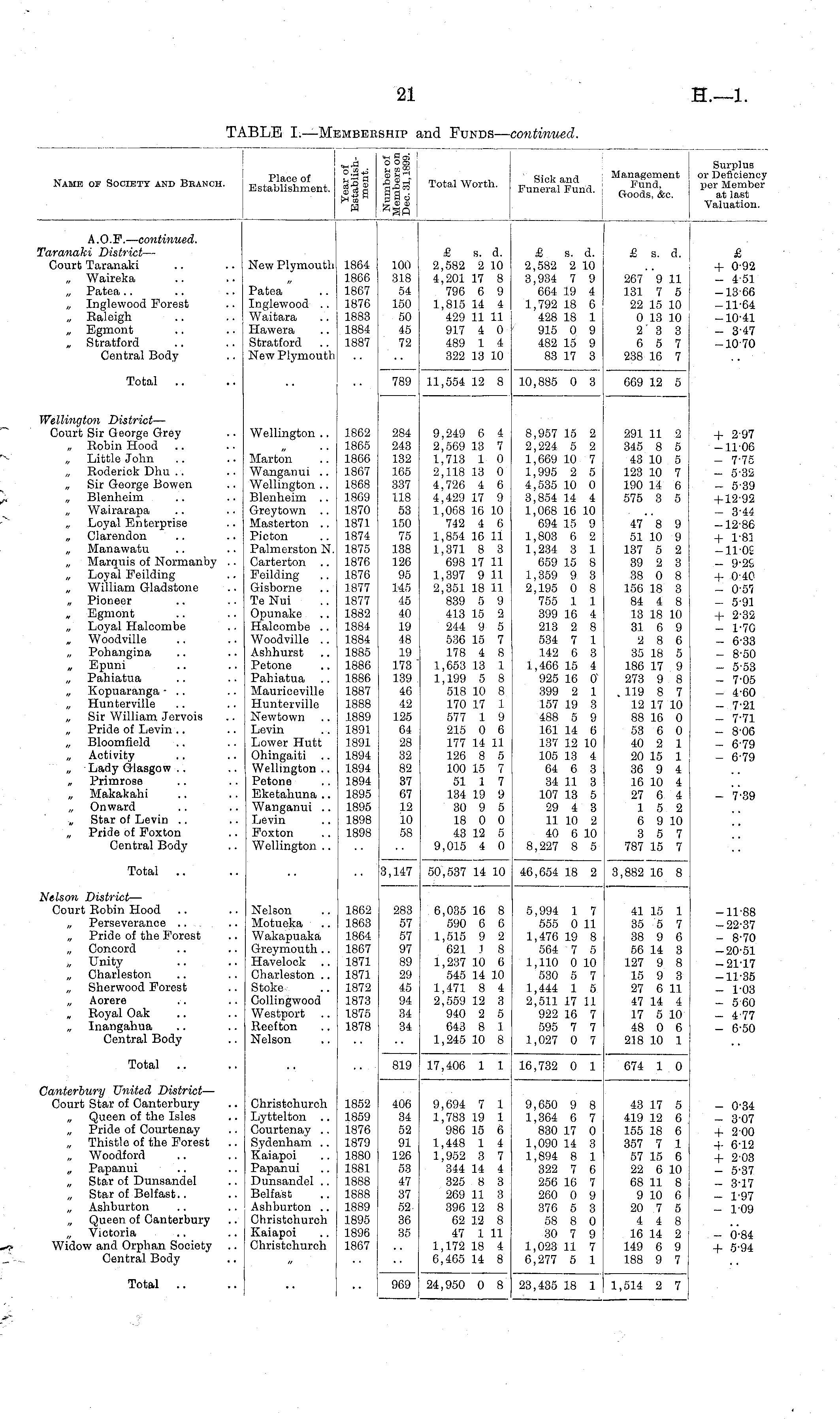 Name of Society and Branch. •hhB Place of a Establishment. S§1s 2 '-B Serf Sh CO CO • i ri . cj, v . Management •2J S Total Worth. Fu^ a^ n d : Fund - ISo unerai j. una. G- 00 ds, efce. £ a a A %a Surplus or Deficiency per Member at last Valuation. A.O.F.— continued. Taranaki District — Court Taranaki „ Waireka „ Patea.. „ Inglewood Forest „ Raleigh „ Egmont Stratford Central Body New Plymouth Patea Inglewood .. Waitara Hawera Stratford New Plymouth 1804 1866 1867 1876 1883 1884 1887 100 318 54 150 50 45 72 £ s. d. 2,582 2 10 4,201 17 8 796 6 9 1,815 14 4 429 11 11 917 4 0 489 1 4 322 13 10 £ s. d. 2,582 2 10 3,934 7 9 664 19 4 1,792 18 6 428 18 1 915 0 9 482 15 9 83 17 3 £ s. d. 267 9 11 131 7 5 22 15 10 0 13 10 2 3 3 6 5 7 238 16 7 £ + 0-92 - 4-51 -13-66 -11-64 -10-41 - 3-47 -10-70 Total 789 11,554 12 8 10,885 0 3 069 12 5 Wellington District — Court Sir George Grey „ Robin Hood Little John „ Roderick Dhu .. „ Sir George Bowen „ Blenheim „ Wairarapa Loyal Enterprise „ Clarendon .. „ Manawatu Marquis of Normanby .. „ Loyal Feilding William Gladstone „ Pioneer Egmont „ Loyal Halcombe Woodville Pohangina „ Epuni Pahiatua Kopuaranga .. „ Hunterville „ Sir William Jervois „ Pride of Levin .. „ Bloomfield „ Activity Lady Glasgow .. „ Primrose „ Makakahi Onward „ Star of Levin .. „ Pride of Foxton Central Body Wellington .. Marton Wanganui .. Wellington .. Blenheim .. Greytown .. Masterton .. Picton Palmerston N. Carterton Feilding Gisborne Te Nui Opunake Halcombe .. Woodville .. Ashhurst Petone Pahiatua Mauriceville Hunterville Newtown Levin Lower Hutt Ohingaiti .. Wellington .. Petone Eketahuna .. Wanganui .. Levin Foxton Wellington .. 1862 1865 1866 1867 1868 1869 1870 1871 1874 1875 1876 1876 1877 1877 1882 1884 1884 1885 1886 1886 1887 1888 1889 1891 1891 1894 1894 1894 1895 1895 1898 1898 284 243 132 165 337 118 53 150 75 138 126 95 1-45 45 40 19 48 19 173 " 139 46 42 125 64 28 32 82 37 67 12 10 58 9,249 6 4 2,569 13 7 1,713 1 0 2,118 13 0 4,726 4 6 4,429 17 9 1,068 16 10 742 4 6 1,854 16 11 1,371 8 3 698 17 11 1,397 9 11 2,351 18 11 839 5 9 413 15 2 244 9 5 536 15 7 178 4 8 1,653 13 1 1,199 5 8 518 10 8 170 17 1 577 1 9 215 0 6 177 14 11 126 8 5 100 15 7 51 1 7 134 19 9 30 9 5 18 0 0 43 12 5 9,015 4 0 8,957 15 2 2,224 5 2 1,669 10 7 1,995 2 5 4,535 10 0 3,854 14 4 1,068 16 10 694 15 9 1,803 6 2 1,234 3 1 659 15 8 1,359 9 3 2,195 0 8 755 1 1 399 16 4 213 2 8 534 7 1 142 6 3 1,466 15 4 925 16 0" 399 2 1 157 19 3 488 5 9 161 14 6 137 12 10 105 13 4 64 6 3 34 11 3 107 13 5 29 4 3 11 10 2 40 6 10 8,227 8 5 291 11 2 345 8 5 43 10 5 123 10 7 190 14 6 575 3 5 47 8 9 51 10 9 137 5 2 39 2 3 38 0 8 156 18 3 84 4 8 13 18 10 31 6 9 2 8 6 35 18 5 186 17 9 273 9 8 .119 8 7 12 17 10 88 16 0 53 6 0 40 2 1 20 15 1 36 9 4 16 10 4 27 6 4 15 2 6 9 10 3 5 7 787 15 7 + 2-97 -11-06 - 7-75 - 5-32 - 5-39 + 12-92 - 3-44 -12-86 + 1-81 -11-09 - 9-26 + 0-4C - 0-57 - 5-91 + 2-32 - 1-70 - 6-33 - 8-50 - 5-53 - 7-05 - 4-60 - 7-21 - 7-71 - 8-06 - 6-79 - 6-79 - 7-39 Total 13,147 50,537 14 10 46,654 18 2 3,882 16 8 Nelson District — Court Robin Hood „ Perseverance .. „ Pride of the Forest Concord Unity „ Charleston Sherwood Forest „ Aorere Royal Oak Inangahua Central Body Nelson Motueka Wakapuaka Greymouth .. Havelock Charleston .. Stoke Collingwood Westport Reefton Nelson 1862 1863 1864 1867 1871 1871 1872 1873 1875 1878 283 57 57 97 89 29 45 94 34 34 6,035 16 8 590 6 6 1,515 9 2 621 1 8 1,237 10 6 545 14 10 1,471 8 4 2,559 12 3 940 2 5 643 8 1 1,245 10 8 5,994 1 7 555 0 11 1,476 19 8 564 7 5 1,110 0 10 530 5 7 1,444 1 5 2,511 17 11 922 16 7 595 7 7 1,027 0 7 41 15 1 35 5 7 38 9 6 56 14 3 127 9 8 15 9 3 27 6 11 47 14 4 17 5 10 48 0 6 218 10 1 -11-88 -22-37 - 8-70 -20-51 -21-17 -11-35 - 1-03 - 5-60 - 4-77 - 6-50 Total 819 17,406 1 1 16,732 0 1 674 1 0 Canterbury United District — Court Star of Canterbury „ Queen of the Isles „ Pride of Courtenay „ Thistle of the Forest Woodford „ Papanui Star of Dunsandel Star of Belfast.. „ Ashburton „ Queen of Canterbury Victoria Widow and Orphan Society Central Body Christchureh Lyttelton Courtenay .. Sydenham .. Kaiapoi Papanui Dunsandel .. Belfast Ashburton .. Christchureh Kaiapoi Christchureh 1852 1859 1876 1879 1880 188.1. 1888 1888 1889 1895 1896 1867 406 34 52 91 126 53 47 37 5236 35 9,694 7 1 1,783 19 1 986 15 6 1,448 1 4 1,952 3 7 344 14 4 325 8 3 269 11 3 396 12 8 62 12 8 47 1 11 1,172 18 4 6,465 14 8 9,650 9 8 1,364 6 7 830 17 0 1,090 14 3 1,894 8 1 322 7 6 256 16 7 260 0 9 376 5 3 53 8 0 30 7 9 1,023 11 7 6,277 5 1 43 17 5 419 12 6 ; 155 18 6 357 7 1 57 15 6 22 6 10 I 68 11 8 ! 9 10 6 20 7 5 4 4 8 16 14 2 149 6 9 188 9 7 - 0-34 - 3-07 + 200 + 6-12 + 2-03 - 5-37 - 3-17 - 1-97 - 109 - 0-84 + 5-94 Total 969 24,950 0 8 23,435 18 1 1,514 2 7