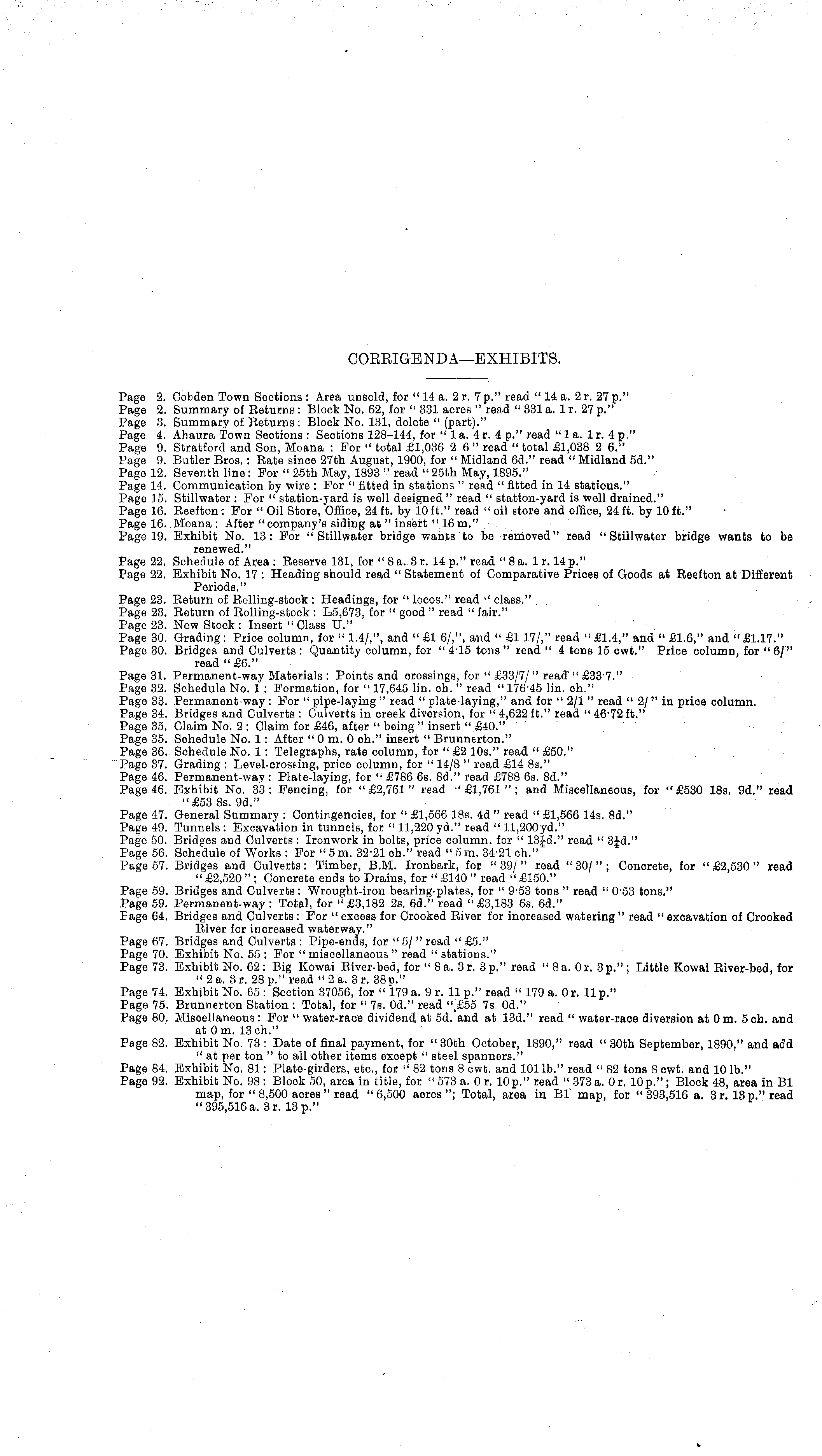 Page 2. Cobden Town Sections: Area unsold, for "14 a. 2r. 7 p." read "14 a. 2r. 27 p." Page 2. Summary of Returns: Block No. 62, for " 331 acres " read "331 a. lr. 27p." Page 3. Summary of Returns : Block No. 131, delete " (part)." Page 4. Ahaura Town Sections : Sections 128-144, for "1 a. 4r. 4 p." read "la. lr. 4 p." Page 9. Stratford and Son, Moana : For " total £1,036 2 6" read " total £1,038 2 6." Page 9. Butler Bros. : Rate since 27th August, 1900, for " Midland 6d." read " Midland 5a." Page 12. Seventh line : For " 25th May, 1893 " read " 25th May, 1895." Page 14. Communication by wire : For " fitted in stations " read " fitted in 14 stations." Page 15. Stillwater : For " station-yard is well designed " read " station-yard is well drained." Page 16. Reefton : For " Oil Store, Office, 24 ft. by 10 ft." read '' oil store and office, 24 ft. by 10 ft." Page 16. Moana : After "company's siding at " insert " 16m." Page 19. Exhibit No. 13: For "Stillwater bridge wants to be removed" read "Stillwater bridge wants to be renewed." Page 22. Schedule of Area : Reserve 131, for "8 a. 3r. 14 p." read " Ba. 1 r. 14 p." Page 22. Exhibit No. 17 : Heading should read " Statement of Comparative Prices of Goods at Reefton at Different Periods." Page 23. Return of Rolling-stock : Headings, for " locos." read " class." Page 23. Return of Rolling-stock : L 5.673, for " good " read " fair." Page 23. New Stock : Insert "Class U." Page 30. Grading : Price column, for " 1.4/,", and " £1 6/,", and " £1 17/," read " £1.4," and " £1.6," and " £1.17." Page 30. Bridges and Culverts : Quantity column, for " 4-15 tons " read" 4 tons 15 cwt." Price column, for " 6/" read "£6." Page 31. Permanent-way Materials : Points and orossings, for " £33/7/" read'" £33-7." Page 32. Schedule No. 1 : Formation, for " 17,645 lin. cb. " read " 17645 lin. eh." Page 33. Permanent-way : For " pipe-laying " read " plate-laying," and for " 2/1 " read " 2/ " in prioe column. Page 34. Bridges and Culverts : Culverts in creek diversion, for "4,622 ft." read "46-72 ft." Page 35. Claim No. 2 : Claim for £46, after " being " insert ".£40." Page 35. Schedule No. 1: After "om. 0 eh." insert " Brunnerton." Page 36. Schedule No. 1: Telegraphs, rate column, for "£2 10s." read " £50." Page 37. Grading : Level-crossing, price column, for " 14/8 " read £14 Bs." Page 46. Permanent-way : Plate-laying, for " £786 6s. Bd." read £788 6s. Bd." Page 46. Exhibit No. 38: Fencing, for "£2,761" read -'£1,761"; and Miscellaneous, for "£530 18s. 9d." read "£53 Bs. 9d." Page 47. General Summary : Contingencies, for " £1,566 18s. 4d " read " £1,566 14s. Bd." Page 49. Tunnels : Excavation in tunnels, for " 11,220 yd." read " 11,200 yd." Page 50. Bridges and Culverts : Ironwork in bolts, price column, for " 13Jd." read " 3Jd." Page 56. Schedule of Works : For "5 m. 32-21 eh." read " sm. 34-21 eh." Page 57. Bridges and Culverts: Timber, B.M. Ironbark, for " 39/ " read " 30/ " ; Concrete, for " £2,530 " read " £2,520 " ; Concrete ends to Drains, for " £140 " read " £150." Page 59. Bridges and Culverts : Wrought-iron bearing-plates, for " 9-53 tons " read " 0-53 tons." Page 59. Permanent-way : Total, for "£3,182 2s. 6d." read "£3,183 6s. 6d." Page 64. Bridges and Culverts : For " excess for Crooked River for increased watering " read " excavation of Crooked River for increased waterway." Page 67. Bridges and Culverts : Pipe-ends, for "5/ " read " £5." Page 70. Exhibit No. 55 : For " miscellaneous " read " stations." Page 73. Exhibit No. 62 : Big Kowai River-bed, for " Ba. 3r. 3p." read " Ba. Or. 3p." ; Little Kowai River-bed, for "2 a. 3r. 28 p." read "2 a. 3r. 38p." Page 74. Exhibit No. 65: Section 37056, for "179 a. 9 r. lip." read " 179 a. Or. lip." Page 75. Brunnerton Station : Total, for " 7s. od." read " b £ss 7s. od." Page 80. Miscellaneous: For " water-race dividend at sd.'and at 13d." read " water-race diversion at om. sch. and at 0 m. 13 eh." Page 82. Exhibit No. 73 : Date of final payment, for " 30th October, 1890," read " 30th September, 1890," and add " at per ton " to all other items except " steel spanners." Page 84. Exhibit No. 81: Plate-girders, etc., for "82 tons 8 cwt. and 101 lb." read "82 tons 8 cwt. and 10 lb." Page 92. Exhibit No. 98 : Block 50, area in title, for " 573 a. 0 r. 10p." read " 373 a. Or. 10p." ; Block 48, area in Bl map, for " 8,500 acres " read "6,500 aores "; Total, area in Bl map, for "393,516 a. 3r. 13 p."read "395,516 a. 3r. 13 p."