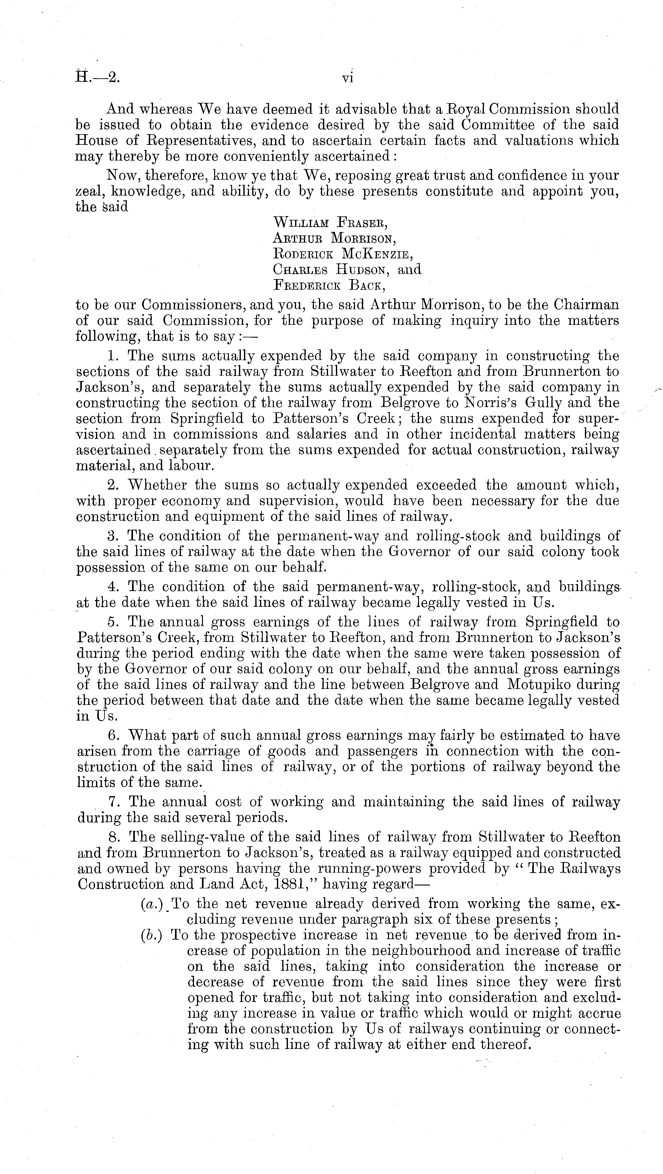 And whereas We have deemed it advisable that a Eoyal Commission should be issued to obtain the evidence desired by the said Committee of the said House of Eepresentatives, and to ascertain certain facts and valuations which may thereby be more conveniently ascertained : Now, therefore, know ye that We, reposing great trust and confidence in your zeal, knowledge, and ability, do by these presents constitute and appoint you, the said William Fbasee, Aethue Mobbison, EODEEICK McKENZIE, Chaeles Hudson, and Feedeeick Back, to be our Commissioners, and you, the said Arthur Morrison, to be the Chairman of our said Commission, for the purpose of making inquiry into the matters following, that is to say : — 1. The sums actually expended by the said company in constructing the sections of the said railway from Stillwater to Reefton and from Brunnerton to Jackson's, and separately the sums actually expended by the said company in constructing the section of the railway from Belgrove to Norris's Gully and the section from Springfield to Patterson's Creek; the sums expended for supervision and in commissions and salaries and in other incidental matters being ascertained. separately from the sums expended for actual construction, railway material, and labour. 2. Whether the sums so actually expended exceeded the amount which, with proper economy and supervision, would have been necessary for the due construction and equipment of the said lines of railway. 3. The condition of the permanent-way and rolling-stock and buildings of the said lines of railway at the date when the Governor of our said colony took possession of the same on our behalf. 4. The condition of the said permanent-way, rolling-stock, and buildingsat the date when the said lines of railway became legally vested in Us. 5. The annual gross earnings of the lines of railway from Springfield to Patterson's Creek, from Stillwater to Reefton, and from Brunnerton to Jackson's during the period ending with the date when the same were taken possession of by the Governor of our said colony on our behalf, and the annual gross earnings of the said lines of railway and the line between Belgrove and Motupiko during the period between that date and the date when the same became legally vested in Us. 6. What part of such annual gross earnings may fairly be estimated to have arisen from the carriage of goods and passengers ih connection with the construction of the said lines of railway, or of the portions of railway beyond the limits of the same. 7. The annual cost of working and maintaining the said lines of railway during the said several periods. 8. The selling-value of the said lines of railway from Stillwater to Reefton and from Brunnerton to Jackson's, treated as a railway equipped and constructed and owned by persons having the running-powers provided by " The Railways Construction and Land Act, 1881," having regard— (a.) To the net revenue already derived from working the same, excluding revenue under paragraph six of these presents ; (b.) To the prospective increase in net revenue to be derived from increase of population in the neighbourhood and increase of traffic on the said lines, taking into consideration the increase or decrease of revenue from the said lines since they were first opened for traffic, but not taking into consideration and excluding any increase in value or traffic which would or might accrue from the construction by Us of railways continuing or connecting with such line of railway at either end thereof.