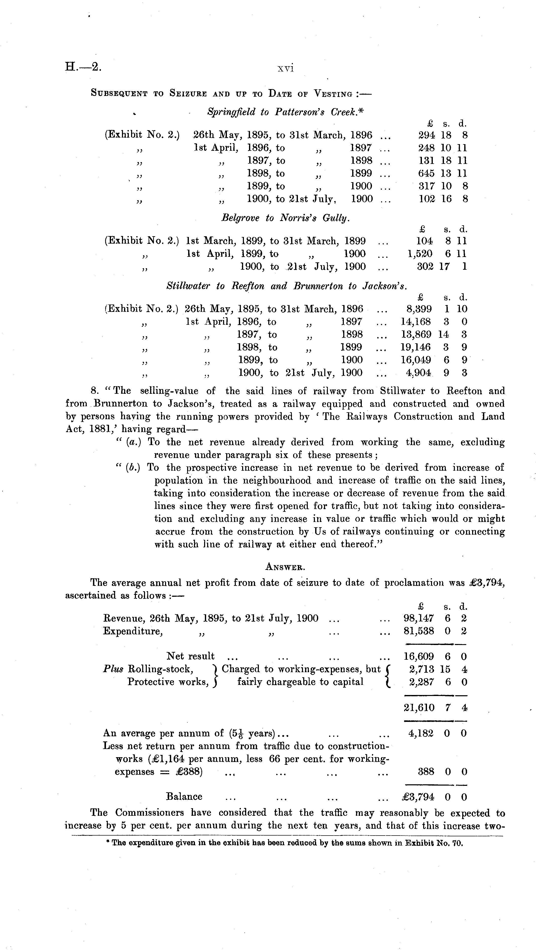 Subsequent to Seizure and up to Date of Vesting : — Springfield to Patterson's Creek* & s. d. (Exhibit No. 2.) 26th May, 1895, to 31st March, 1896 ... 294 18 8 Ist April, 1896, to „ 1897 ... 248 10 11 1897, to „ 1898 ... 131 18 11 1898, to „ 1899 ... 645 13 11 1899, to „ 1900 ... 317 10 8 „ „ 1900, to 21st July, 1900 ... 102 16 8 Belgrove to Norris's Gully. £ s. d. (Exhibit No. 2.) Ist March, 1899, to 31st March, 1899 ... 104 8 11 Ist April, 1899, to „ 1900 ... 1,520 611 1900, to 21st July, 1900 ... 302 17 1 Slillwater to Reefton and Brunnerton to Jackson's. £ s. d. (Exhibit No. 2.) 26th May, 1895, to 31st March, 1896 ... 8,399 110 Ist April, 1896, to „ 1897 ... 14,168 3 0 1897, to „ 1898 ... 13,869 14 3 1898, to „ 1899 ... 19,146 3 9 1899, to „ 1900 ... 16,049 6 9 1900, to 21st July, 1900 ... 4.904 9 3 8. "The selling-value of the said lines of railway from Stillwater to Reefton and from Brunnerton to Jackson's, treated as a railway equipped and constructed and owned by persons having the running powers provided by ' The Railways Construction and Land Act, 1881/ having regard— " (a.) To the net revenue already derived from working the same, excluding revenue under paragraph six of these presents; " (b.) To the prospective increase in net revenue to be derived from increase of population in the neighbourhood and increase of traffic on the said lines, taking into consideration the increase or decrease of revenue from the said lines since they were first opened for traffic, but not taking into consideration and excluding any increase in value or traffic which would or might accrue from the construction by Us of railways continuing or connecting with such line of railway at either end thereof." Answer. The average annual net profit from date of seizure to date of proclamation was ,£3,794, ascertained as follows : — £ s. d. Revenue, 26th May, 1895, to 21st July, 1900 ... ... 98,147 6 2 Expenditure, „ „ ... ... 81,538 0 2 Net result ... ... ... ... 16,609 6 0 Plus Rolling-stock, ") Charged to working-expenses, but f 2,713 15 4 Protective works, ) fairly chargeable to capital \ 2,287 6 0 21,610 7 4 An average per annum of years)... ... ... 4,182 0 0 Less net return per annum from traffic due to constructionworks (£1,164 per annum, less 66 per cent, for workingexpenses = £388) ... ... ... ... 388 0 0 Balance ... ... ... ... £3,794 0 0 The Commissioners have considered that the traffic may reasonably be expected to increase by 5 per cent, per annum during the next ten years, and that of this increase two-